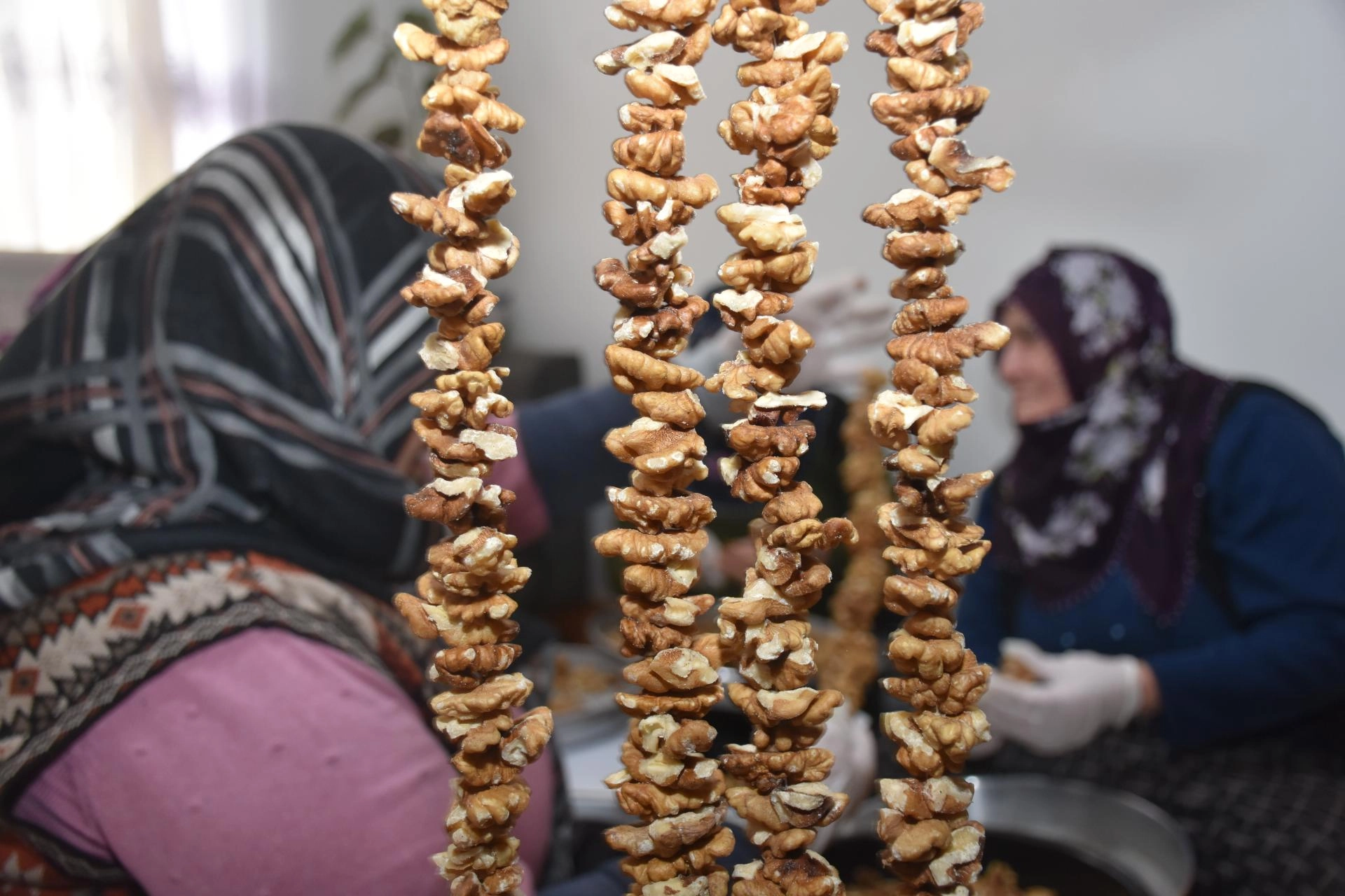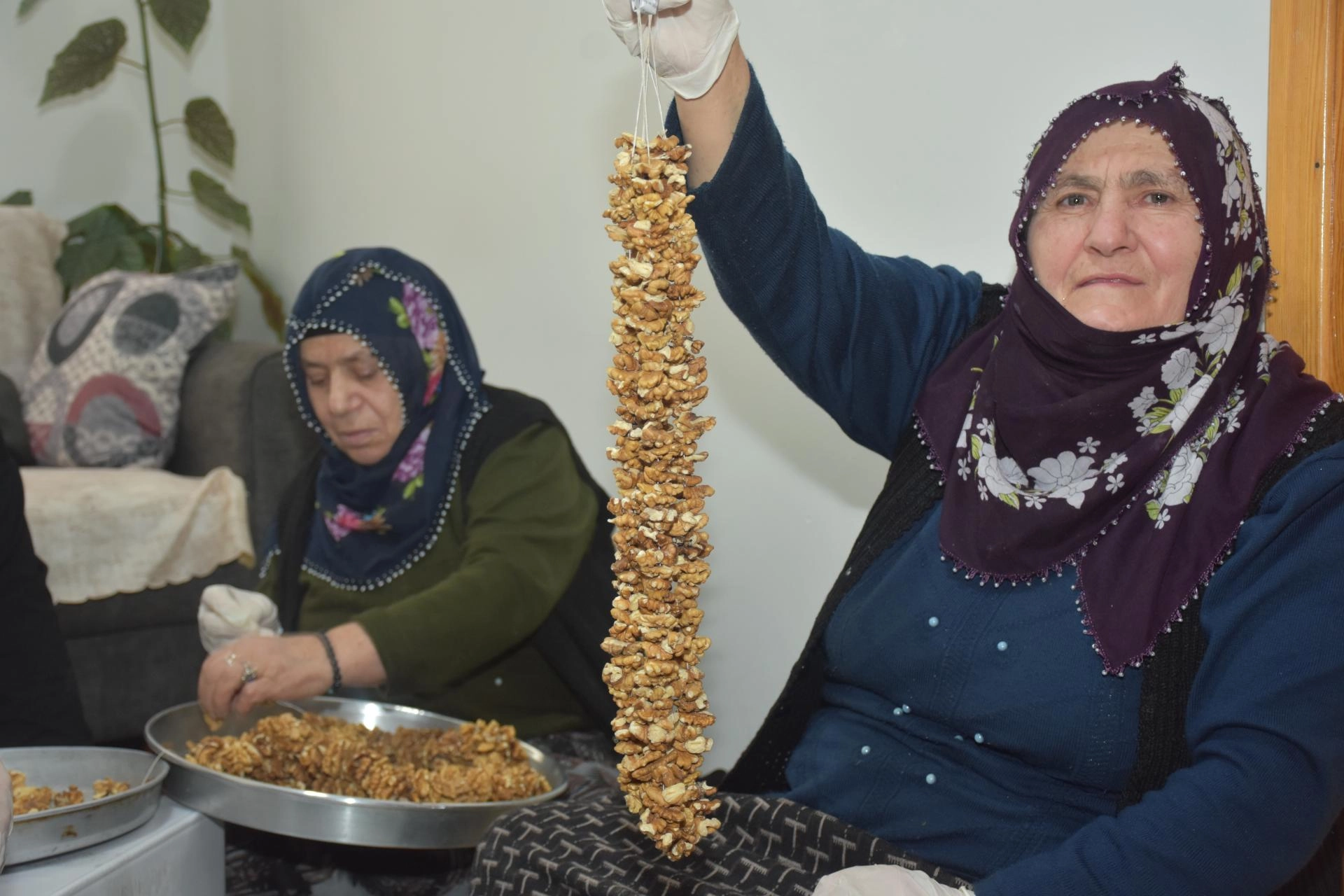 Kadınlar ipe ceviz dizerek hem ev ekonomisine katkı sağlıyor hem de zamanlarını değerlendiriyor