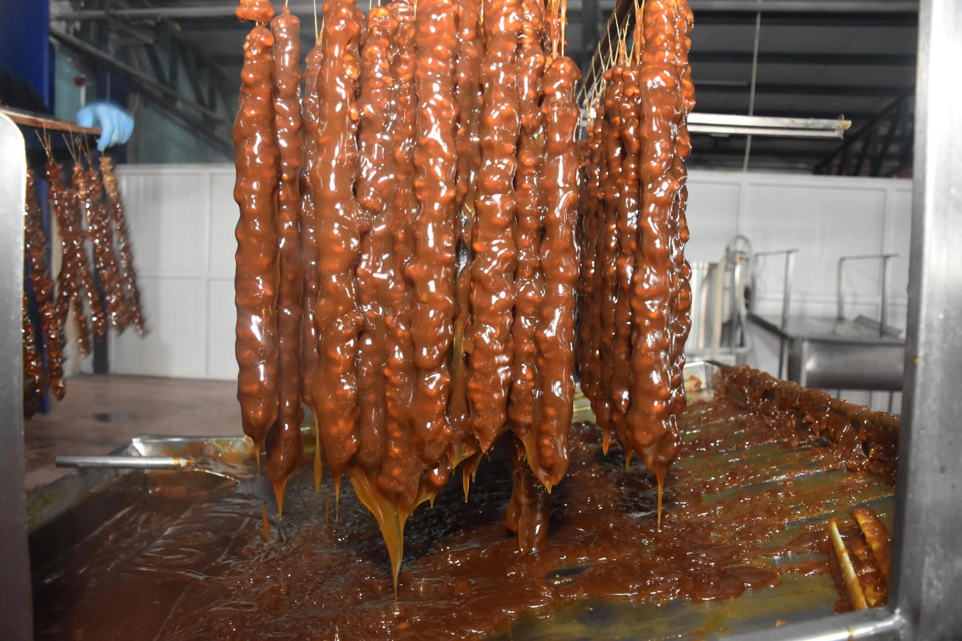 İpe dizilerek hazırlanan cevizler, fabrikalarda dut meyvesinin su ve şekerle kaynatılmasıyla elde edilen herleye batırılarak kömeye dönüştürülüyor ve satışa hazır hale getiriliyor.