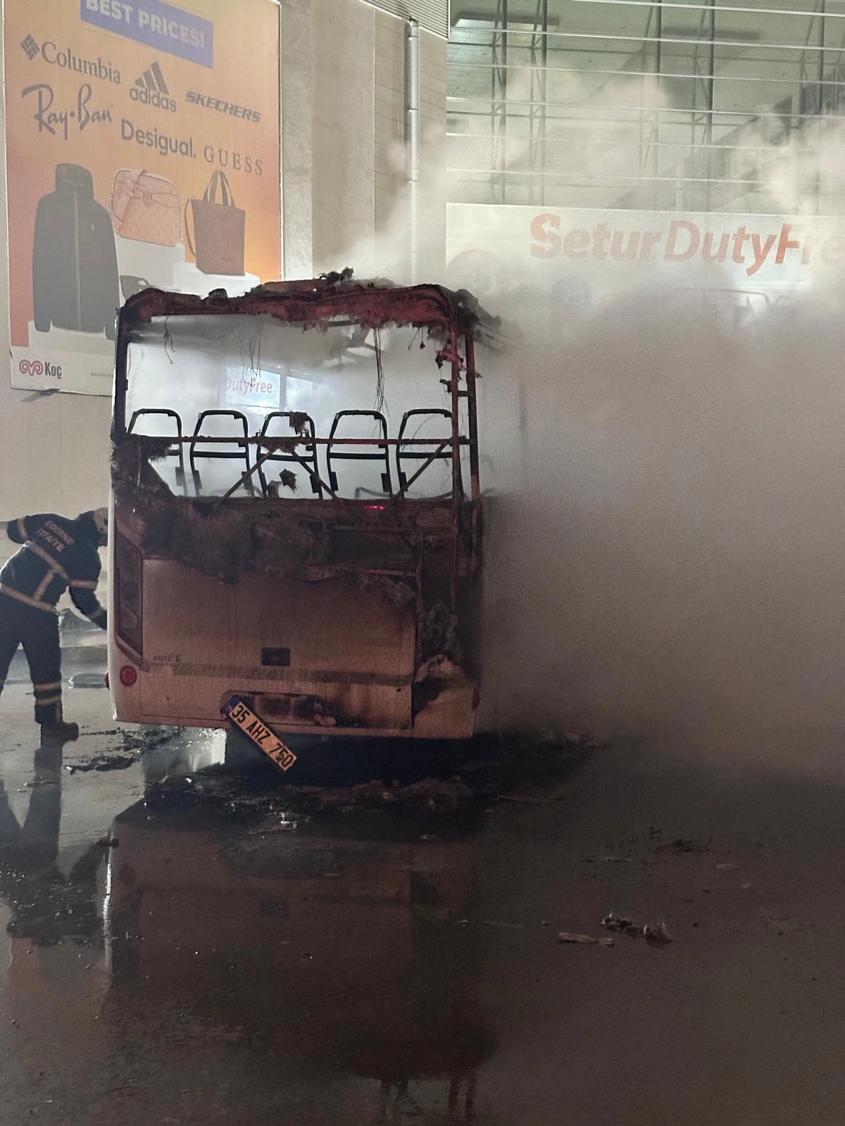 Gümrük sahası içinde park halinde bulunan 35 AHZ 750 plakalı yolcu otobüsü, araçta kimsenin bulunmadığı bir sırada, henüz belirlenemeyen nedenle yanmaya başladı.