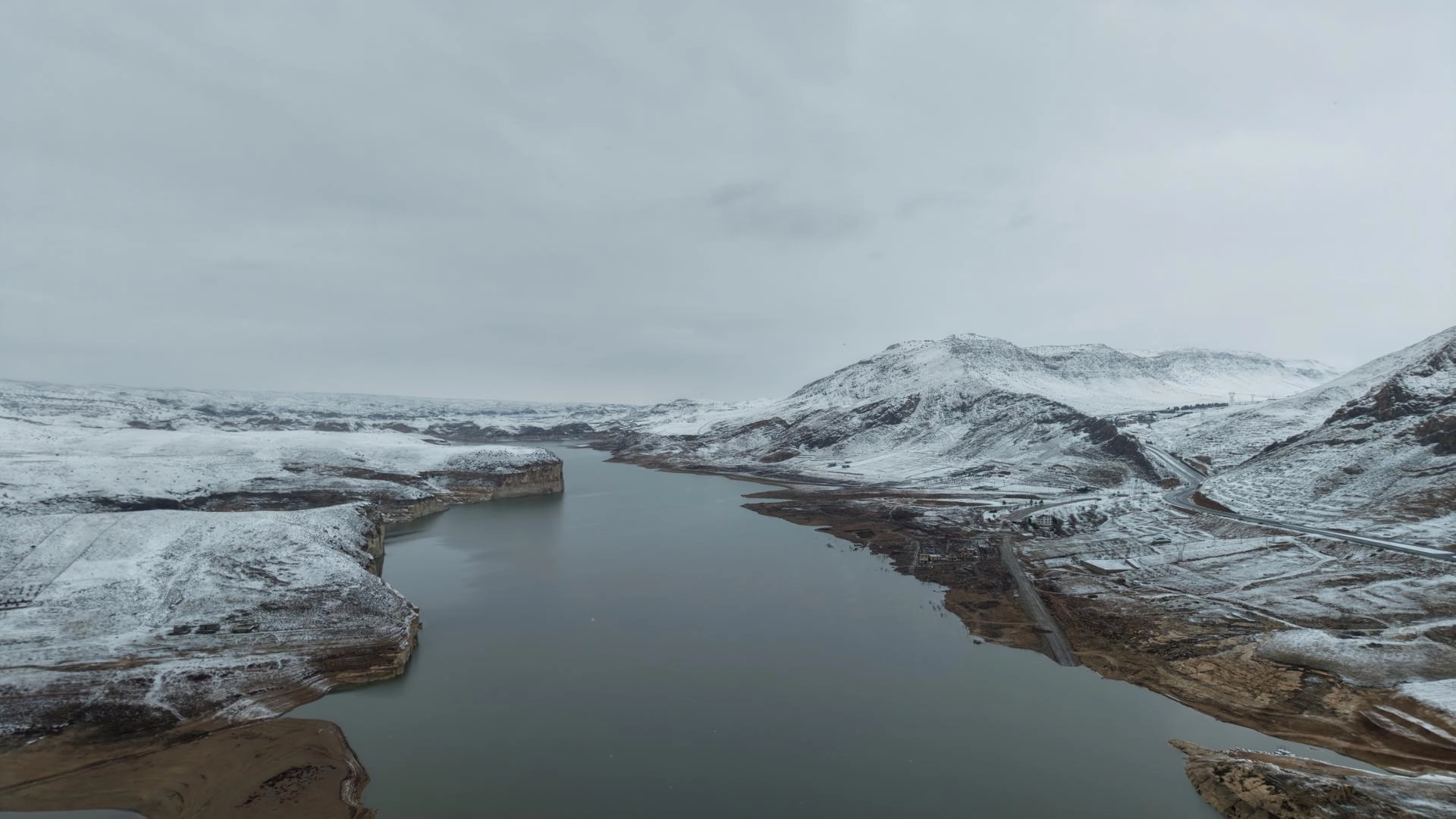 Kar yağışıyla beyaza bürünen Ilısu Barajı'nın çevresi dronla görüntülendi