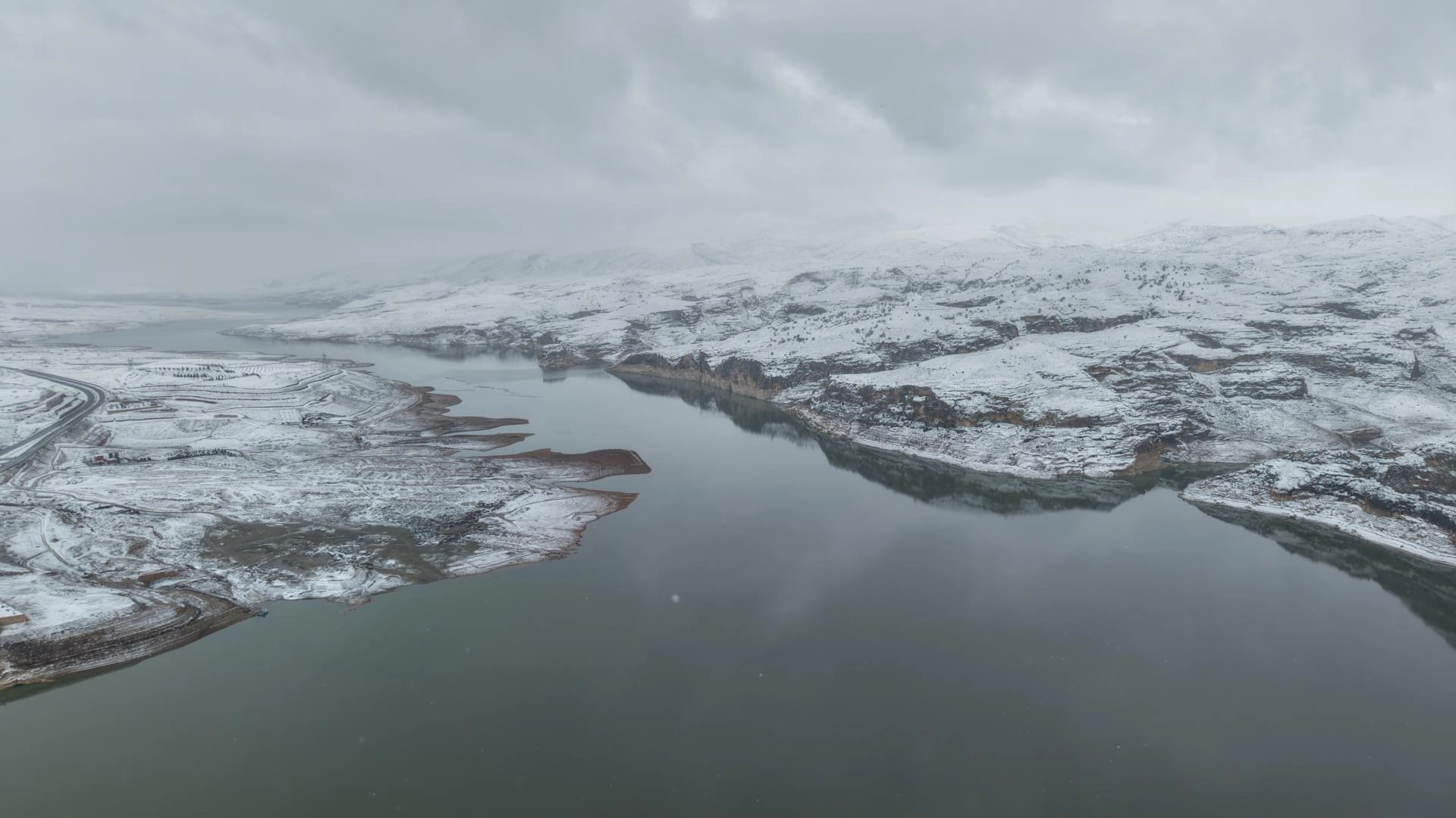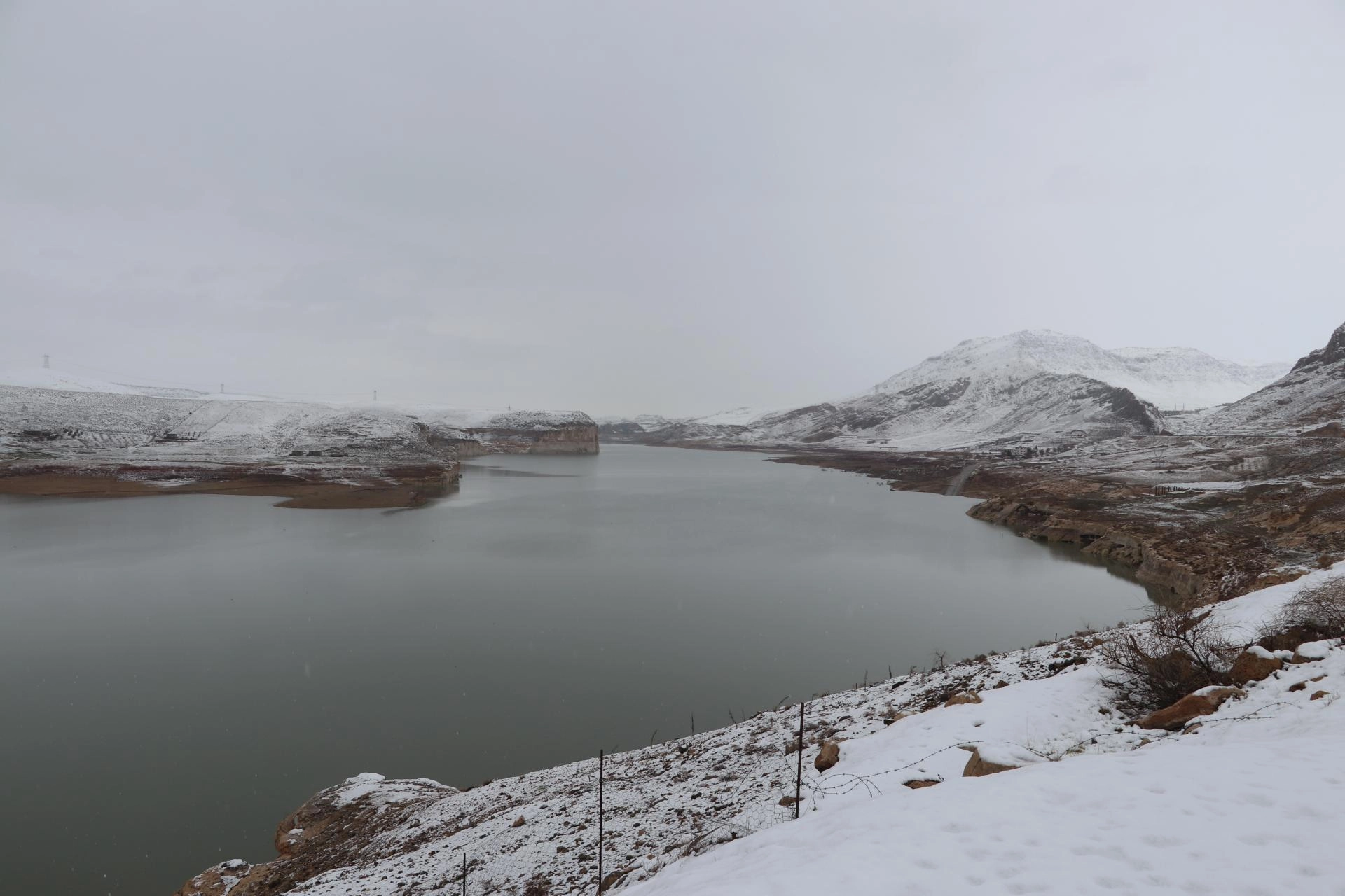 Baraj gölü ve karla kaplı çevresi dronla görüntülendi.