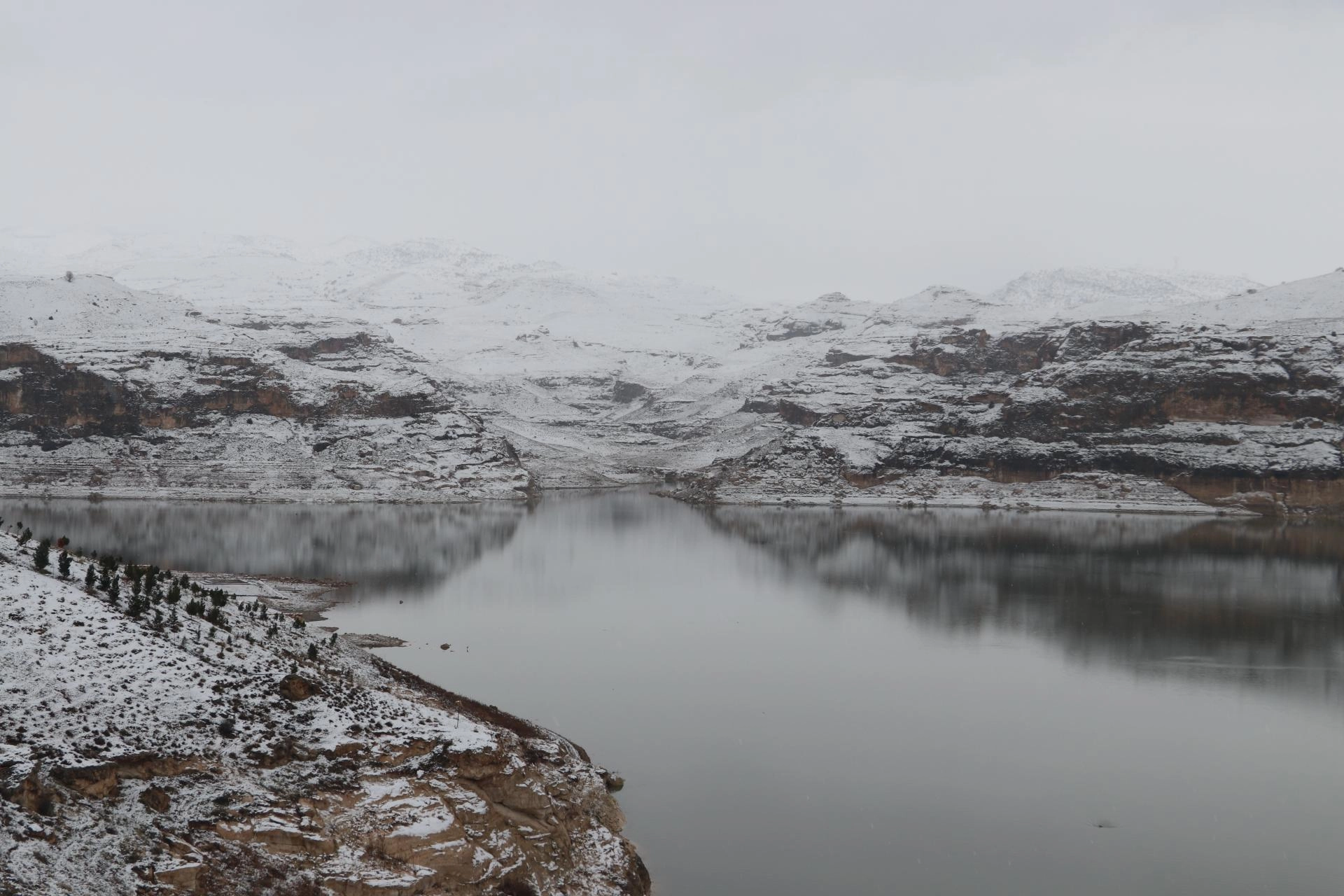 Dicle Nehri üzerinde kurulu barajın iki yakası, kar yağışı nedeniyle beyaza büründü.
