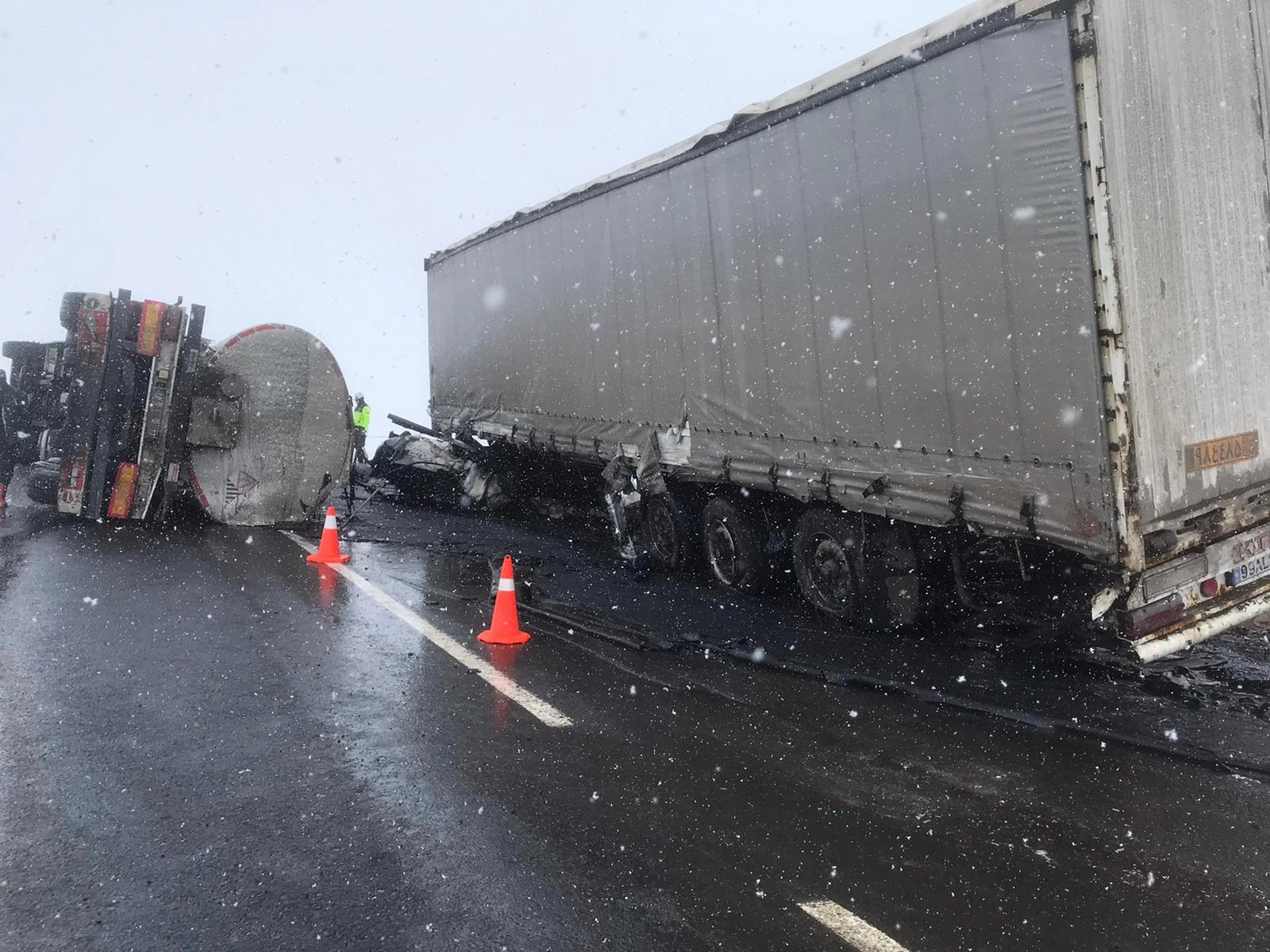 Kazada sürücüler yaralandı, tankerden dökülen zift nedeniyle kara yolu ulaşıma kapatıldı.