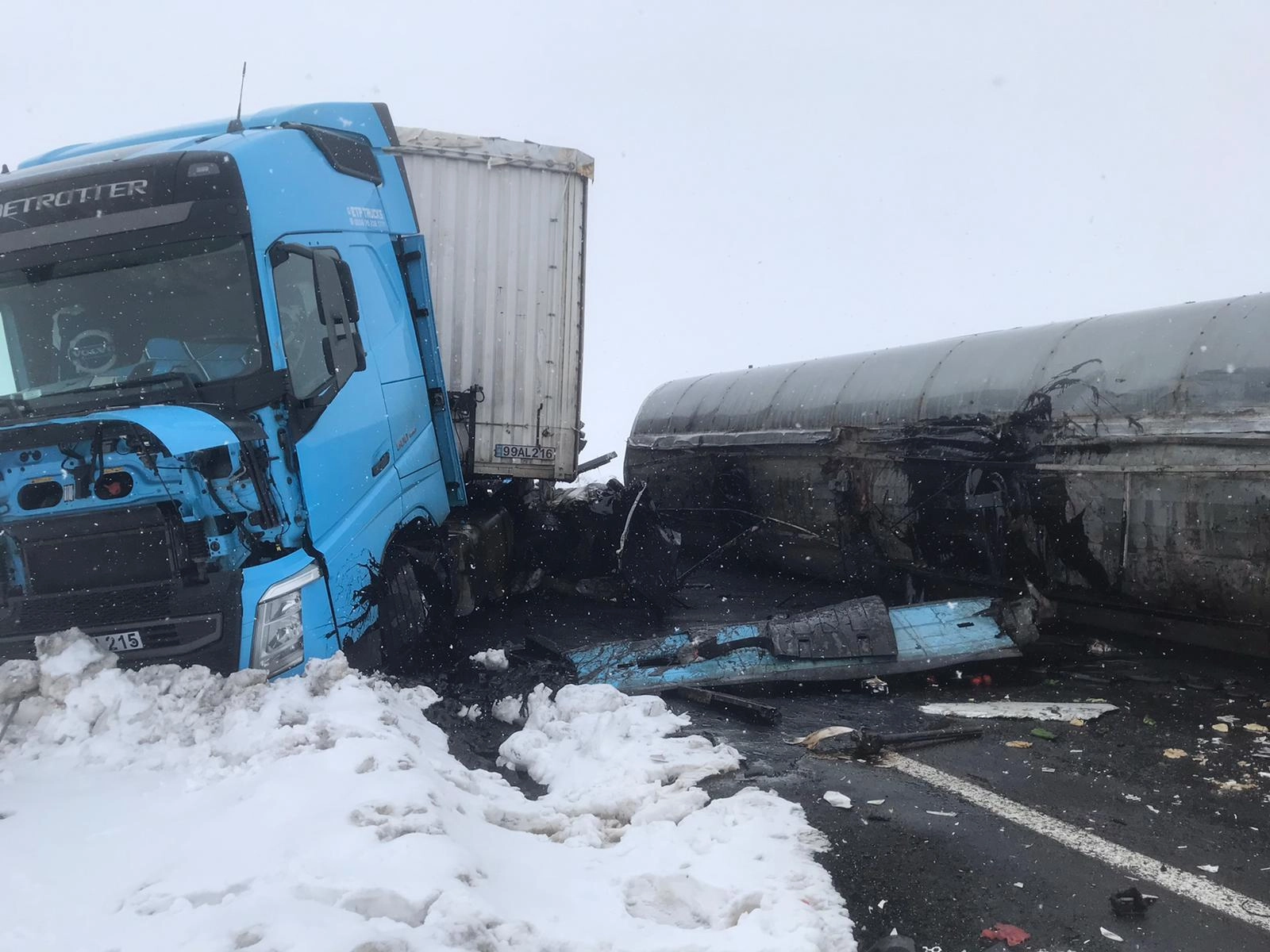 Kars'ta çarpışan tanker ve tırın sürücüleri yaralandı, yol ulaşıma kapatıldı