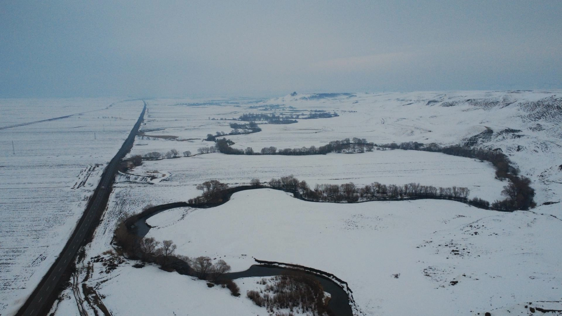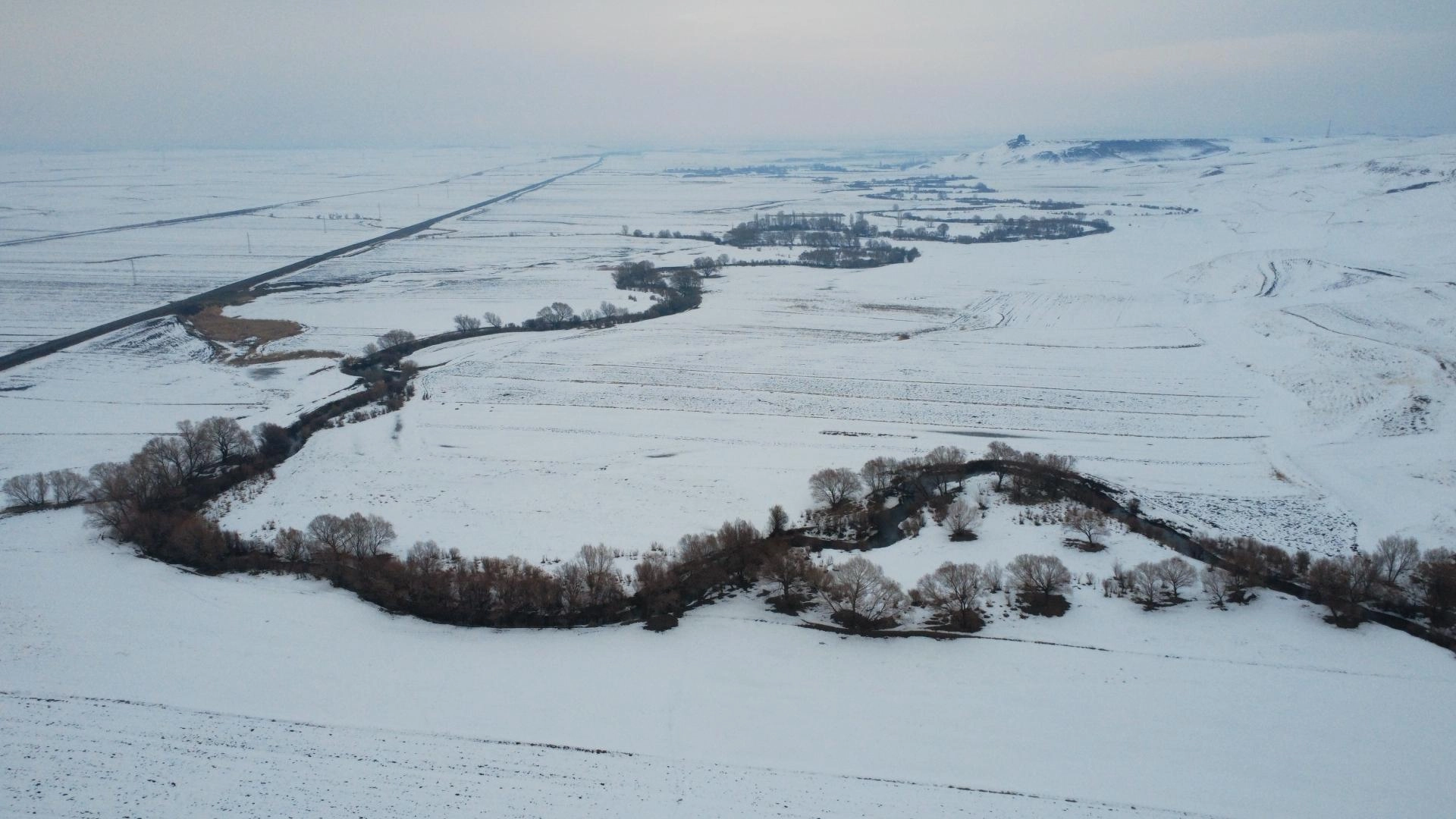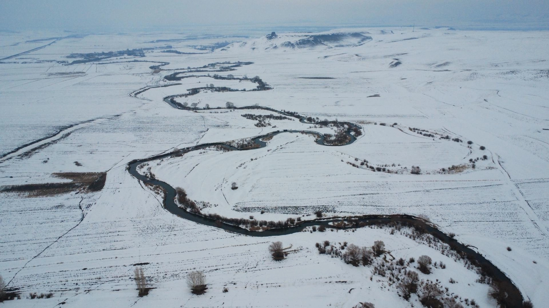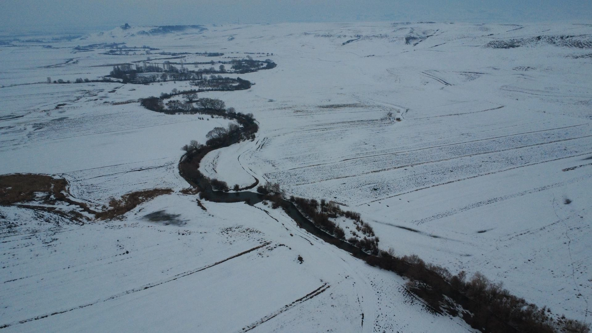 KARS (AA) - Türkiye-Ermenistan sınırında yer alan Kars'ın Akyaka ilçesinde karla beyaza bürünen menderesler, dronla görüntülendi.
