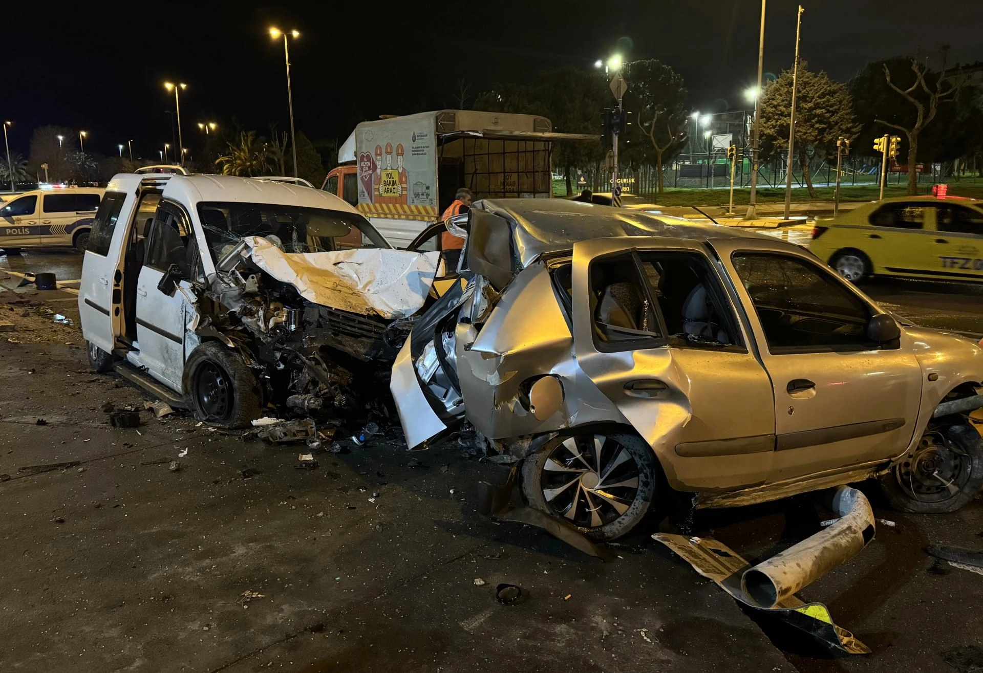 Çarpışmanın etkisiyle yaklaşık 20 metre sürüklenen araçlar, yol kenarındaki trafik ışıklarına çarptıktan sonra durdu.