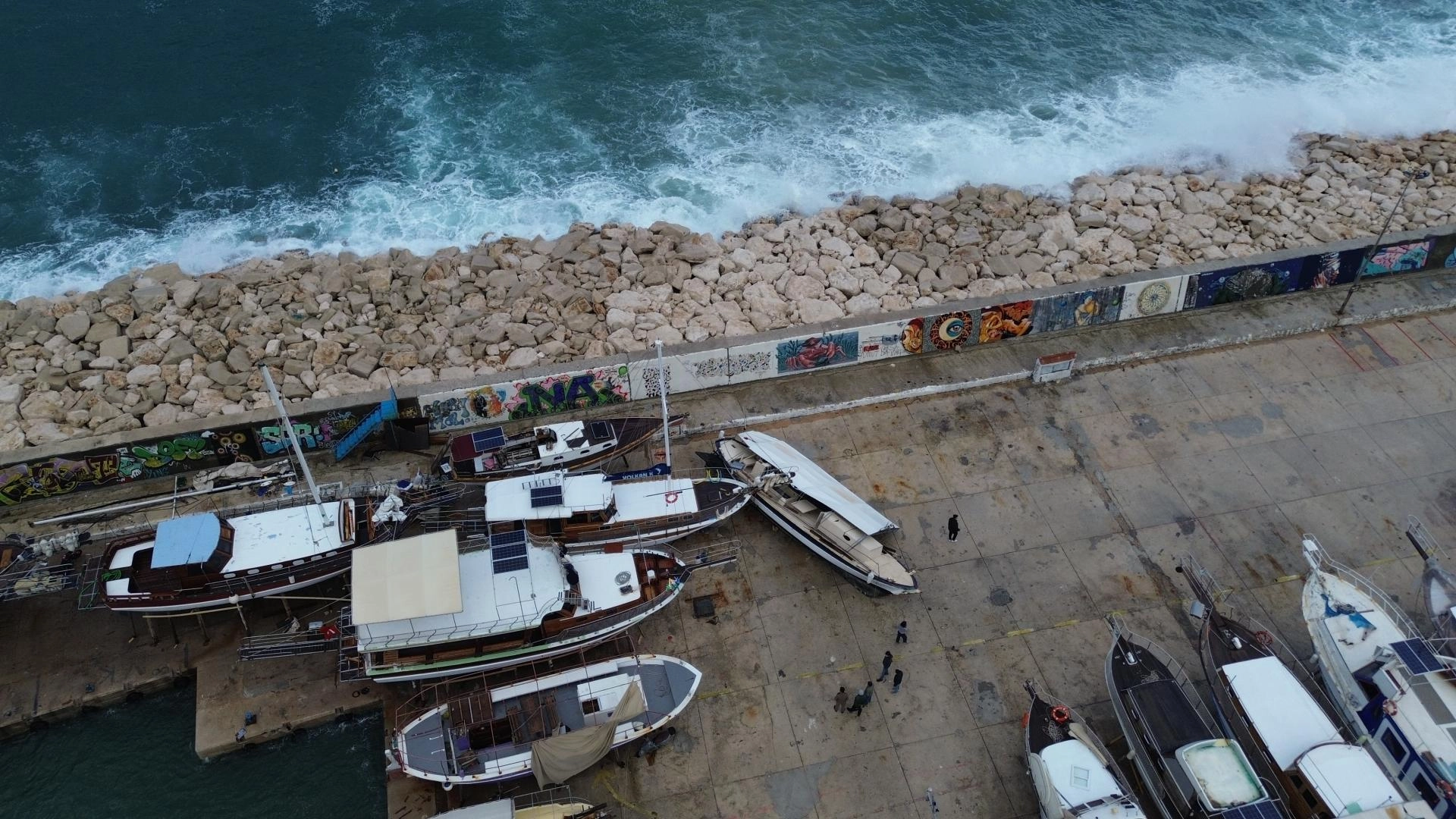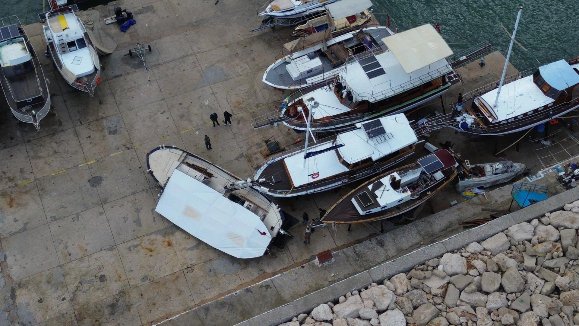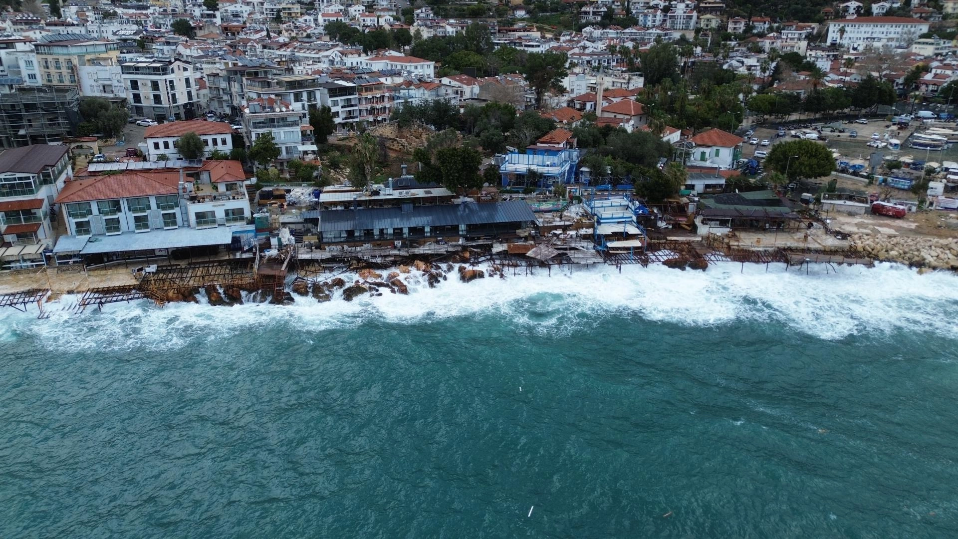 ANTALYA (AA) - Antalya'nın Kaş ilçesinde kuvvetli rüzgar sonrası oluşan dalgalar, limandaki tekne ve işletmelerde hasara neden oldu.