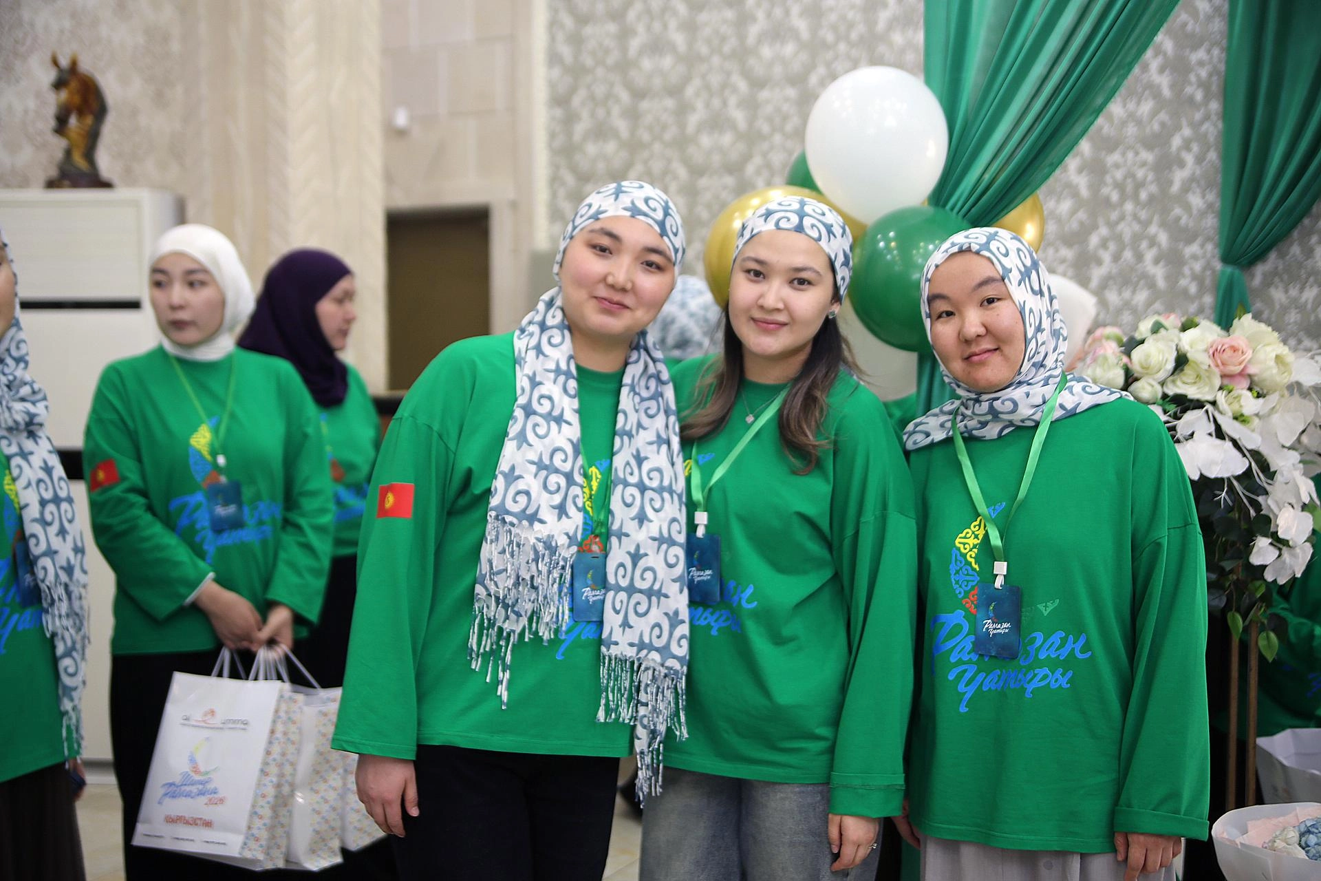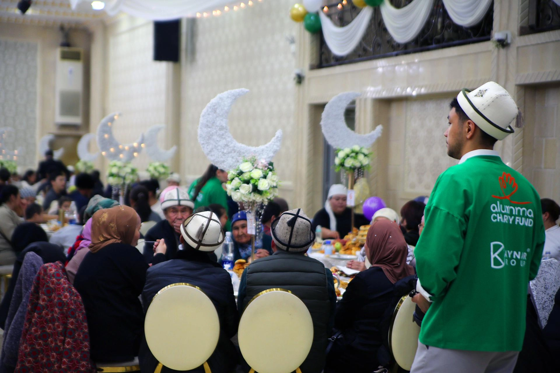 Ramazan ayının manevi atmosferine uygun süslenen ve özel ışıklandırılan salonda, "Ramazan İftarı" yazılı yeşil tişörtlü gönüllü gençler davetlilere hizmet etti.