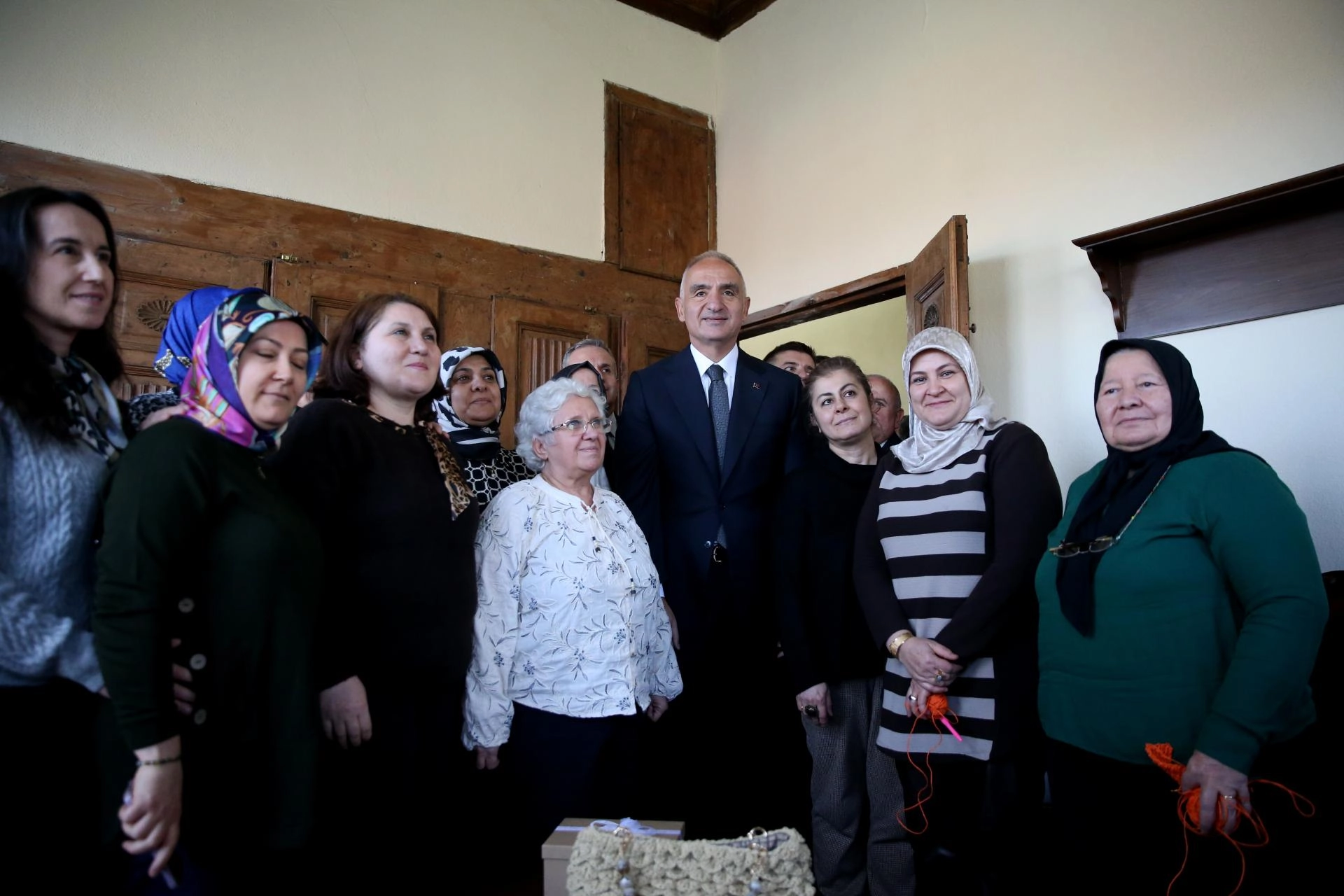 Müze evinde Ersoy'a, Tığ Örücülüğü ve Tel Kırma Kursu'na giden kadınlar tarafından, el emeği tel kırma çanta hediye etti.