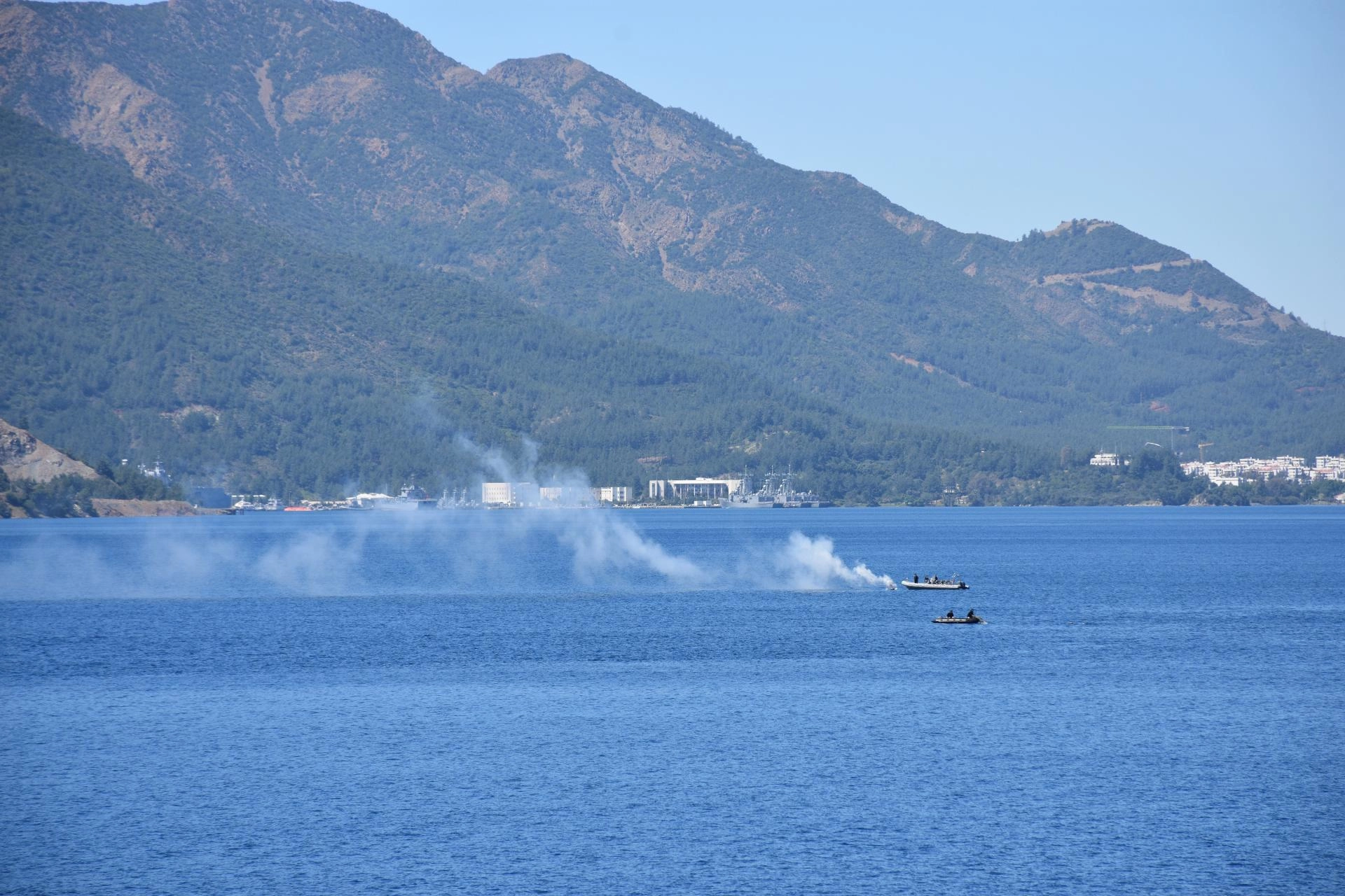 Marmaris ilçesindeki Aksaz Deniz Üssü'nün açıklarında gerçekleştirilen tatbikatta, senaryo gereği deniz kazasına müdahale edildi.