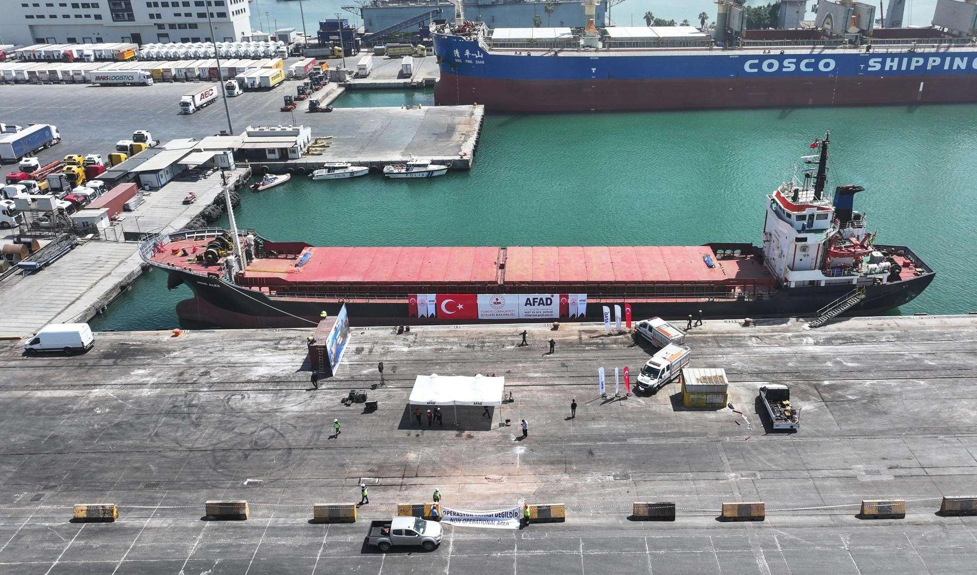 MERSİN (AA) - Afet ve Acil Durum Yönetimi Başkanlığı (AFAD) ve Türk Kızılay işbirliğinde Lübnan'a ulaştırılması için hazırlanan 730 tonluk insani yardım malzemesini taşıyan "8. İyilik Gemisi" Mersin Uluslararası Limanı'ndan uğurlandı.
