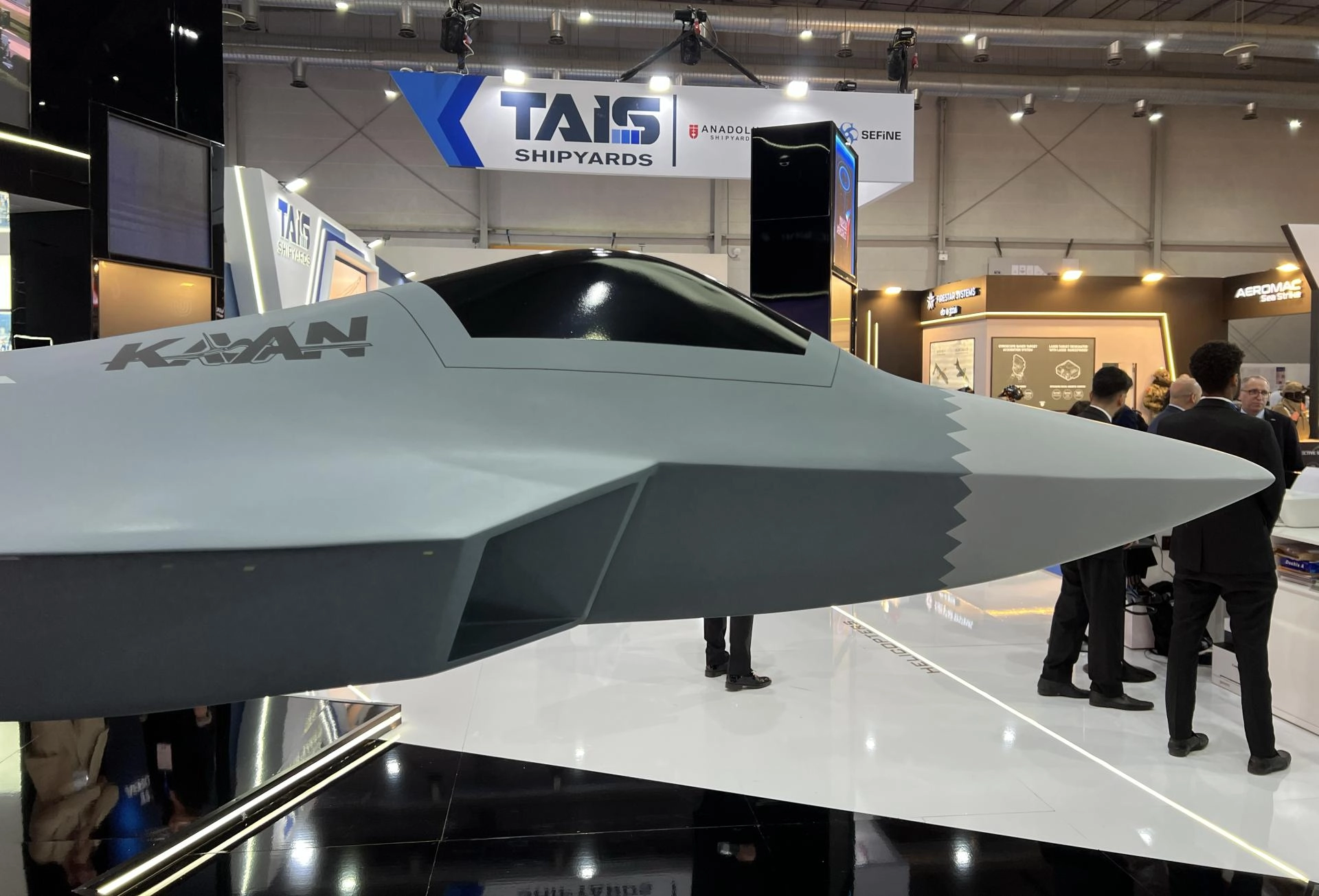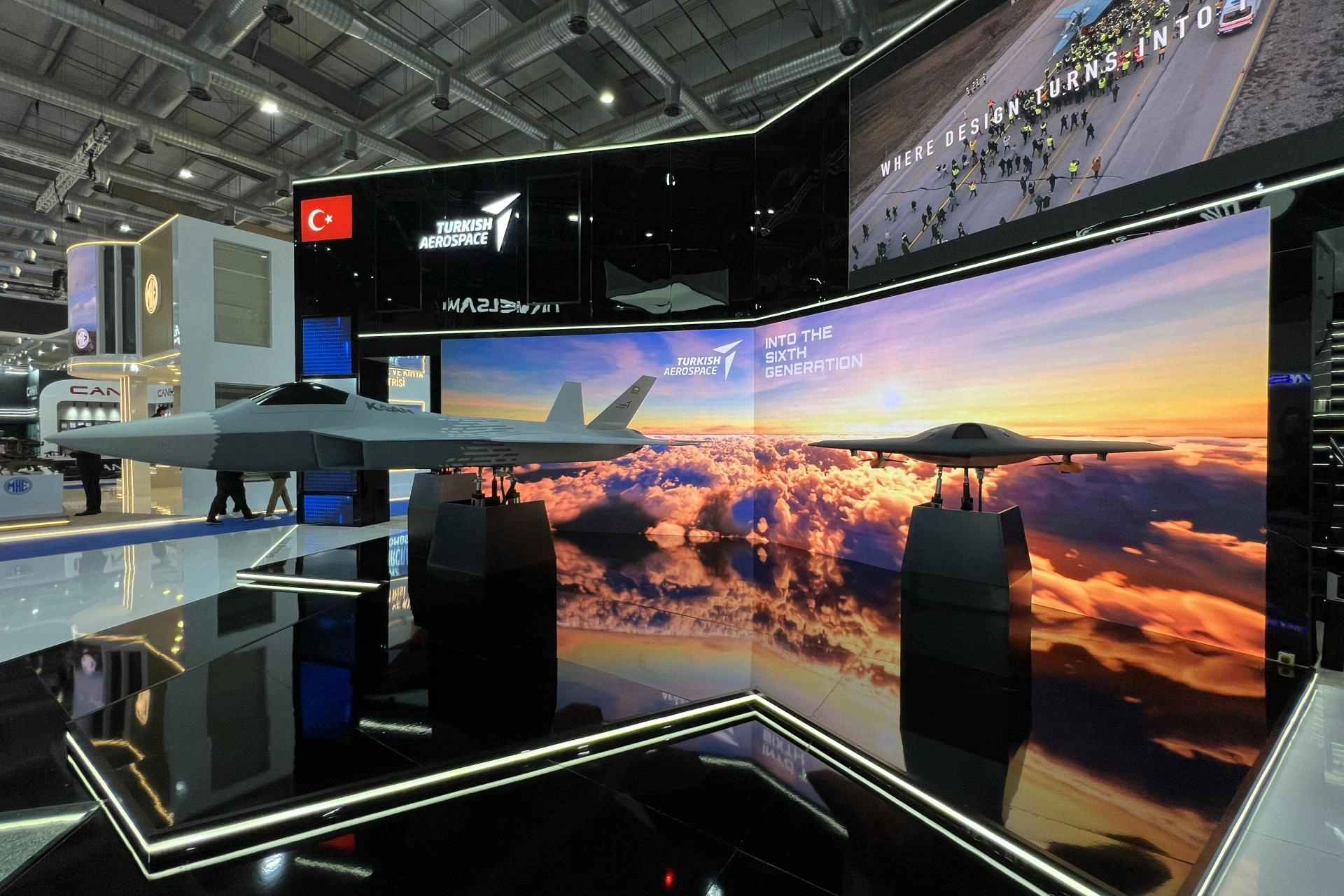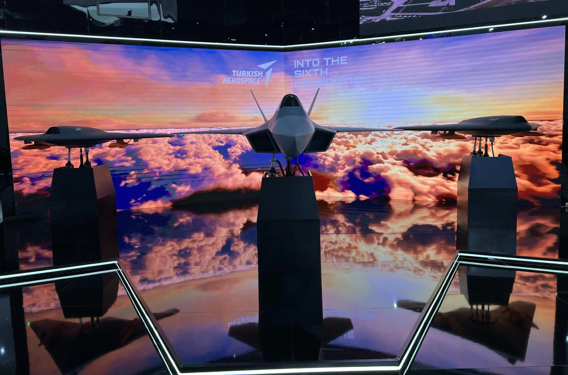 Arka plandaki led ekranlardaki videoyla senkron şekilde desteklenen konseptle KAAN ve iki yanındaki ANKA III'ler hangardan çıkıp bazı manevralarla taarruz görevi gerçekleştiriyor. TUSAŞ'ın bu yeni tanıtımı ziyaretçilerin oldukça ilgisini çekti.