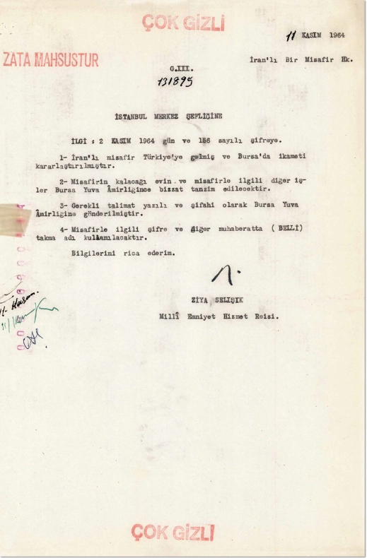 "İranlı misafir Türkiye'ye gelmiş ve Bursa'da ikameti kararlaştırılmıştır. Misafirin kalacağı evin ve misafirle ilgili diğer işler Bursa Yuva Amirliğince bizzat tanzim edilecektir. Gerekli talimat yazılı ve şifahi olarak Bursa Yuva Amirliği'ne gönderilmiştir. Misafirle ilgili şifre ve diğer muhaberatta 'belli' takma adı kullanılacaktır. Bilgilerini rica ederim."