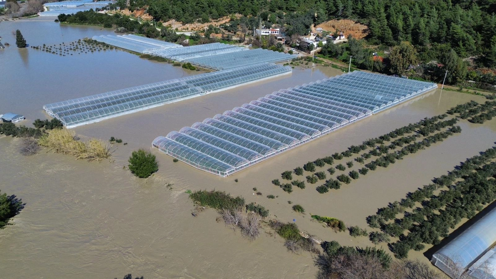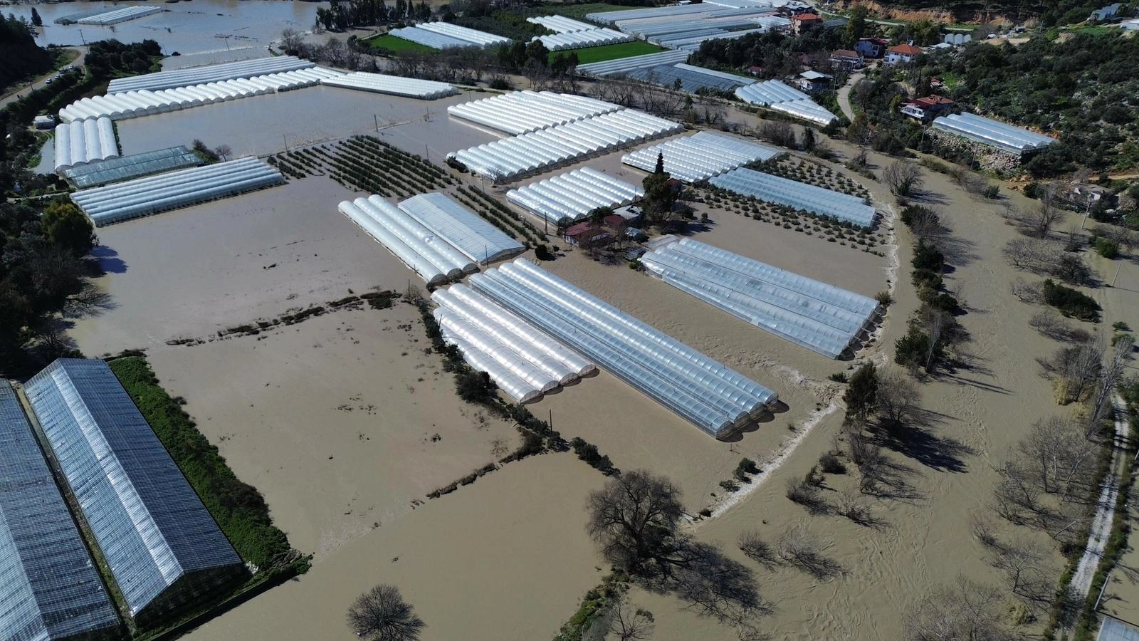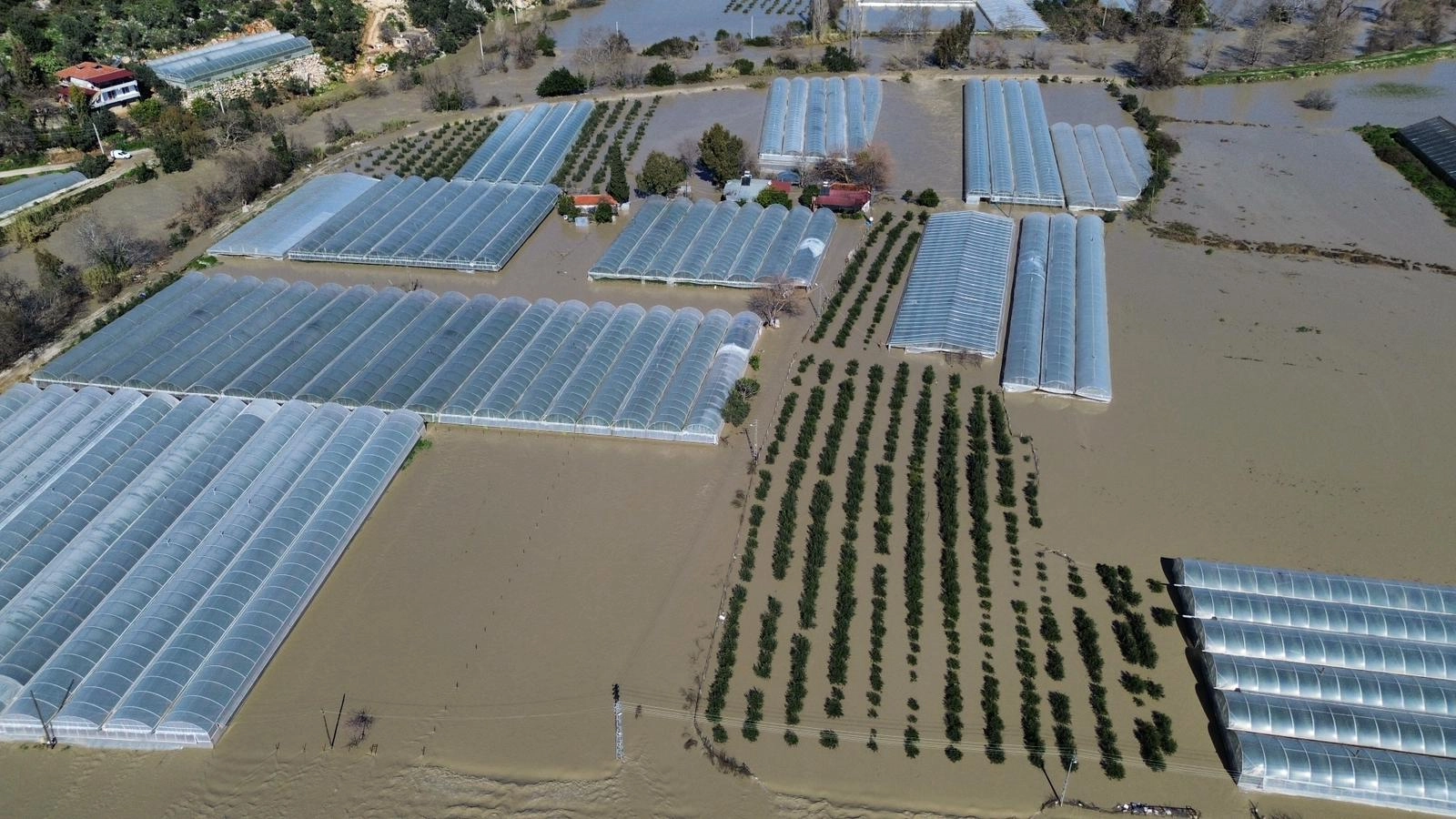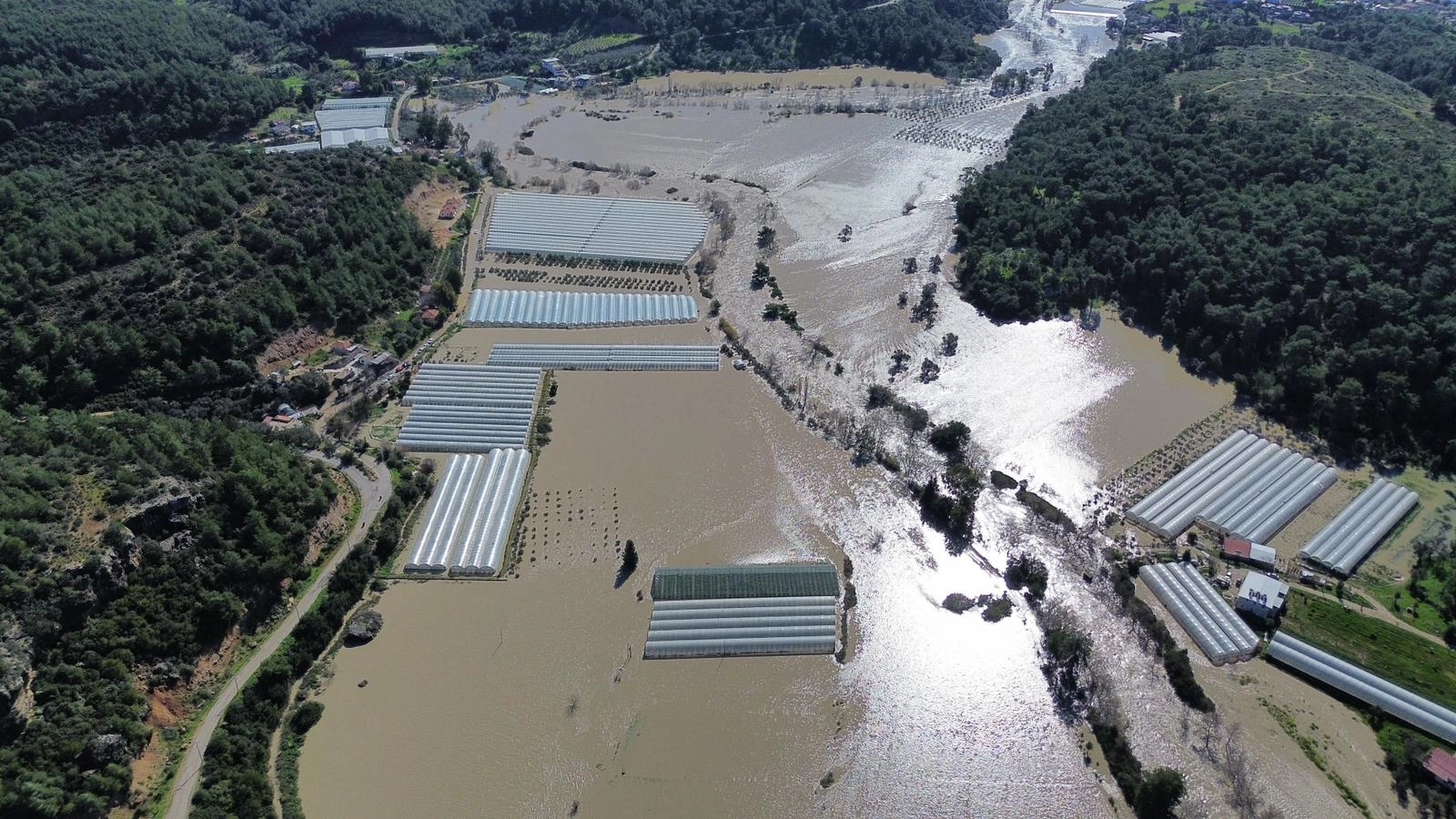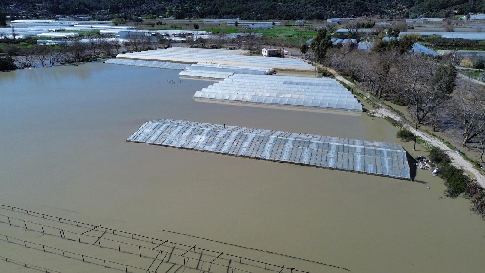 Bölgede yaşanan su baskını AA ekibince havadan görüntülendi. Bazı seraların büyük kısmının su altında kaldığı, sadece çatısının görüldüğü görüntülere yansıdı.