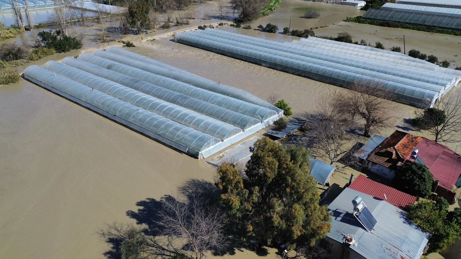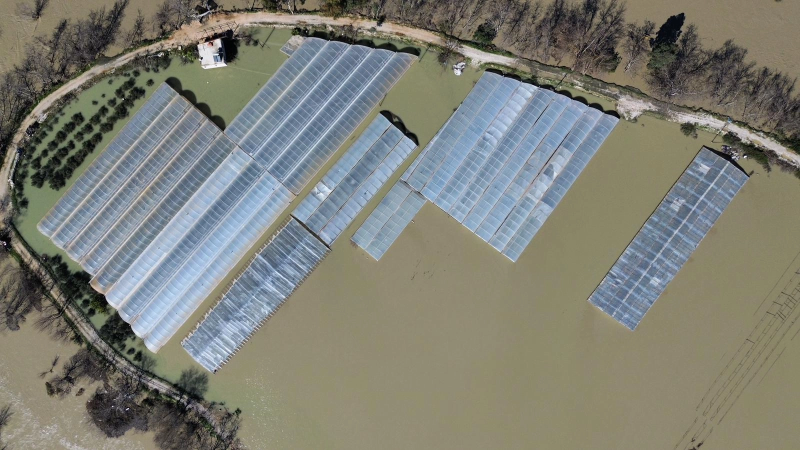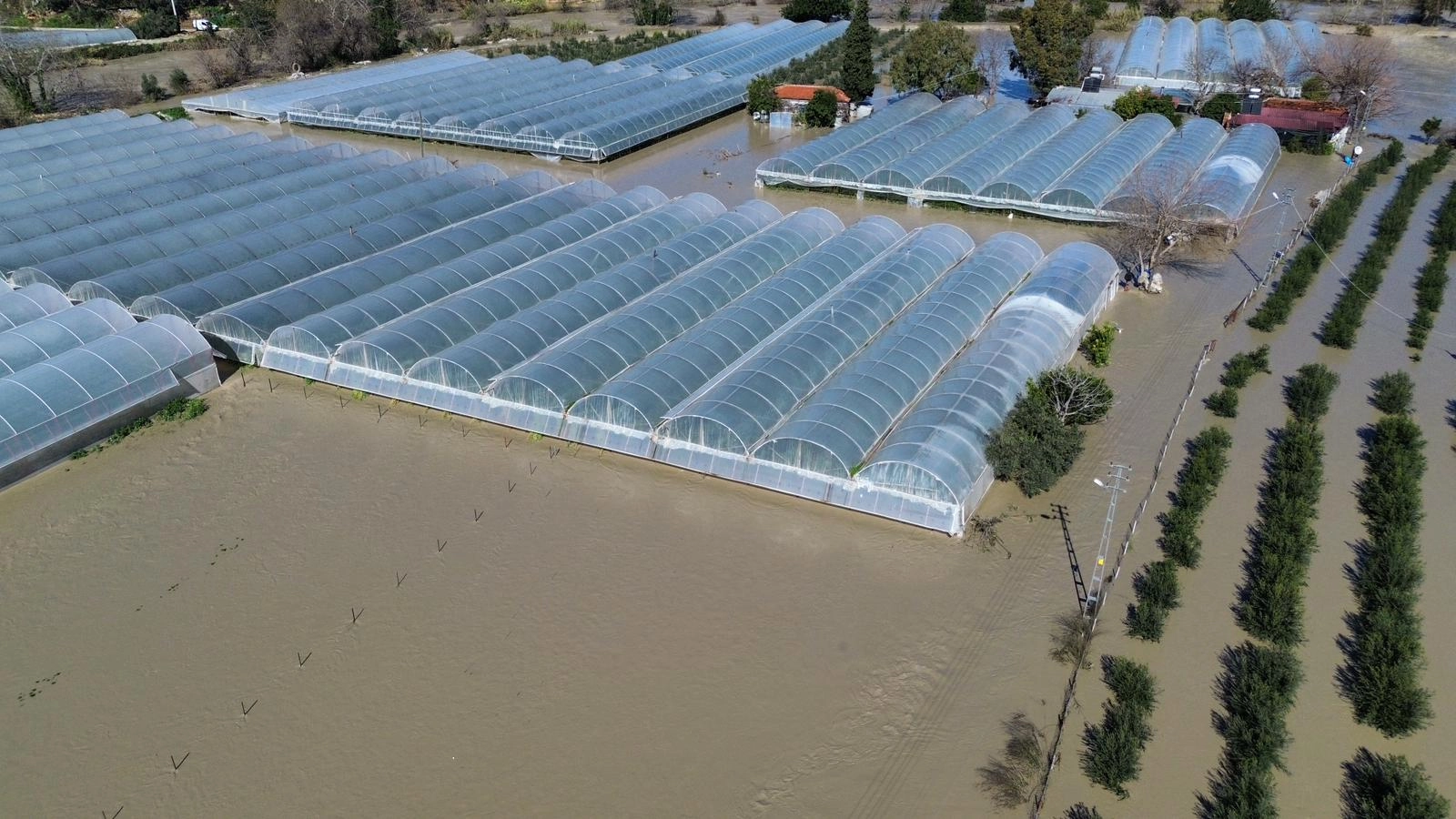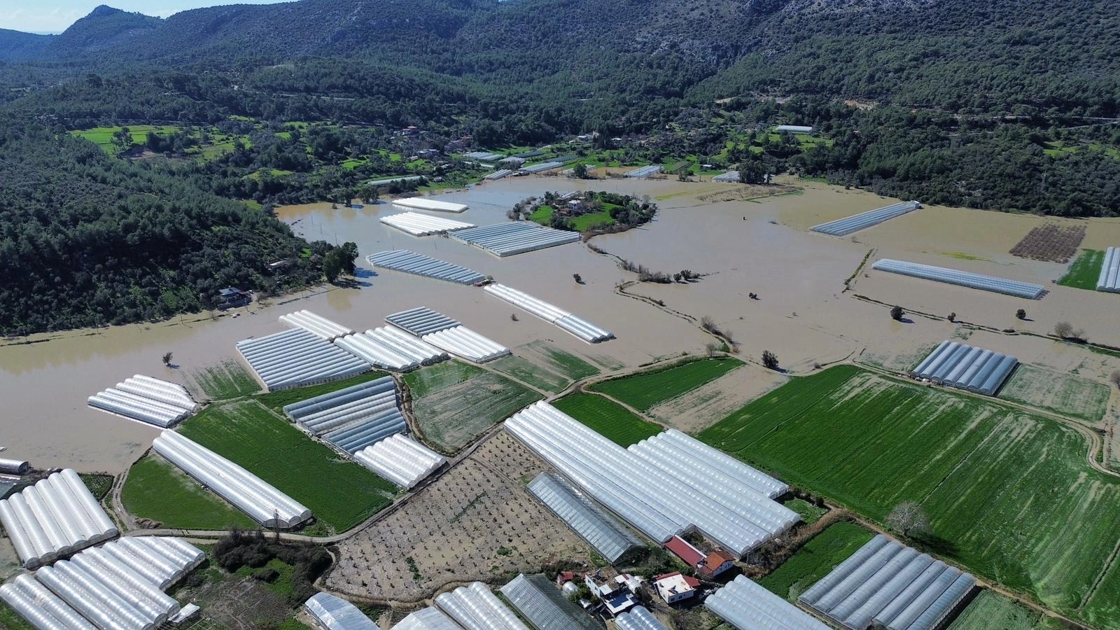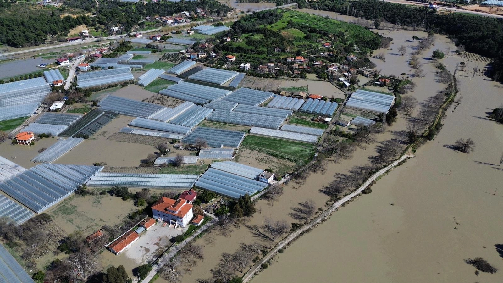 Bölgede yaşanan su baskını AA ekibince havadan görüntülendi. Bazı seraların büyük kısmının su altında kaldığı, sadece çatısının görüldüğü görüntülere yansıdı.
