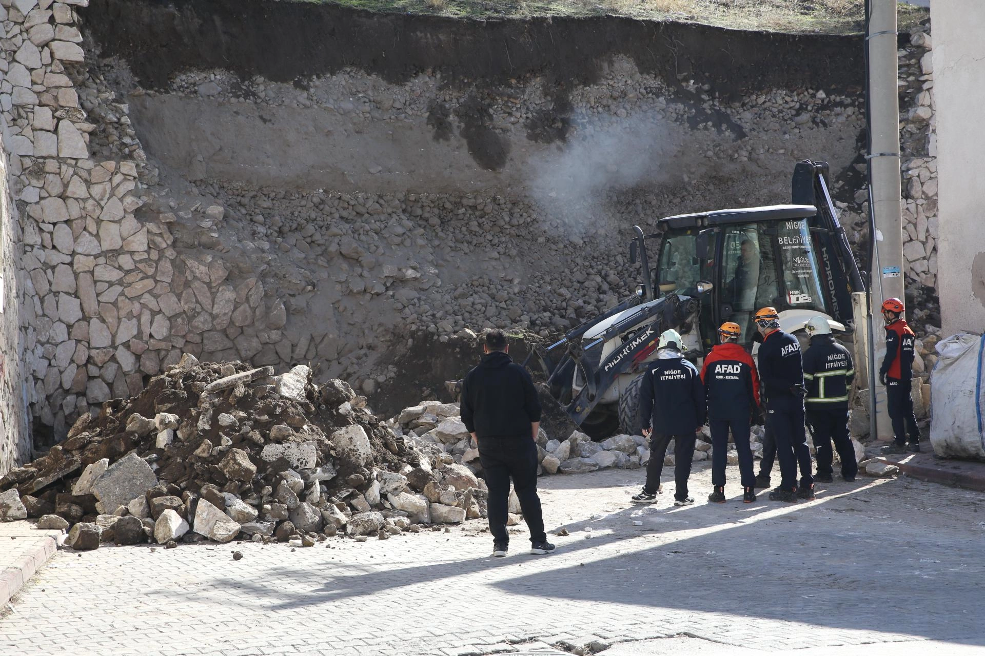 NİĞDE (AA) - Niğde Kalesi'nin istinat duvarının bir kısmının çökmesi üzerine ekipler bölgede önlem aldı.