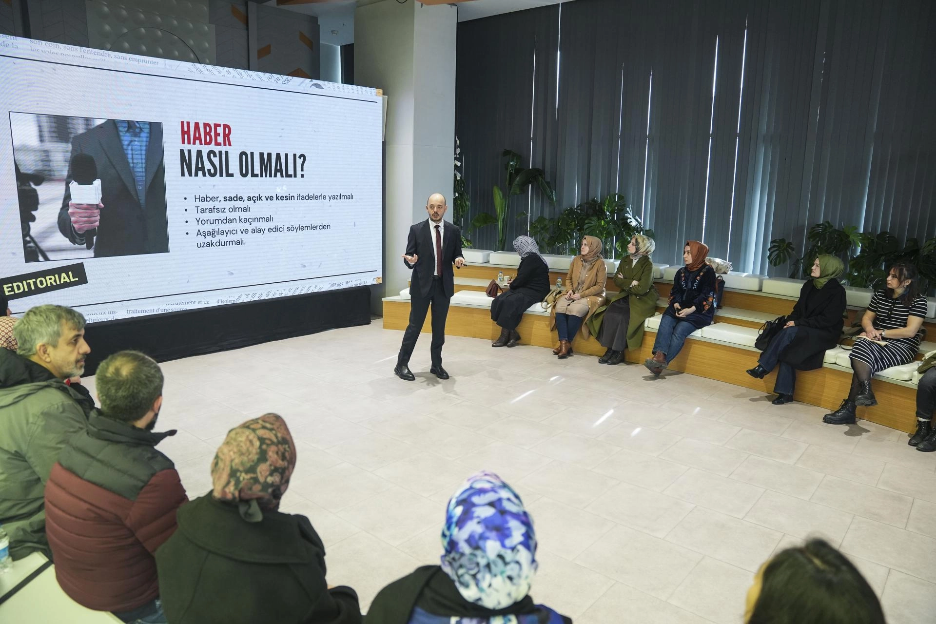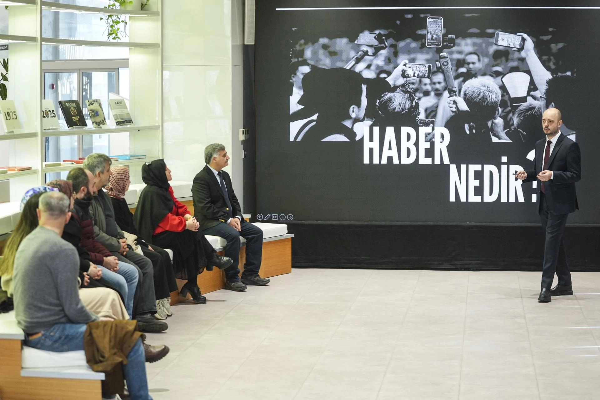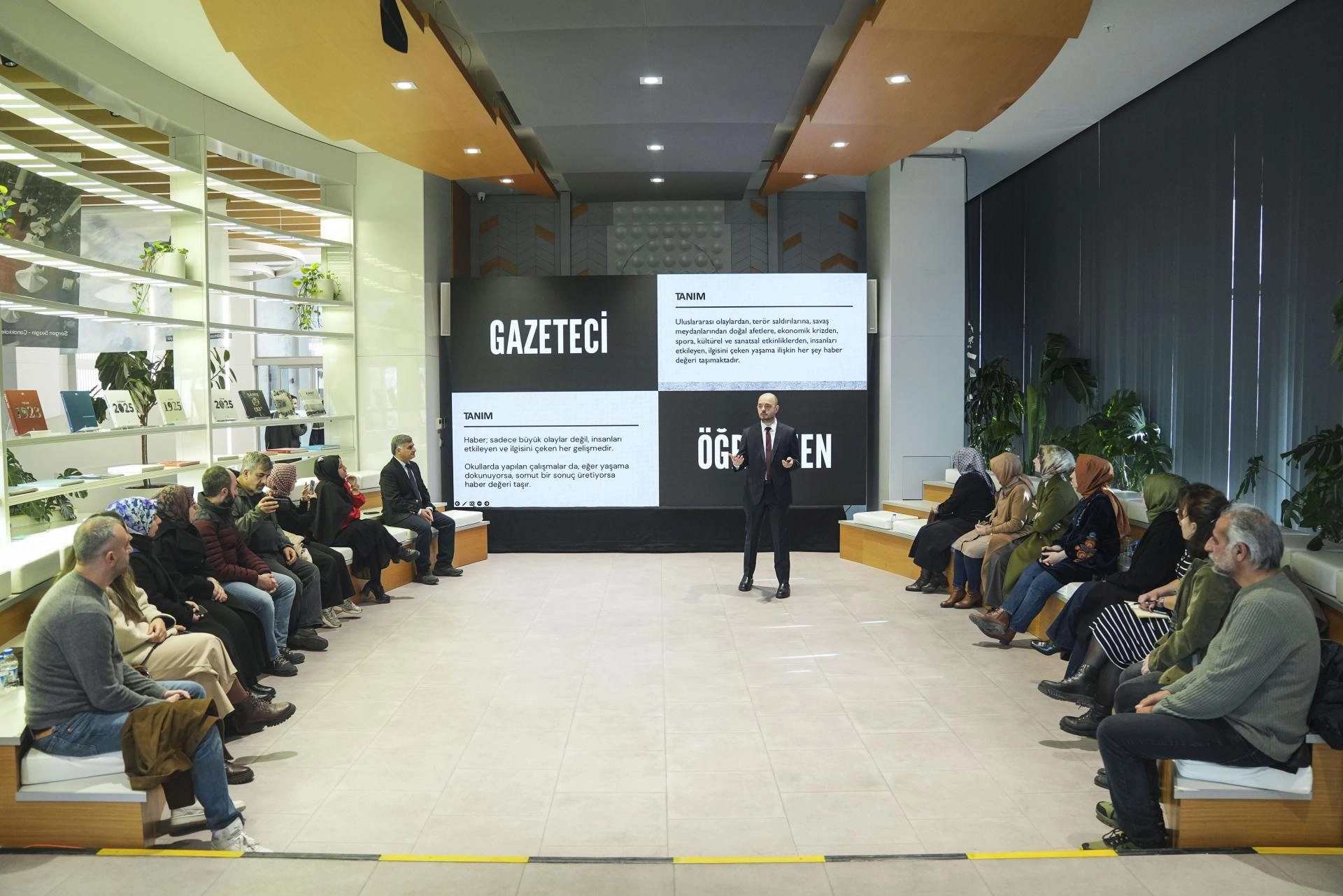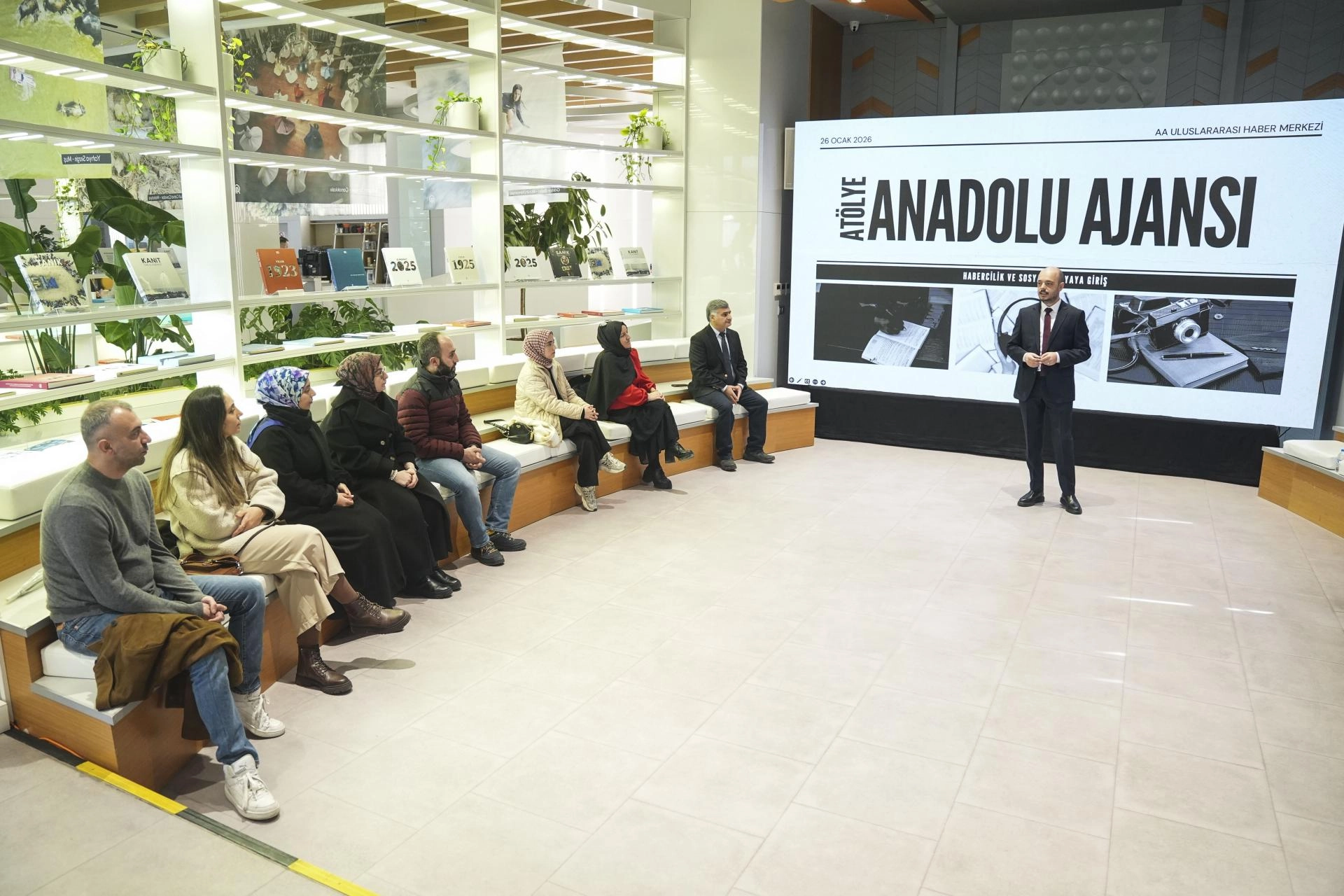 AA Sosyal Medya Haberleri Müdürlüğü Başmuhabiri Oğuzhan Çal, ziyarete gelen öğretmenlere "Sosyal Medya Haberciliği" başlıklı sunum yaptı.