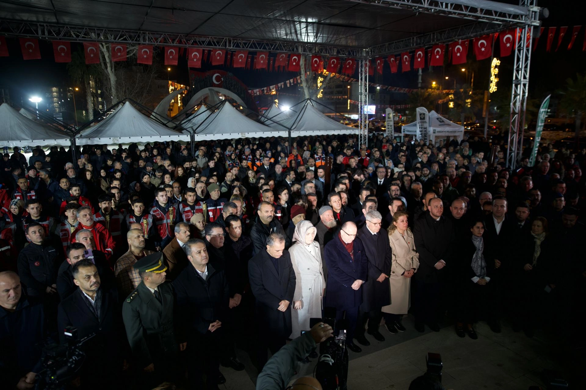 Kahramanmaraş merkezli ilk depremin meydana geldiği saat 04.17'de saygı duruşunda bulunan katılımcılar, İstiklal Marşı okudu.