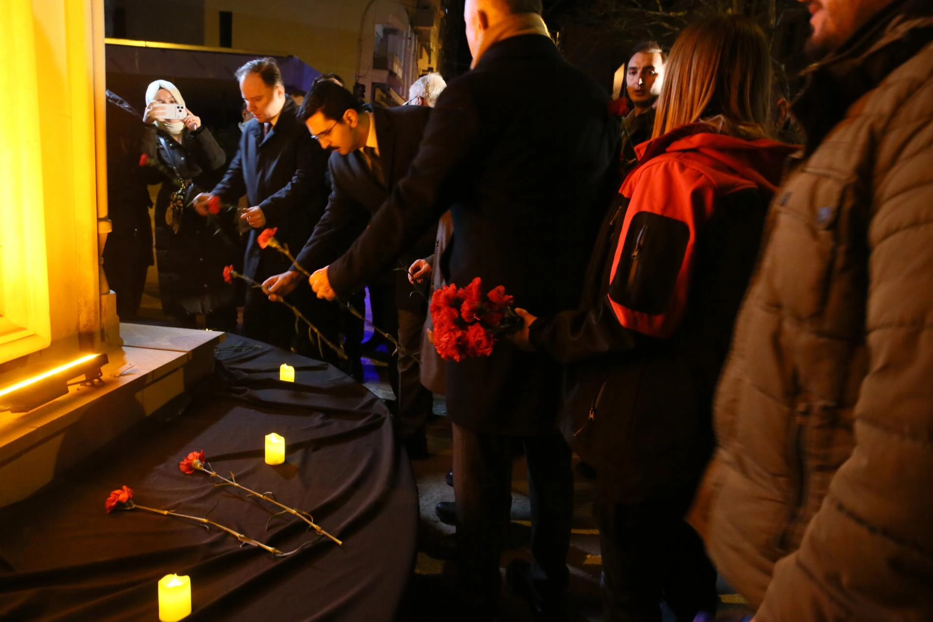 İlçede hayatını kaybedenler için saat kulesinin önüne karanfil bırakan gruba ikramlarda bulunuldu.