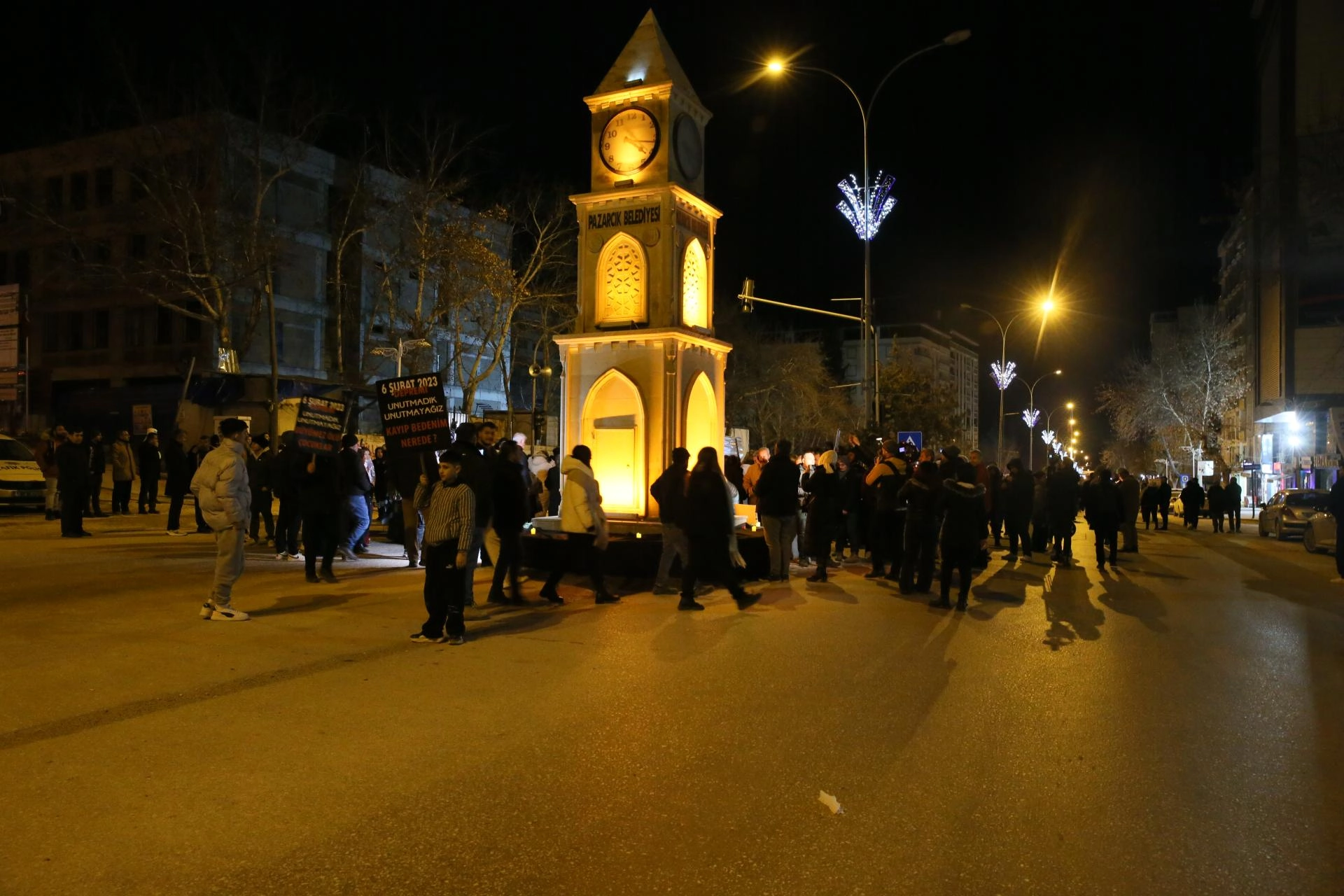 Daha sonra CHP Kahramanmaraş Milletvekili Ali Öztunç, Pazarcık Kaymakamı Hulusi Teke, Belediye Başkanı Haydar İkizer'in de aralarında bulunduğu katılımcılar, 6 Şubat 2023'teki ilk sarsıntıda saatler 04.17'yi gösterirken sabit kalan Pazarcık Saat Kulesi'ne yürüdü.