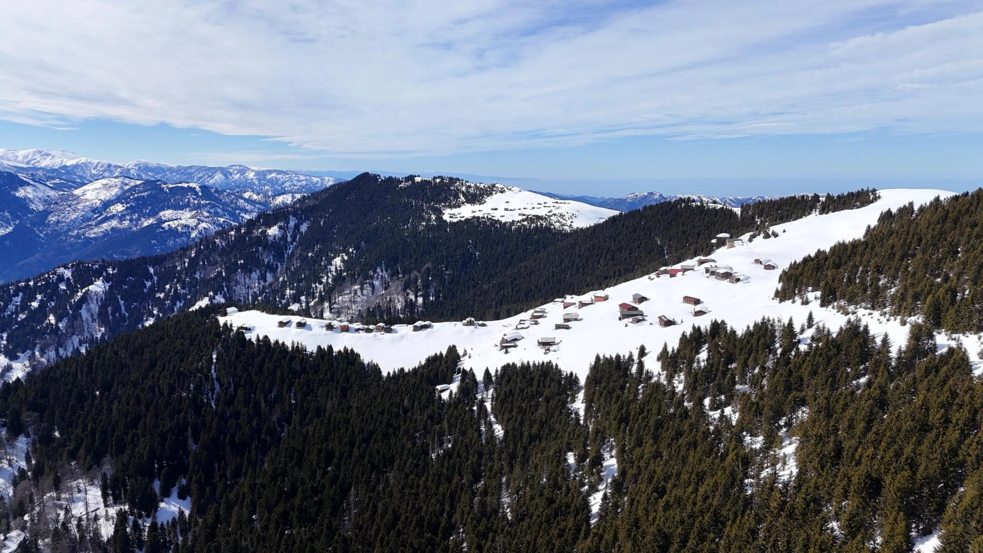 Karla kaplı yayla evleri ve Kaçkar Dağları'nın zirveleri dronla kaydedildi.