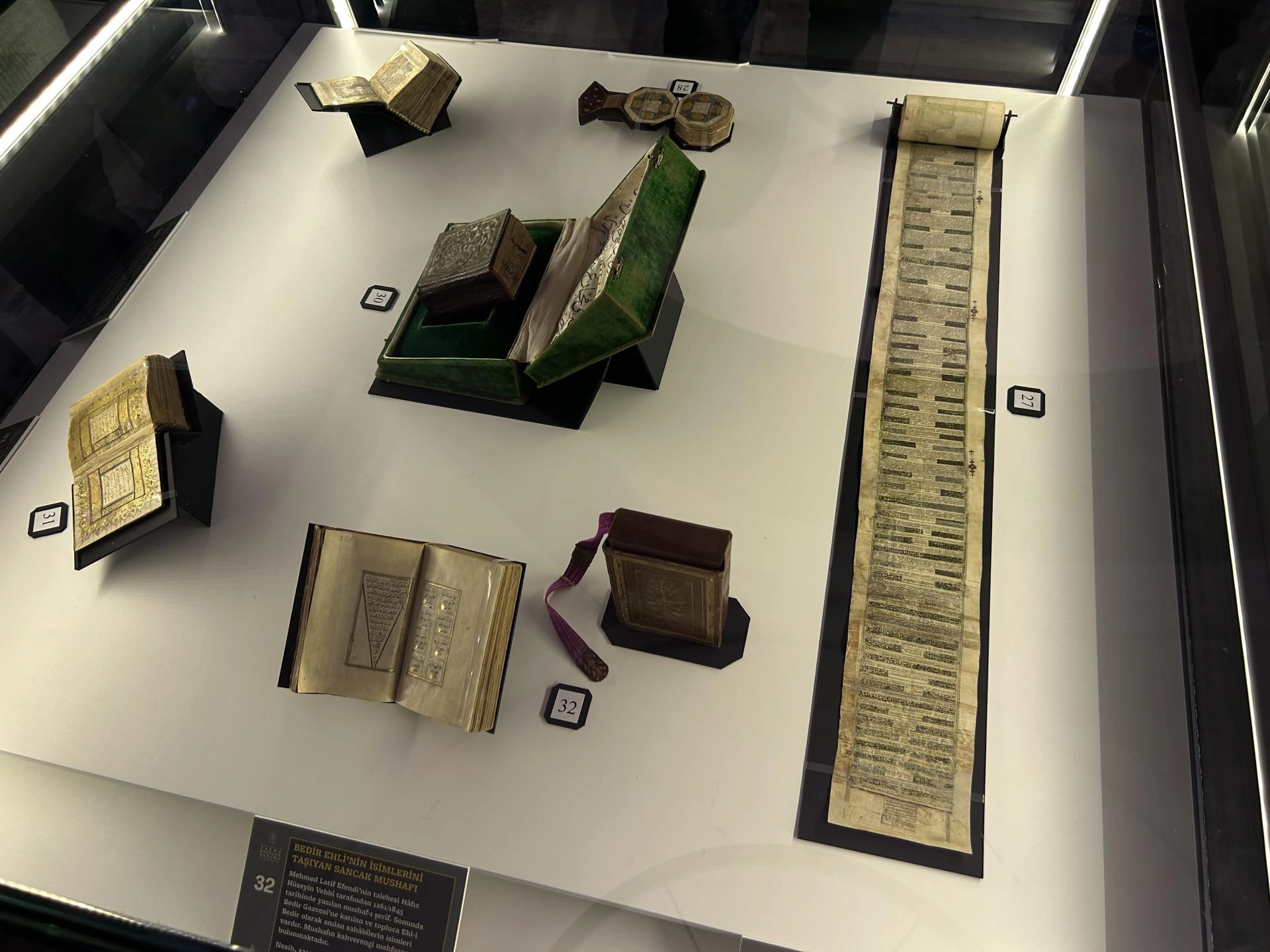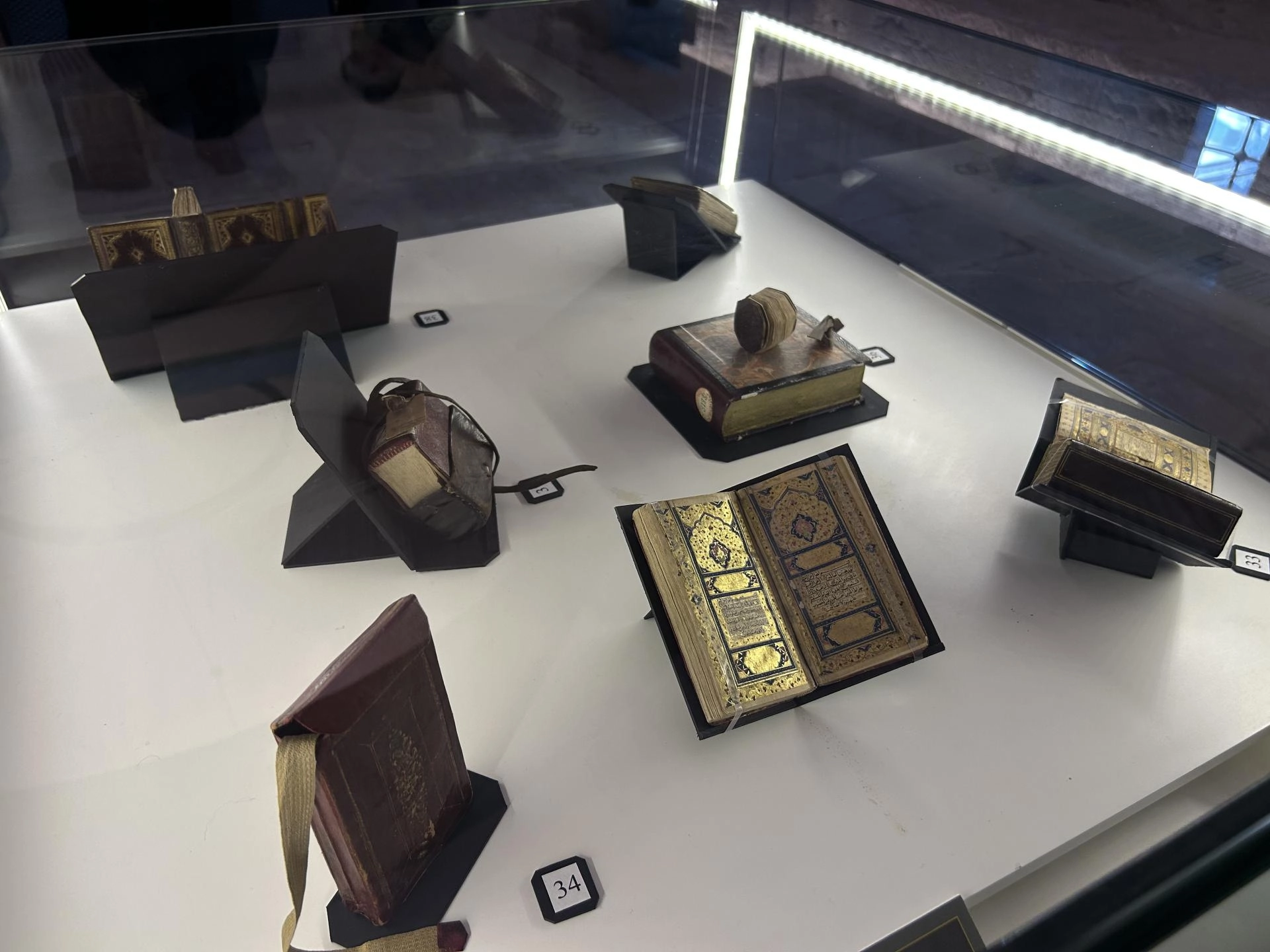 Çoğunluğu orijinal eserlerden oluşan sergi koleksiyonunda, küçük yüzeylere el işçiliğiyle sığdırılan hat, tezhip ve cilt sanatının nadide örnekleri büyüteçler sayesinde detaylı incelenebiliyor.