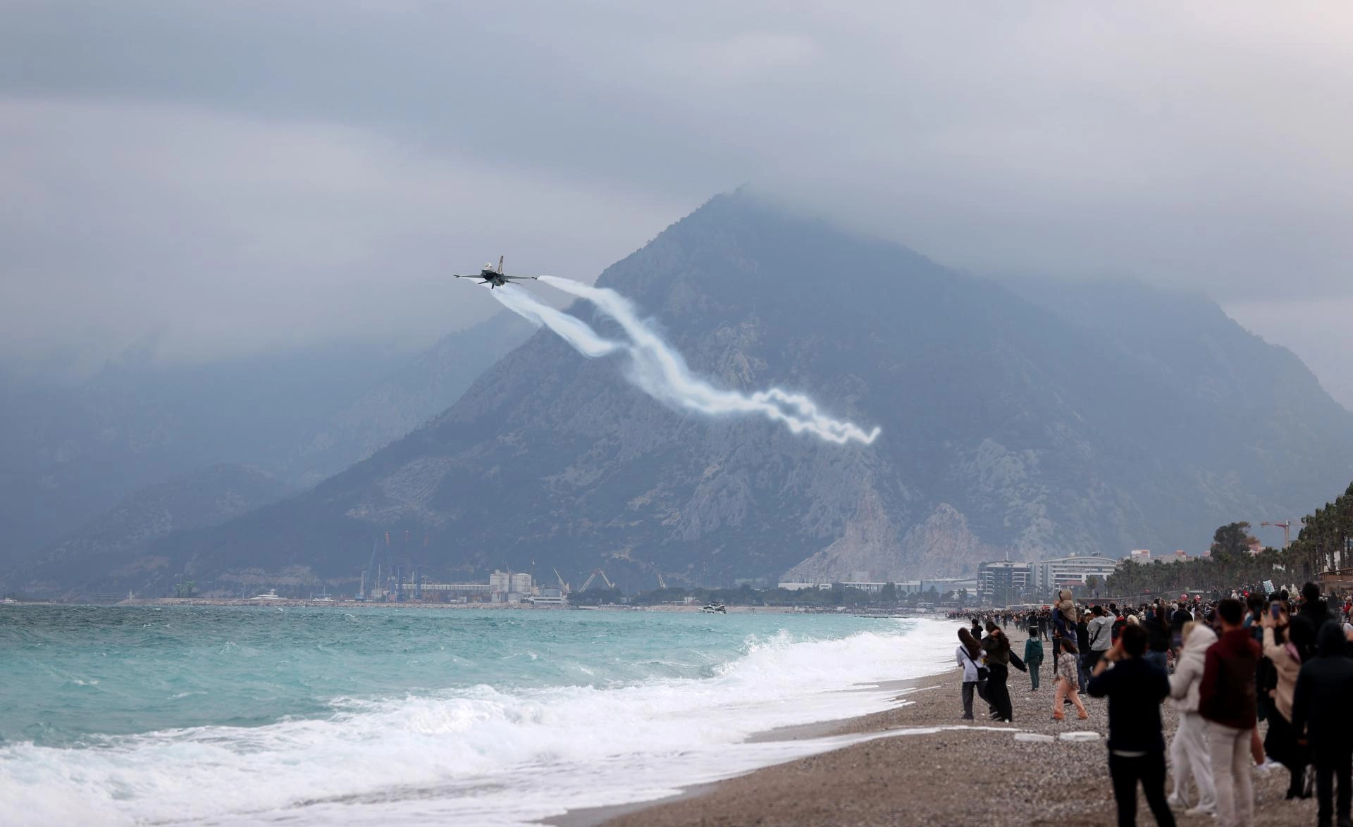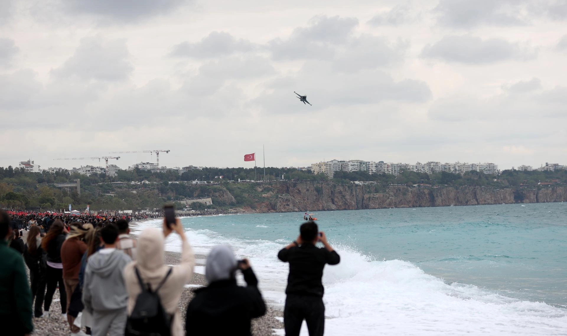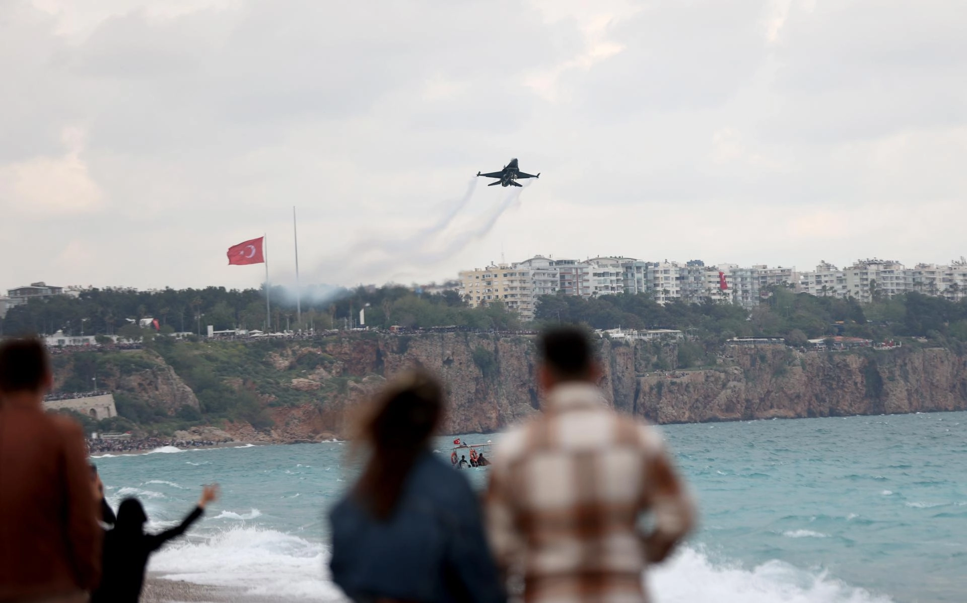 Antalya Valiliği ile Büyükşehir Belediyesi işbirliğinde düzenlenen etkinlik için Konyaaltı Sahili Olbia Meydanı önünde toplanan vatandaşlar, F-16 uçağıyla yapılan gösteriyi ilgiyle izledi.