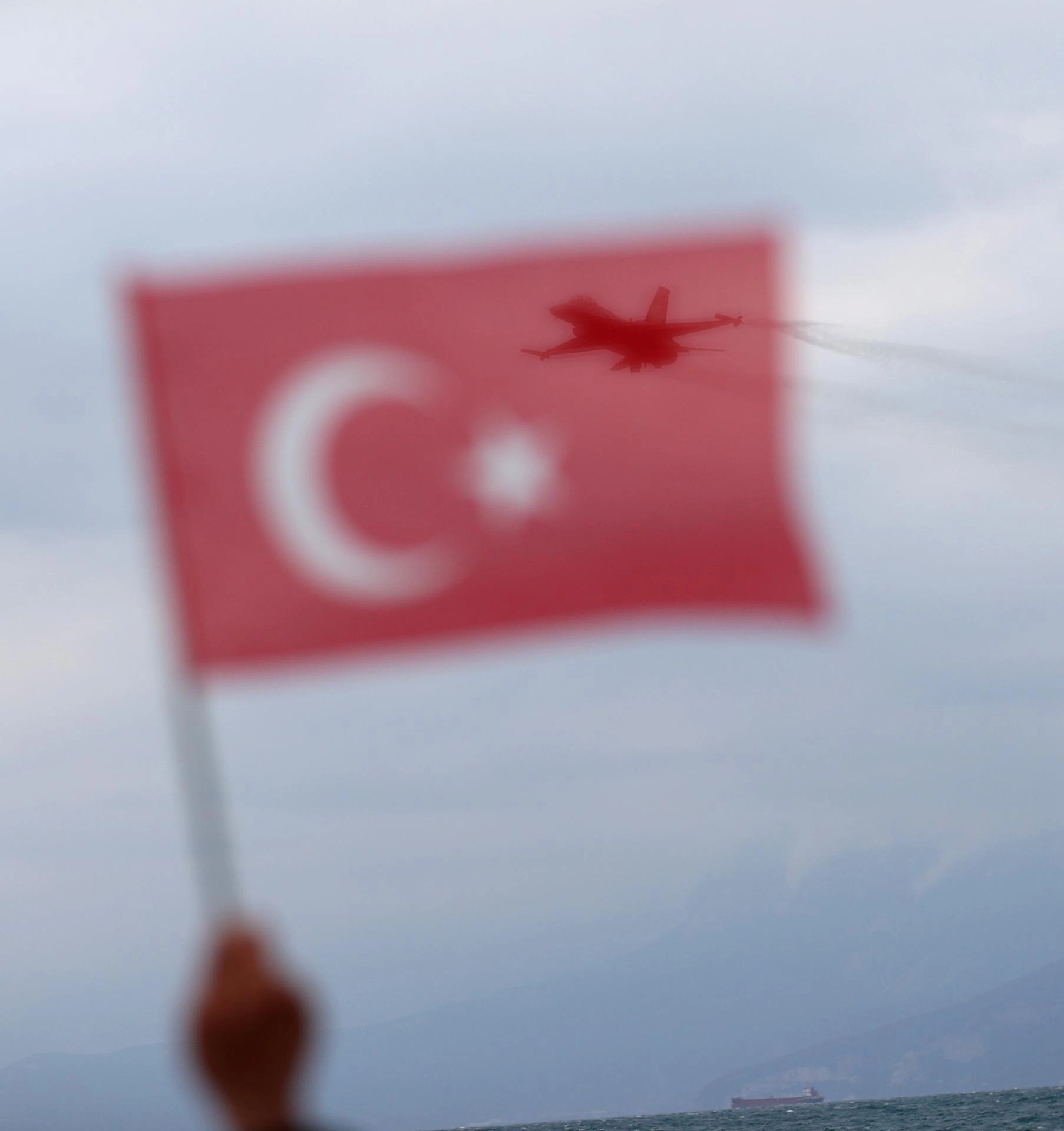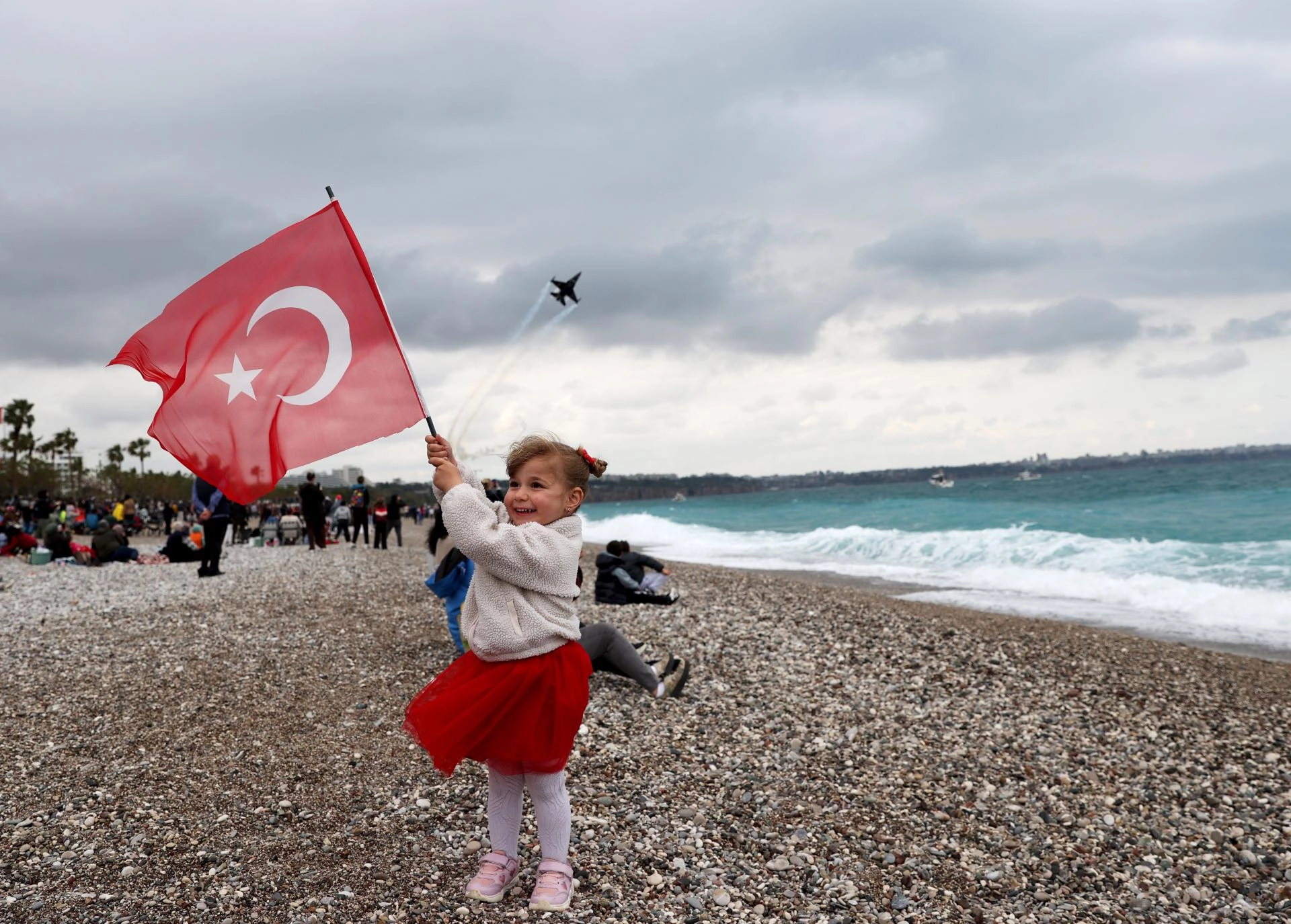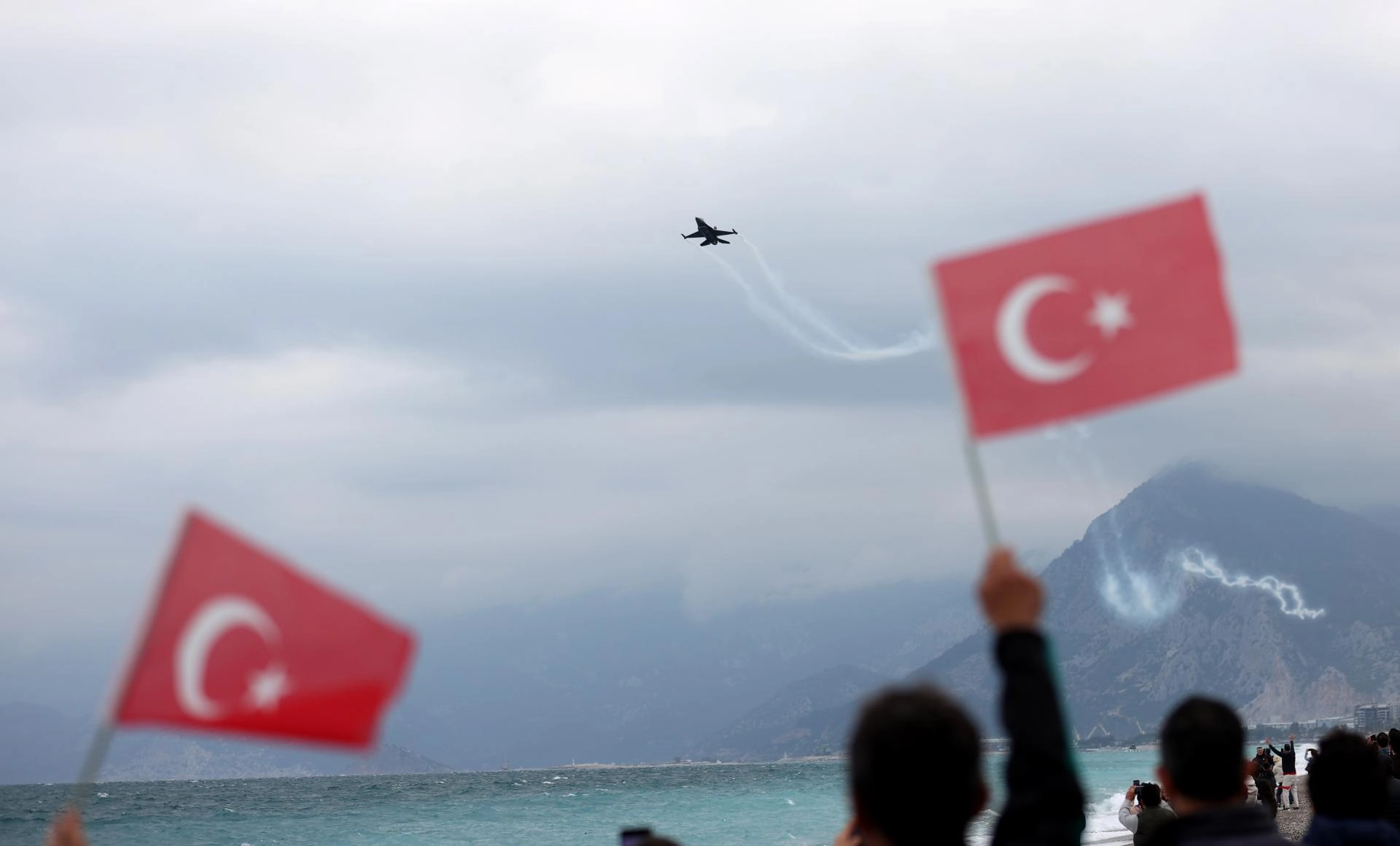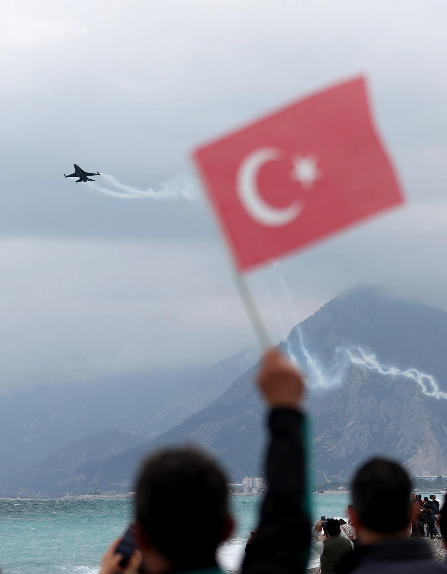 Antalya Valiliği ile Büyükşehir Belediyesi işbirliğinde düzenlenen etkinlik için Konyaaltı Sahili Olbia Meydanı önünde toplanan vatandaşlar, F-16 uçağıyla yapılan gösteriyi ilgiyle izledi.