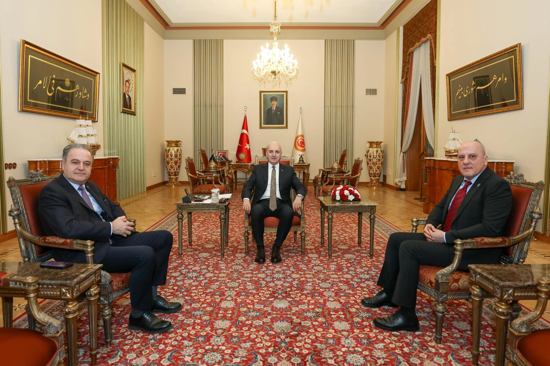 TBMM Başkanlığından yapılan açılamada, Kurtulmuş'un, Milli Dayanışma, Kardeşlik ve Demokrasi Komisyonu'nun raporunu tamamlama çalışmaları kapsamında, AK Parti Grup Başkanvekili Abdulhamit Gül, CHP Grup Başkanvekili Murat Emir, MHP Genel Başkan Yardımcısı Feti Yıldız, Yeni Yol Partisi Grup Başkanvekili Bülent Kaya ve DEM Parti İstanbul Milletvekili Cengiz Çiçek'i kabul ettiği bildirildi.