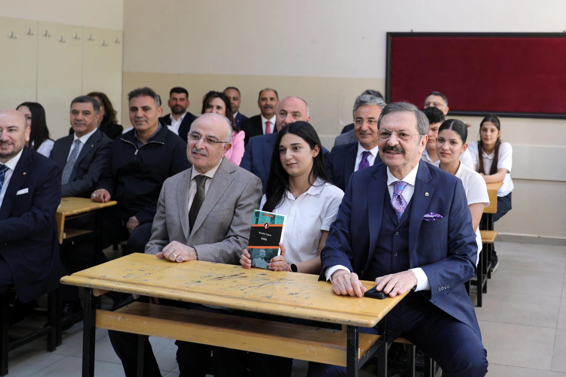 Buradaki öğrencilerle görüşen Hisarcıklıoğlu, kitap dağıtıp öğretmenlerle sohbet etti.