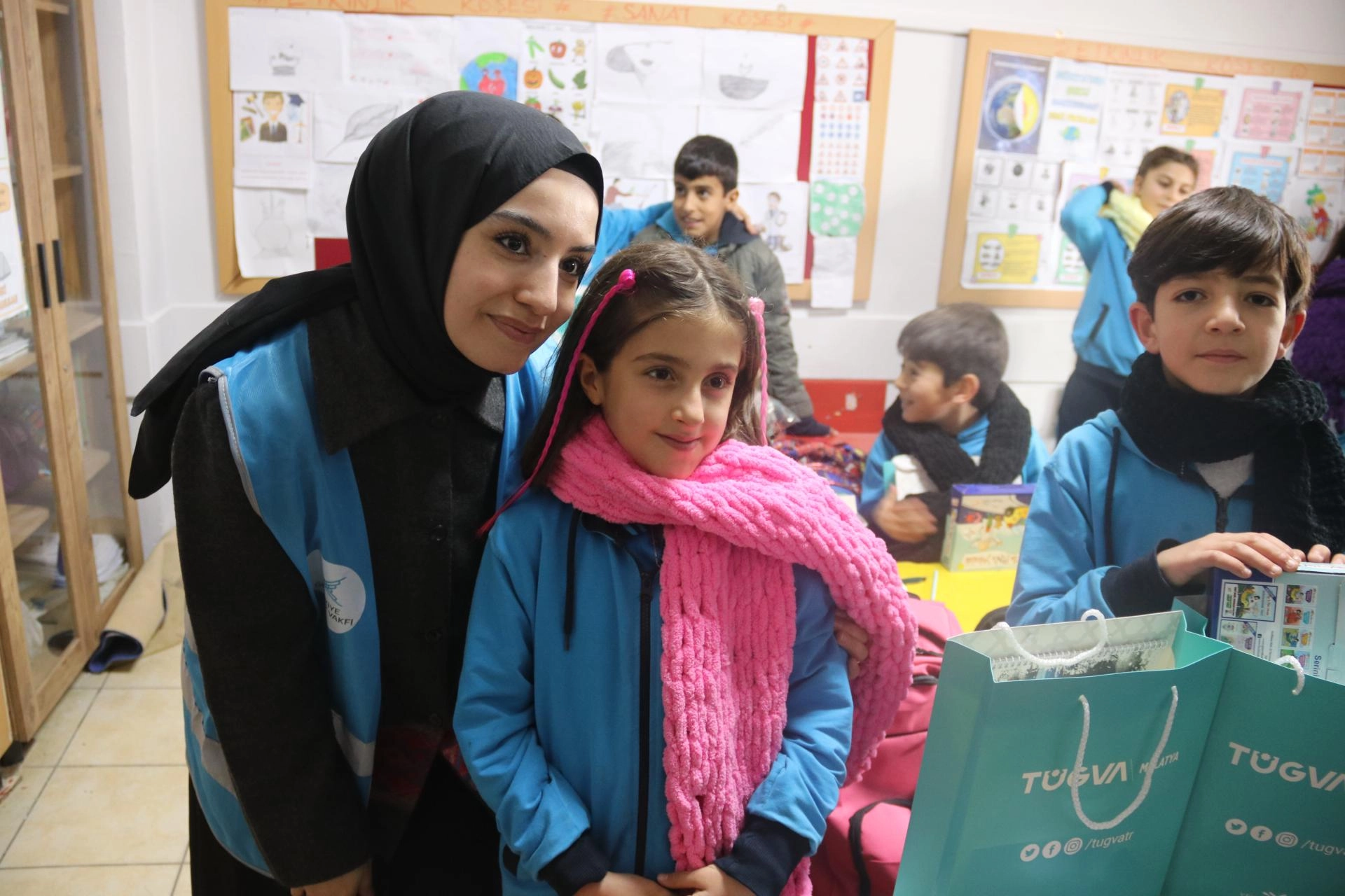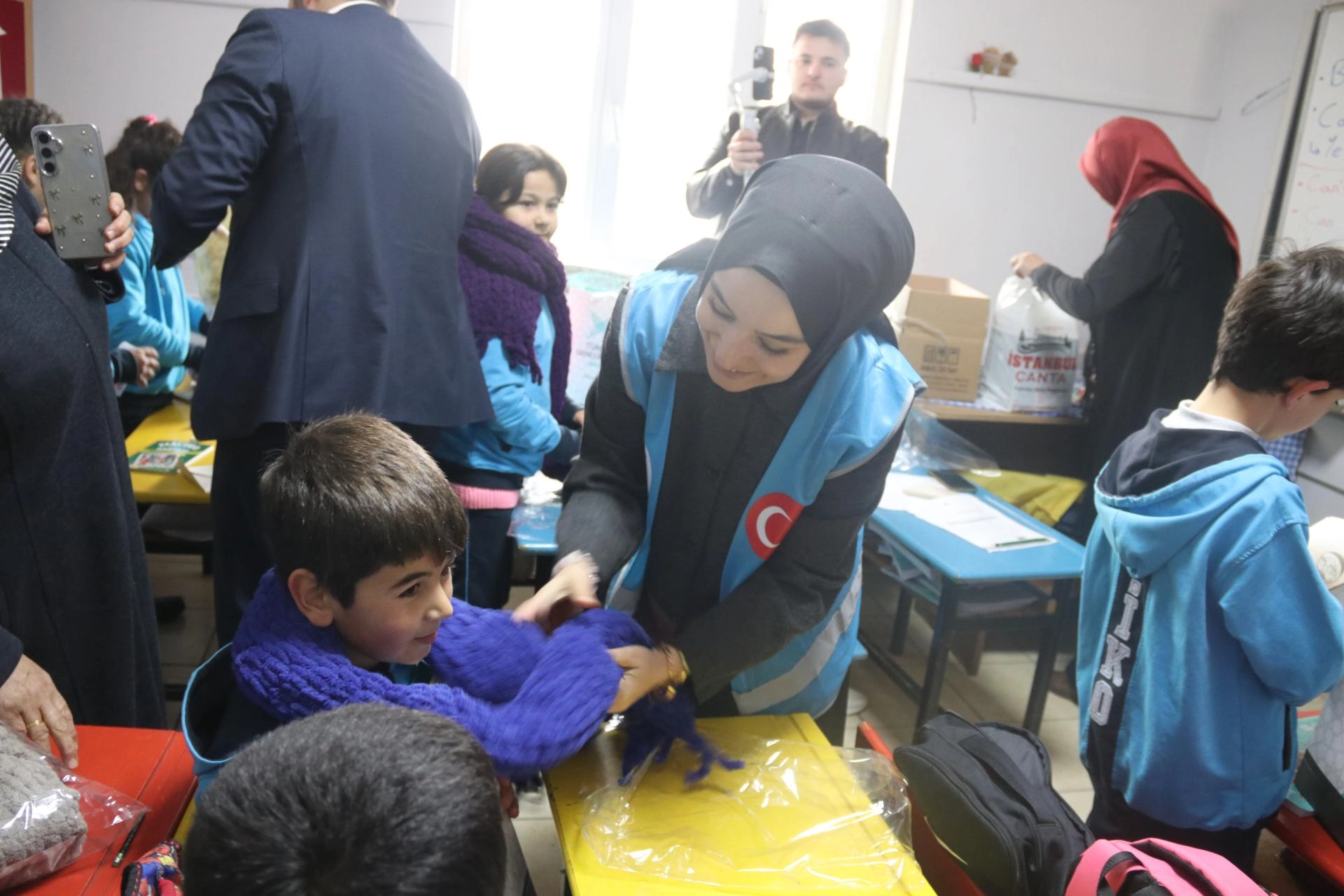 TÜGVA öncülüğünde depremzede kadınlardan öğrencilere atkı desteği