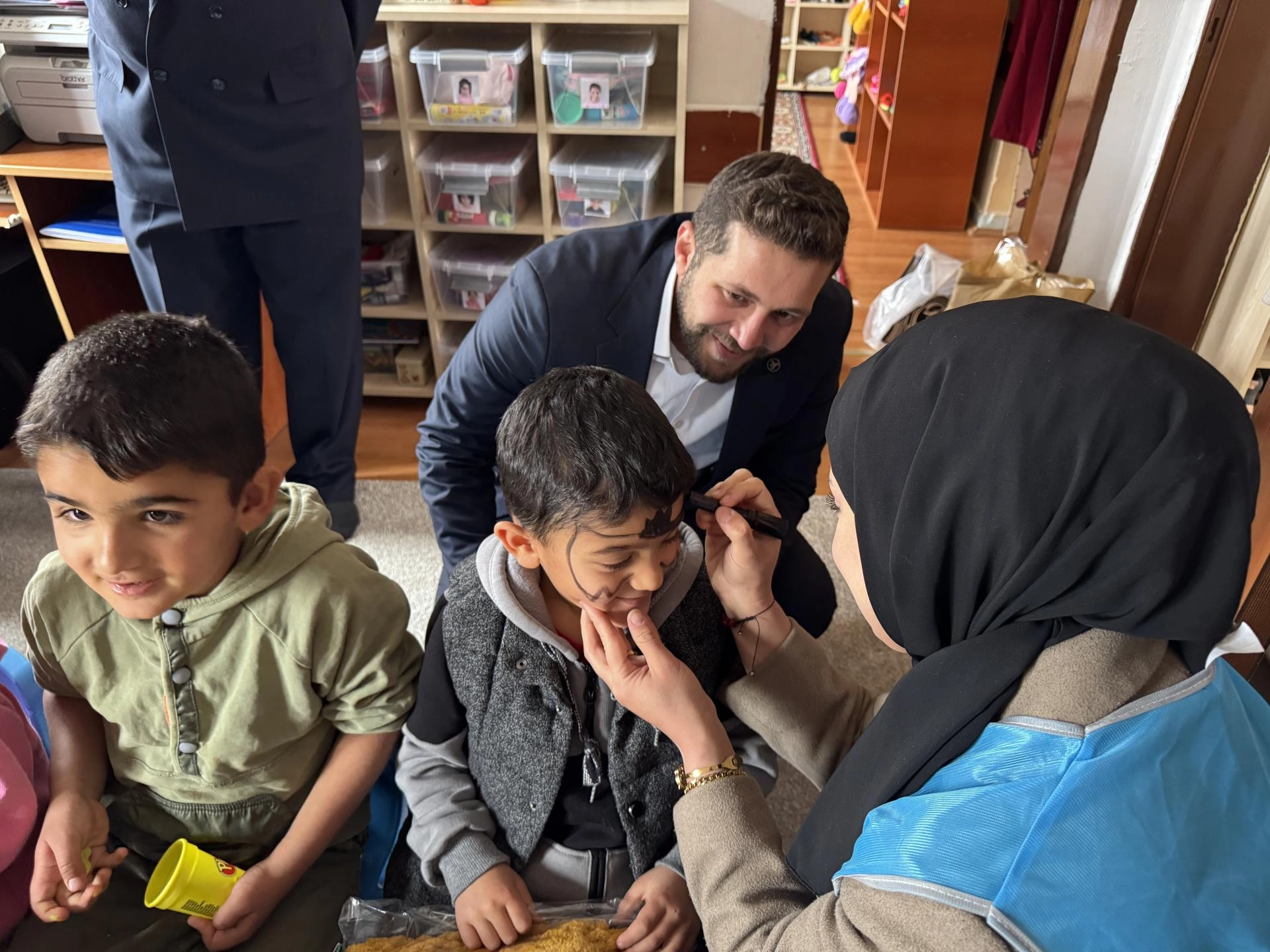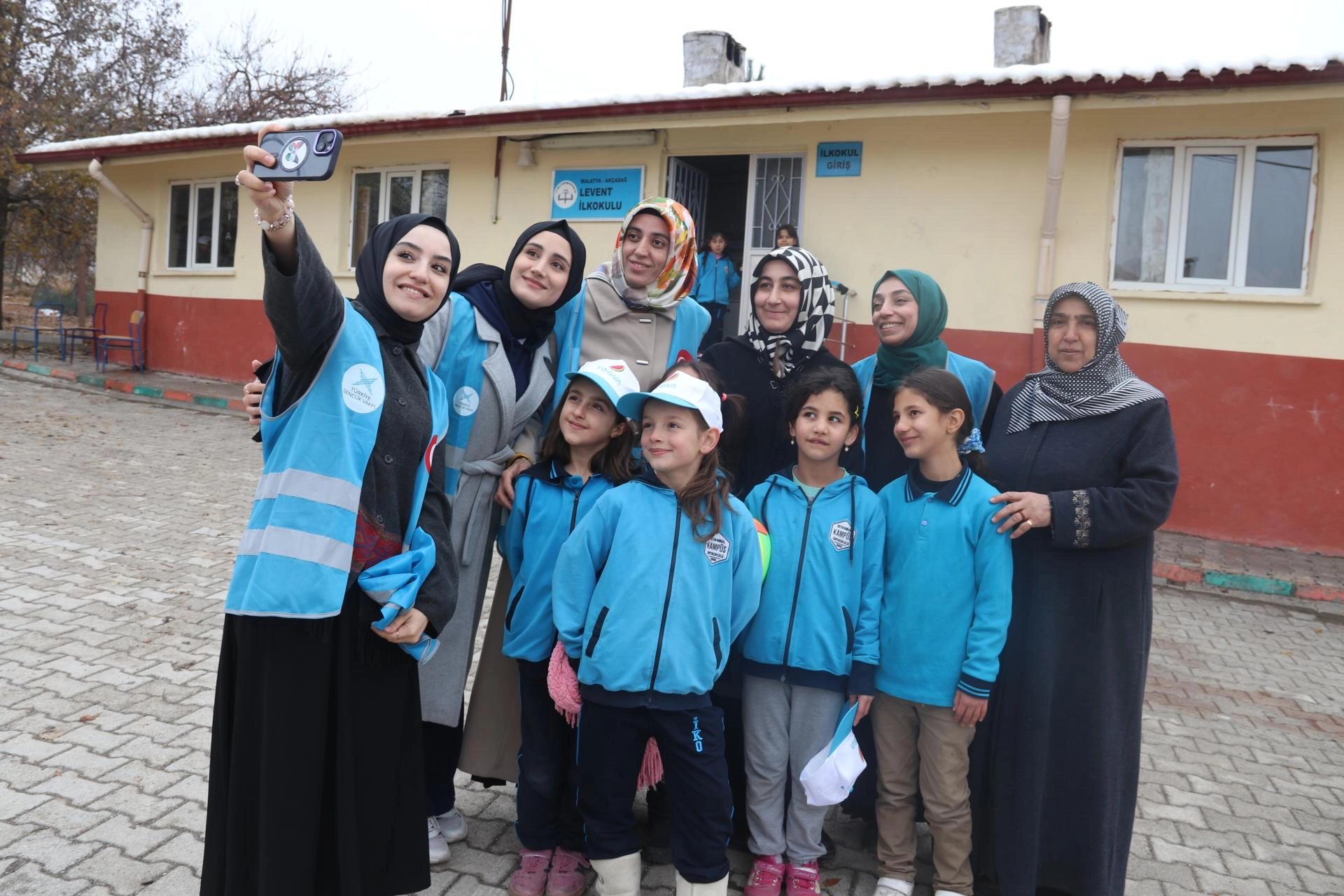 Kent merkezine yaklaşık 55 kilometre mesafedeki Levent İlkokuluna giden kadınlar, çocuklara el emeğiyle hazırladıkları atkıların yanı sıra kırtasiye malzemesi ve kitap dağıttı, ana sınıfı öğrencilerinin yüzlerini boyadı.
