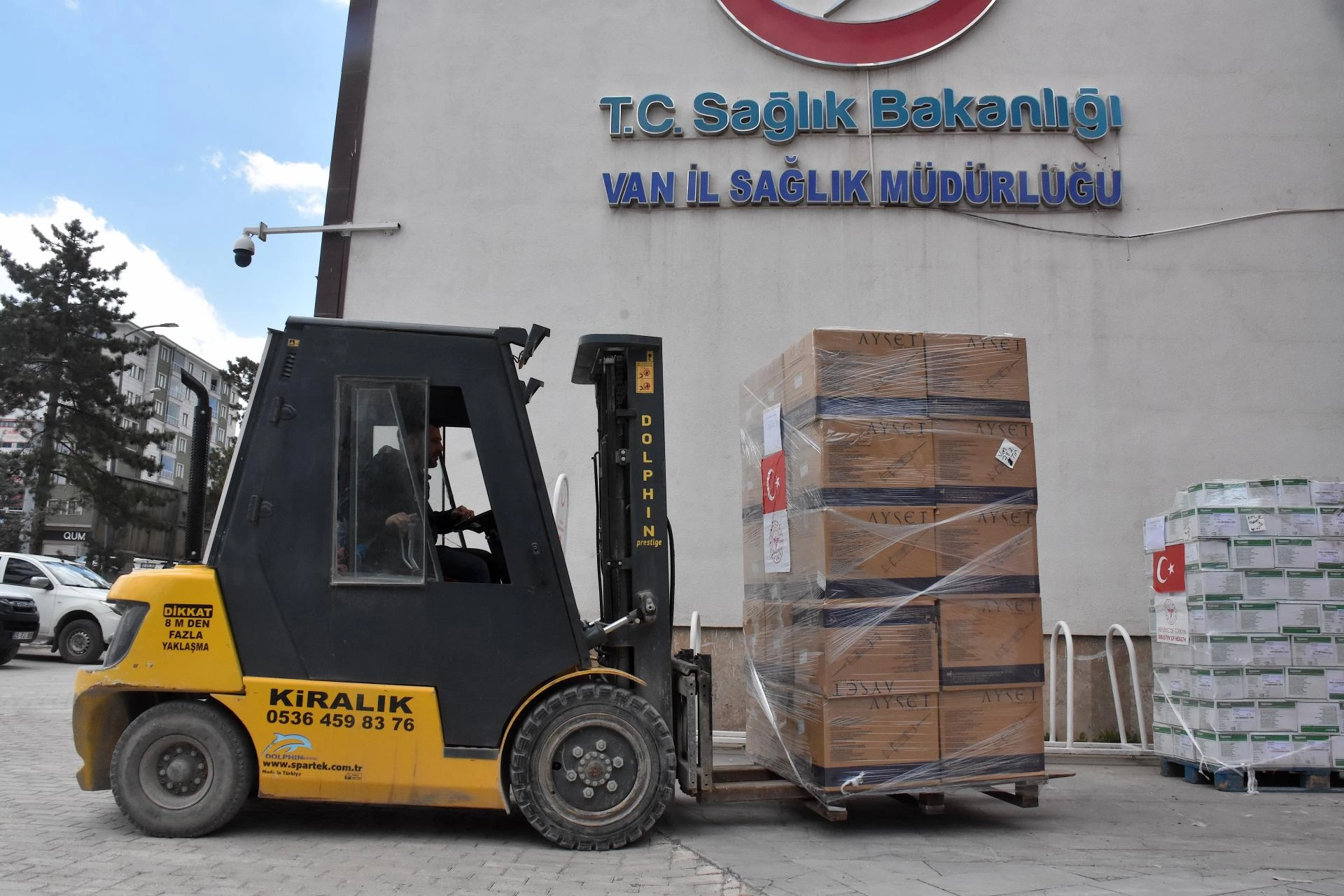 Van'ın yanı sıra farklı illerdeki sağlık kuruluşlarından gönderilen ilaç, serum, sarf malzemeleri, tıbbi cihazlar, sedyeler ve oksijen tüpleri Van İl Sağlık Müdürlüğü'nde toplandı.
