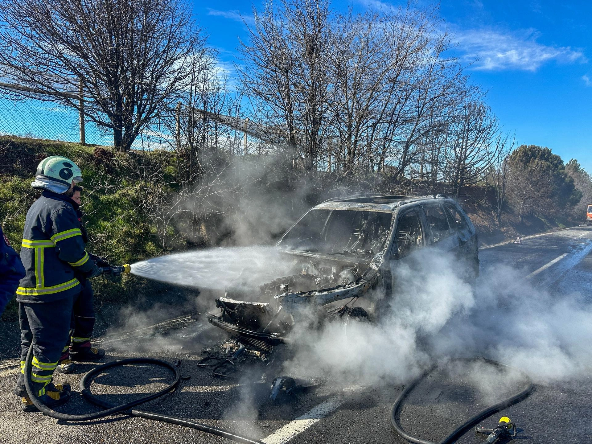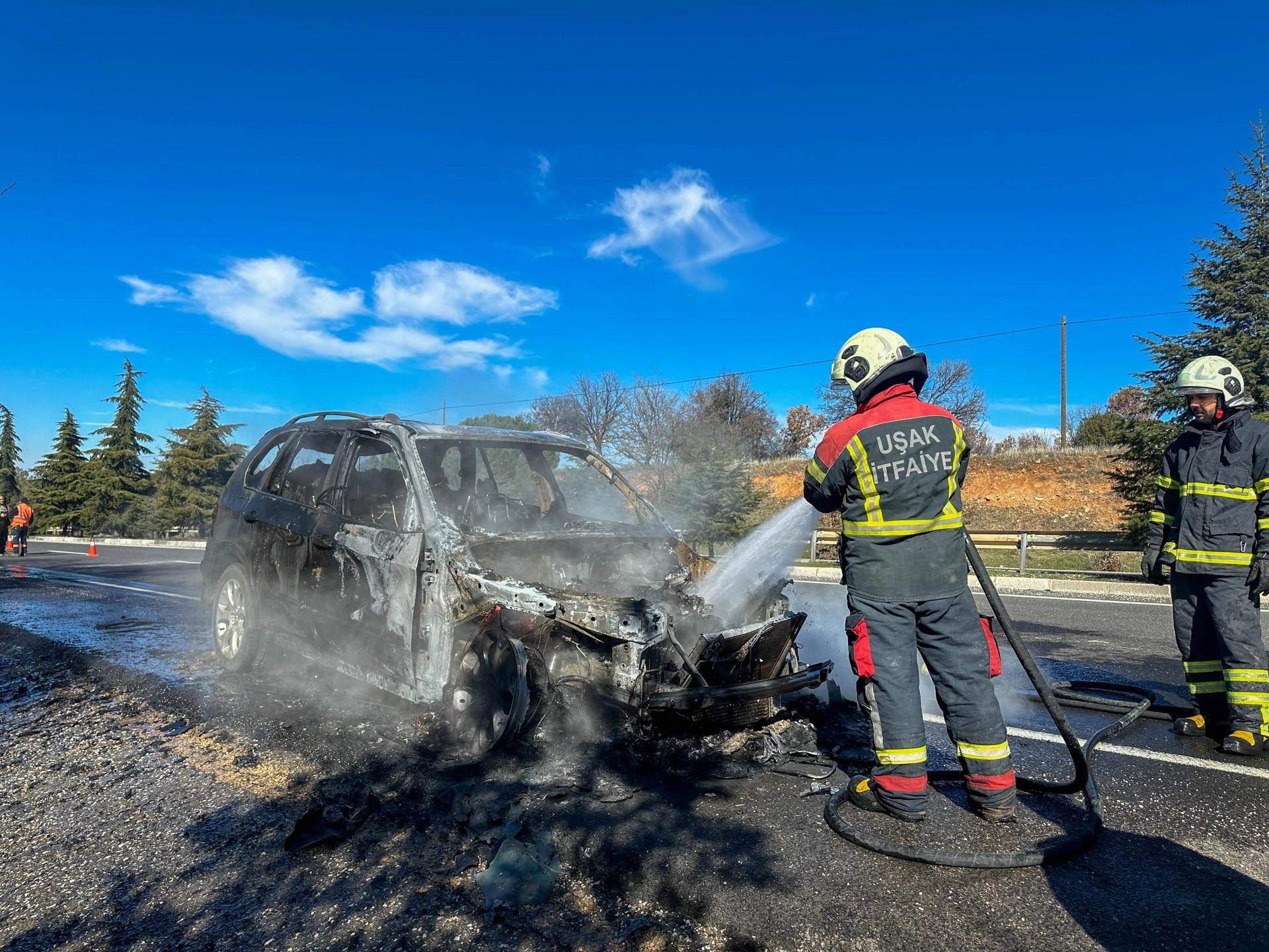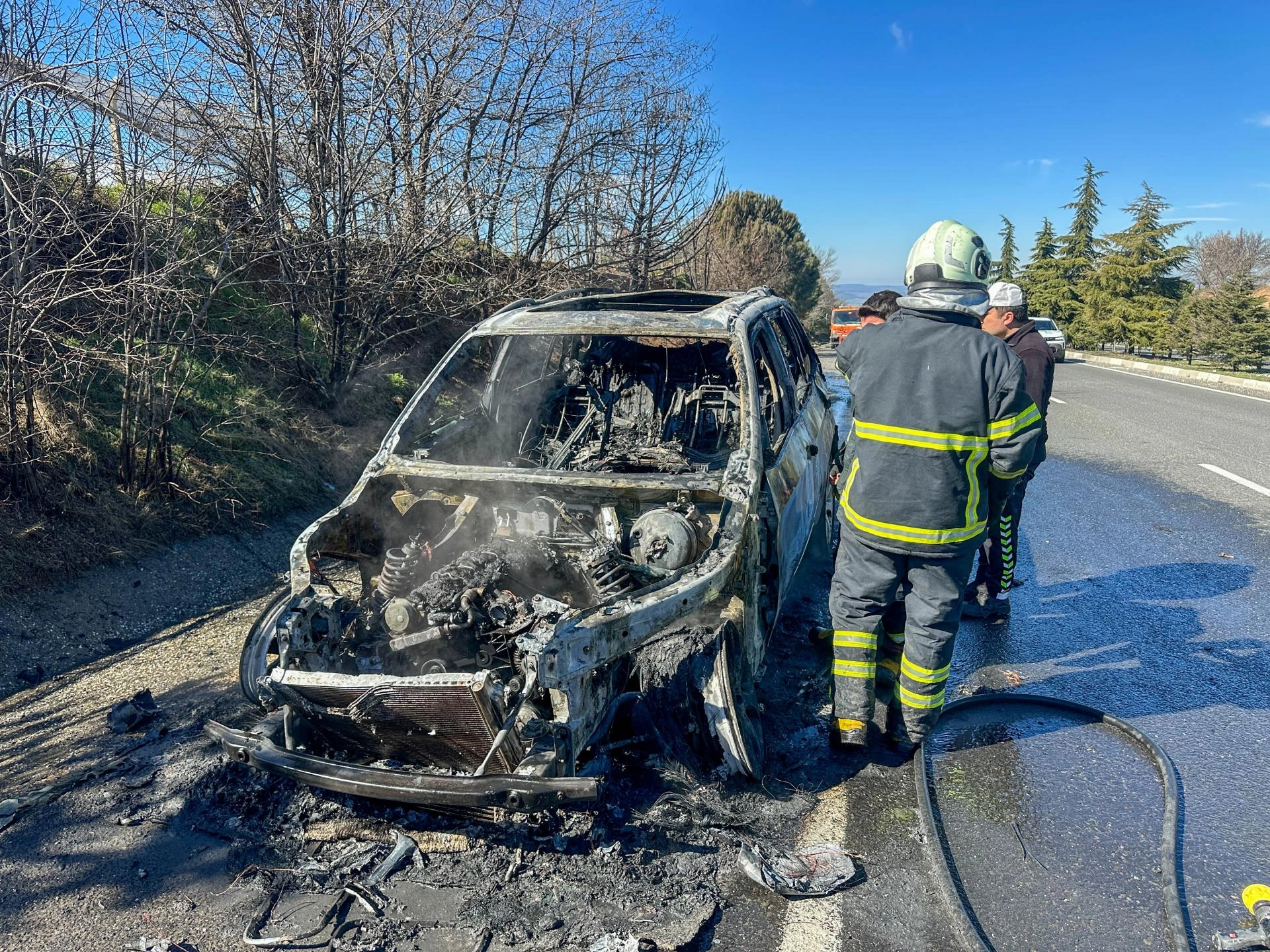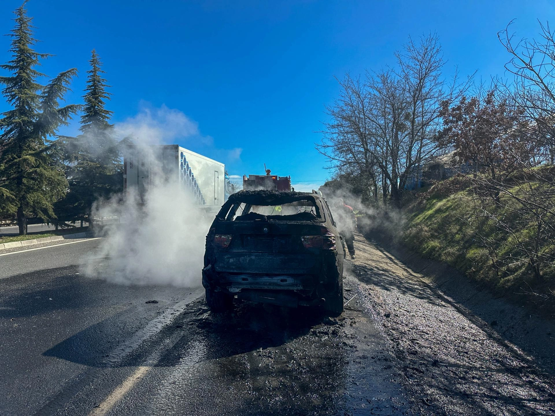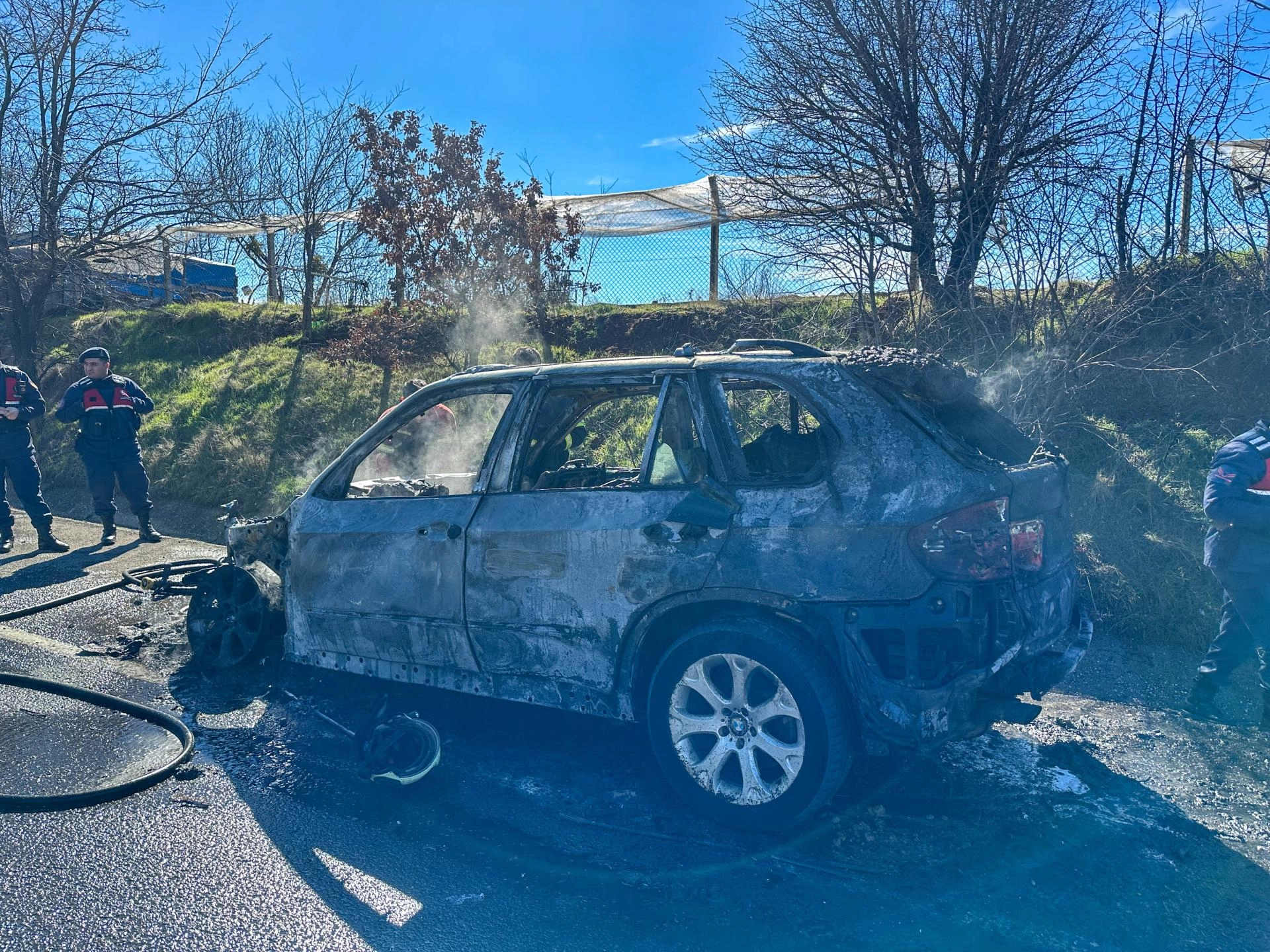 Sürücünün emniyet şeridinde durdurduğu cipin ön kısmından duman yükselmeye başladı. Alevler kısa sürede tüm cipi sardı.