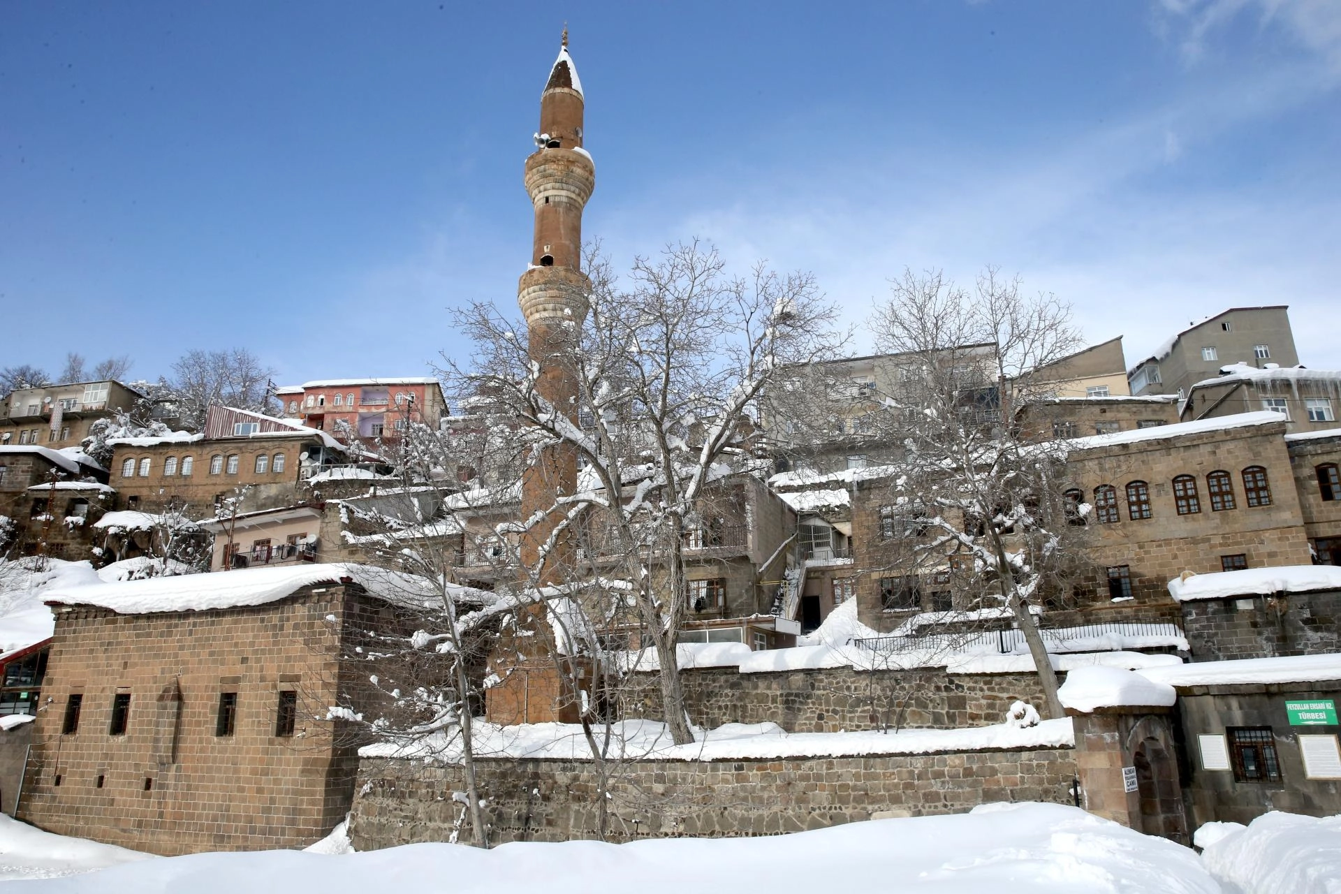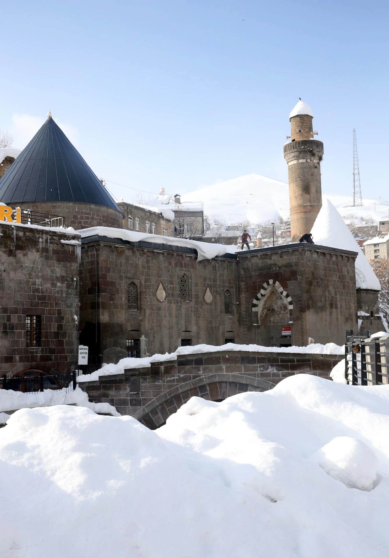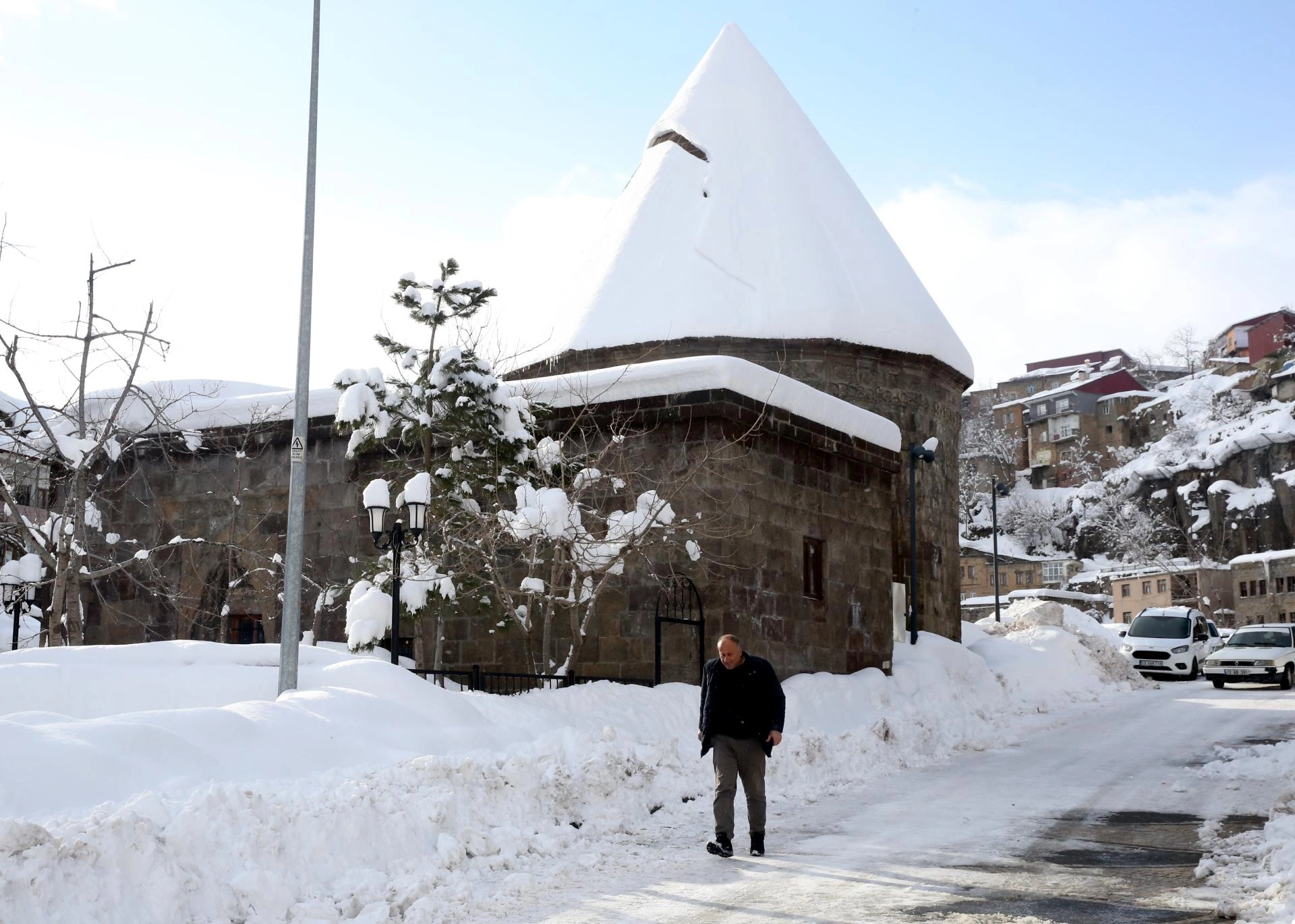 Soğuk havanın etkisini sürdürdüğü kentte, karla kaplanan tarihi yapılar da güzel görüntü oluşturdu.