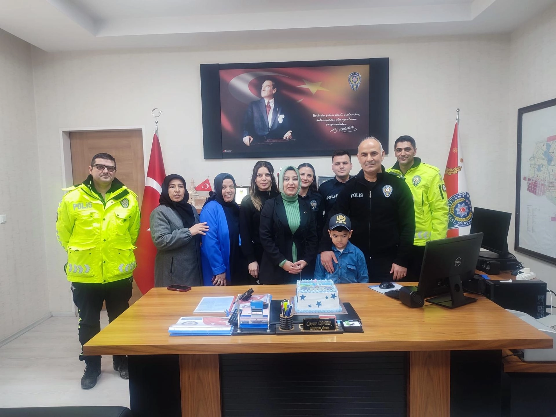 Ailesi ve dernek üyeleriyle müdürlüğe gelen Başer, kendisi için hazırlanan sürpriz doğum günü pastasını kesti, polislerle sohbet edip telsizden anons geçti.
