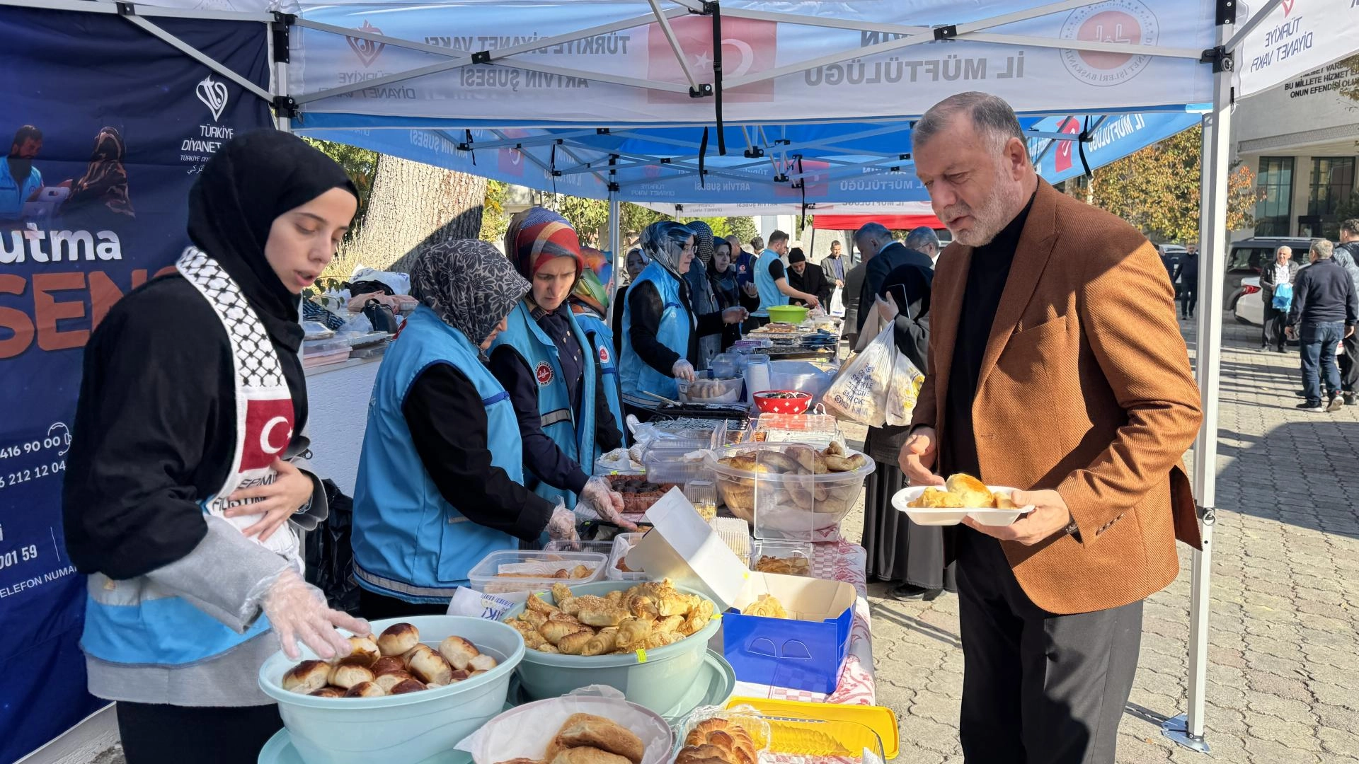 Valilik önünde bulunan Milli İrade Meydanı'ndaki çarşıda, TDV gönüllülerince hazırlanan yiyecek, içecek ve hediyelik eşyalar, Gazze yararına satışa sunuldu.