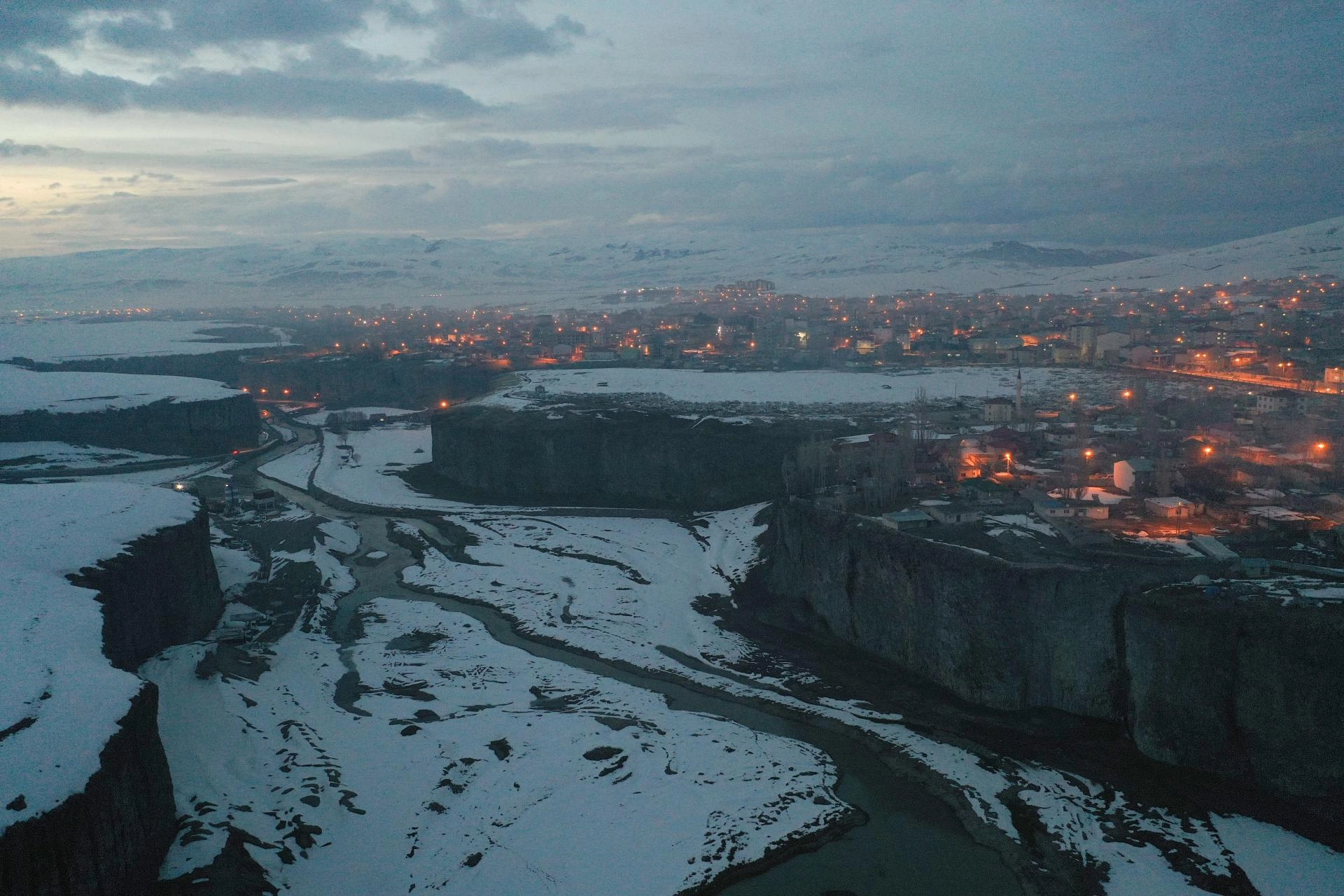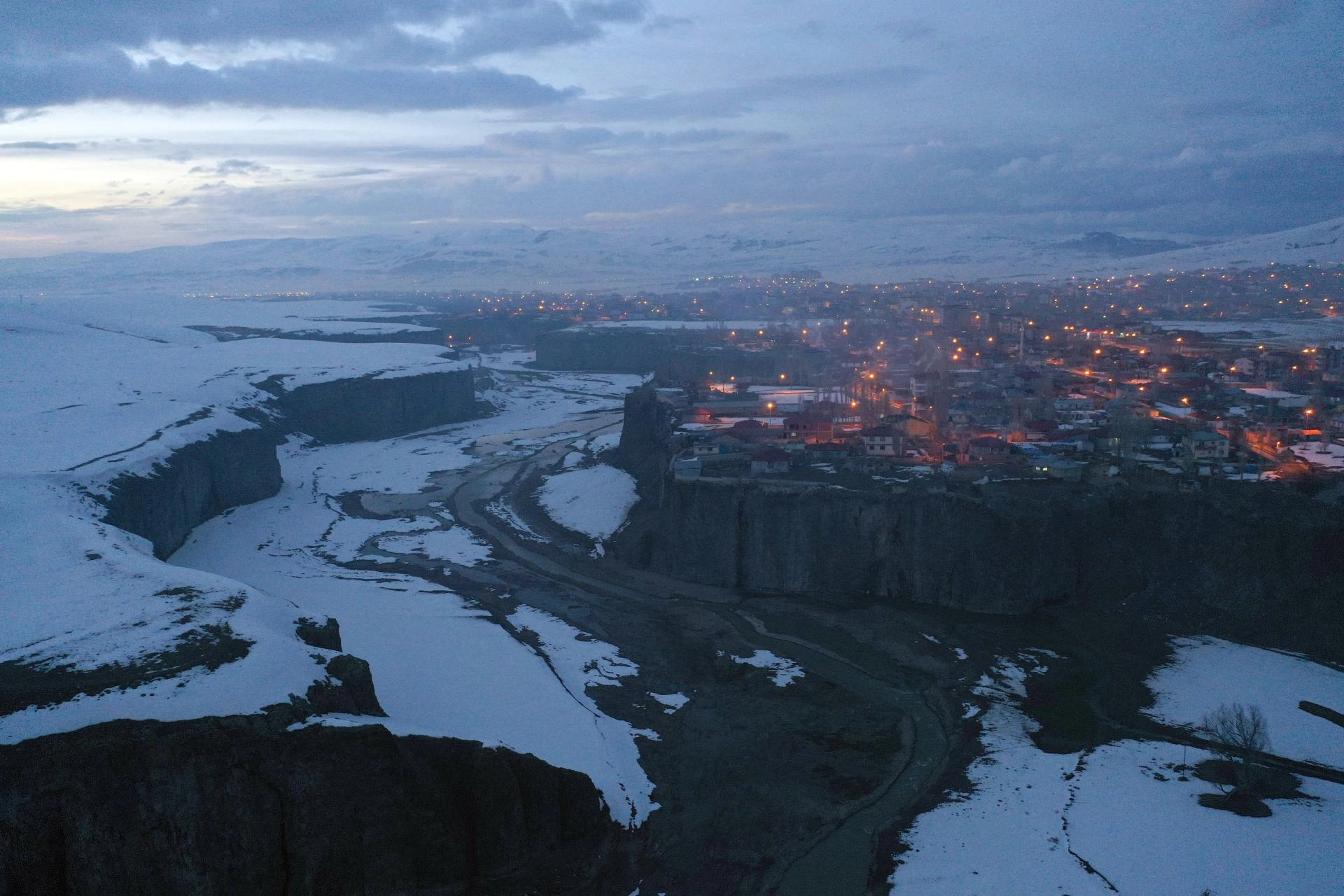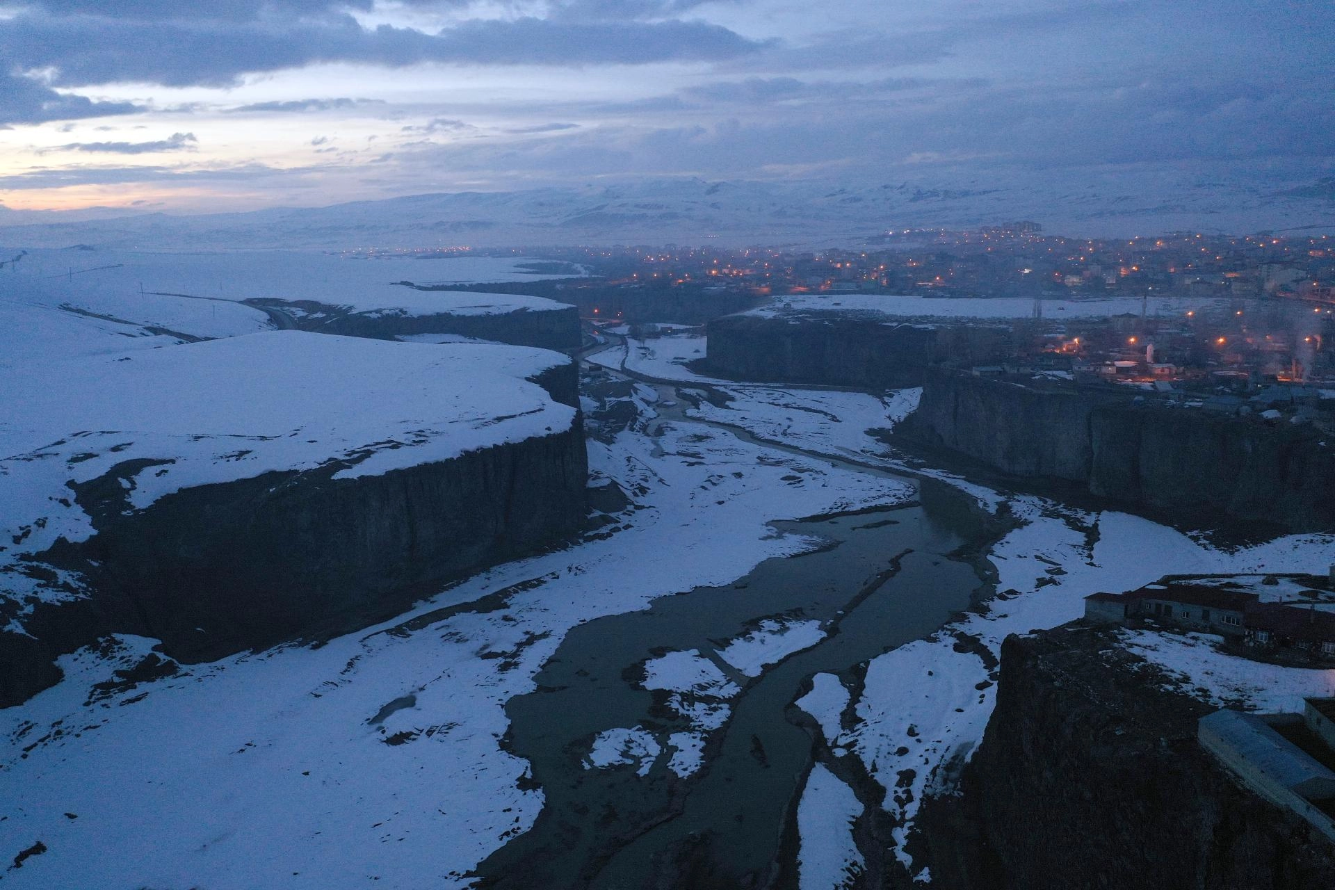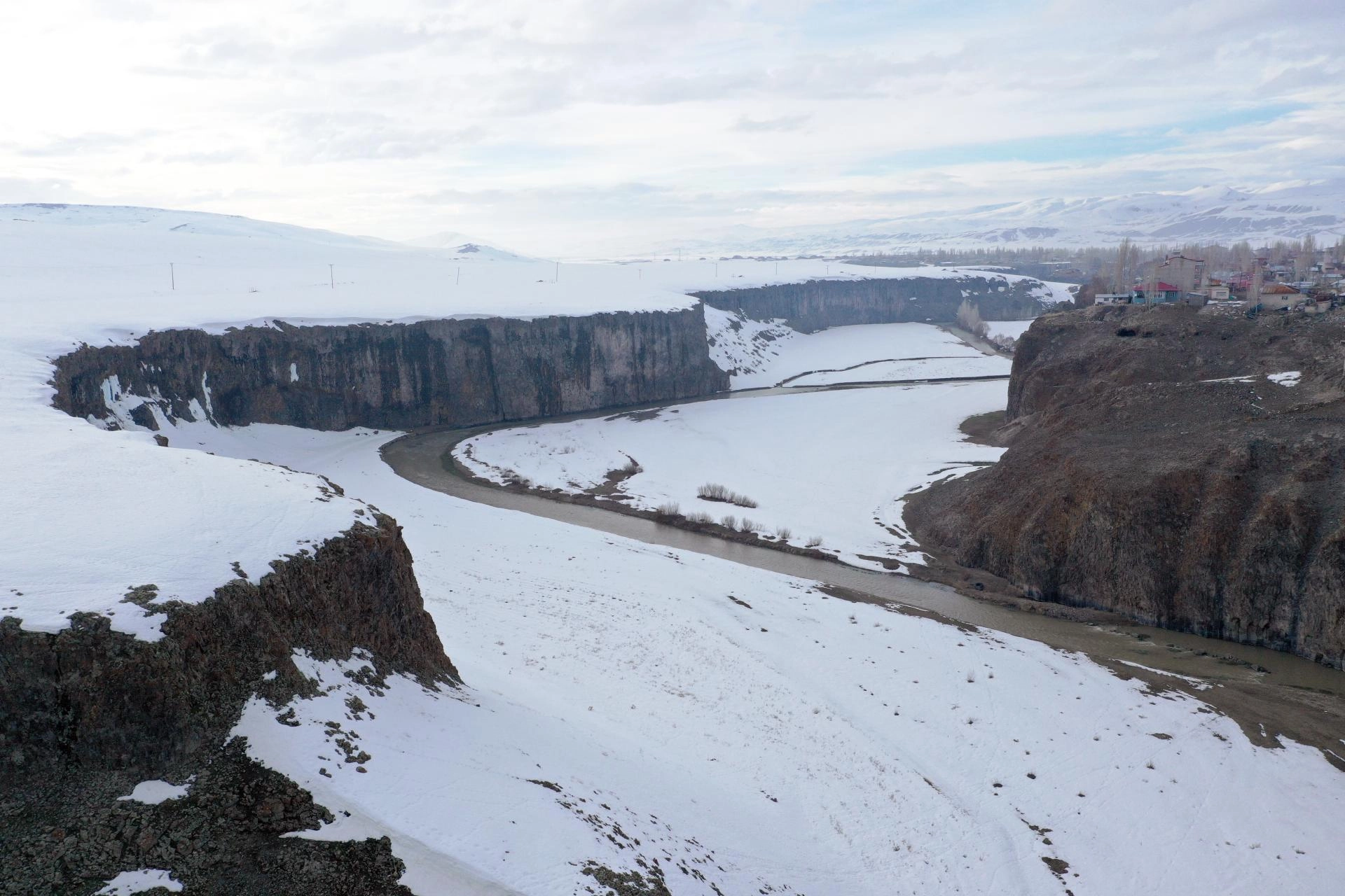 AĞRI (AA) - Ağrı'nın Diyadin ilçesinde bahar mevsiminde de beyaz örtüyle kaplanan doğa harikası Murat Kanyonu, gece ve gündüz dronla görüntülendi.