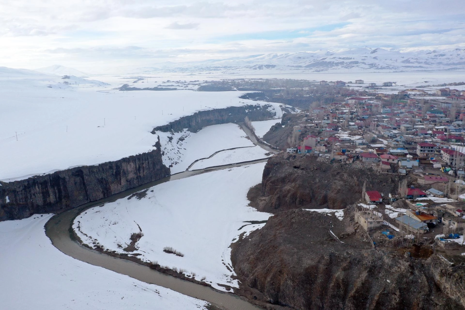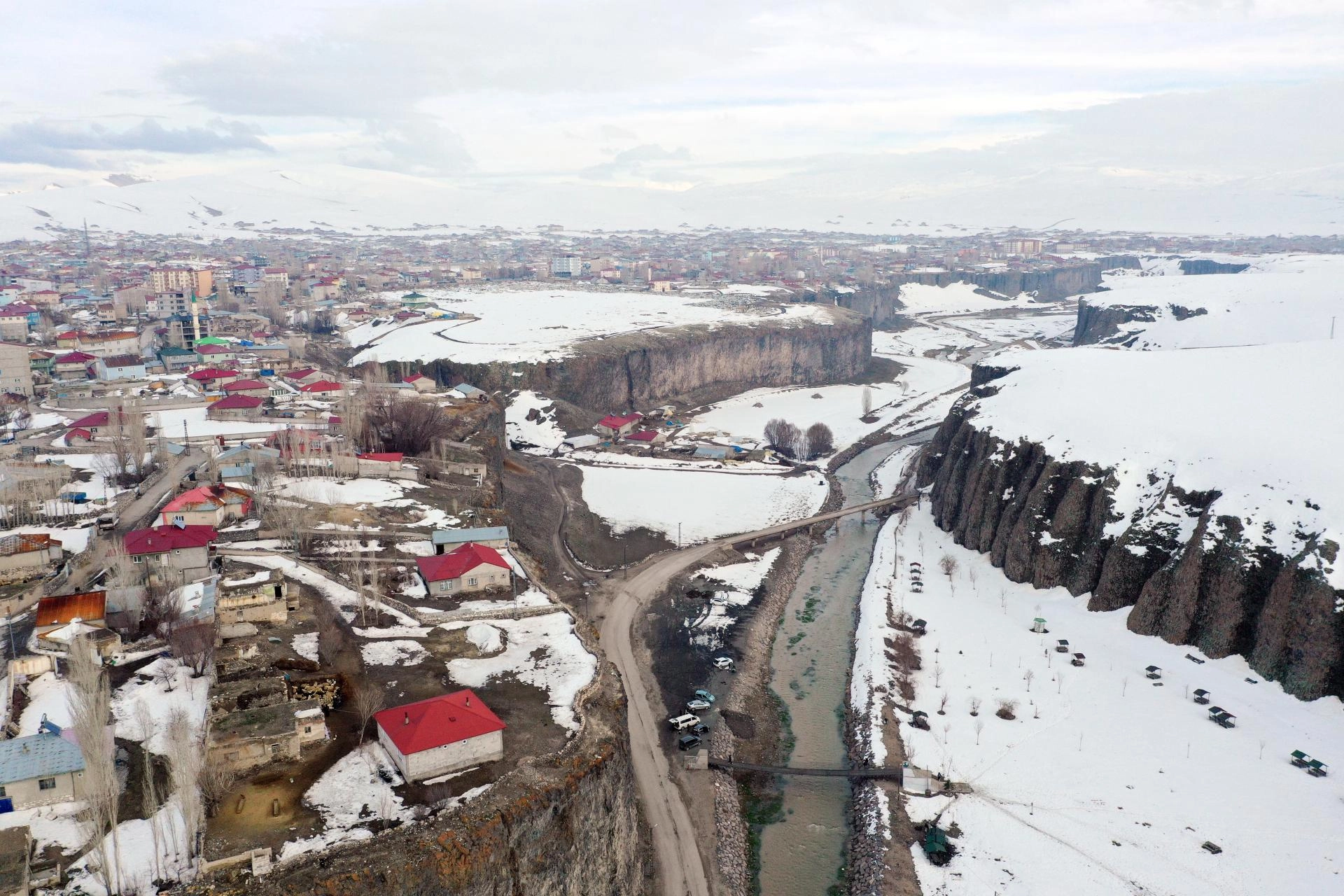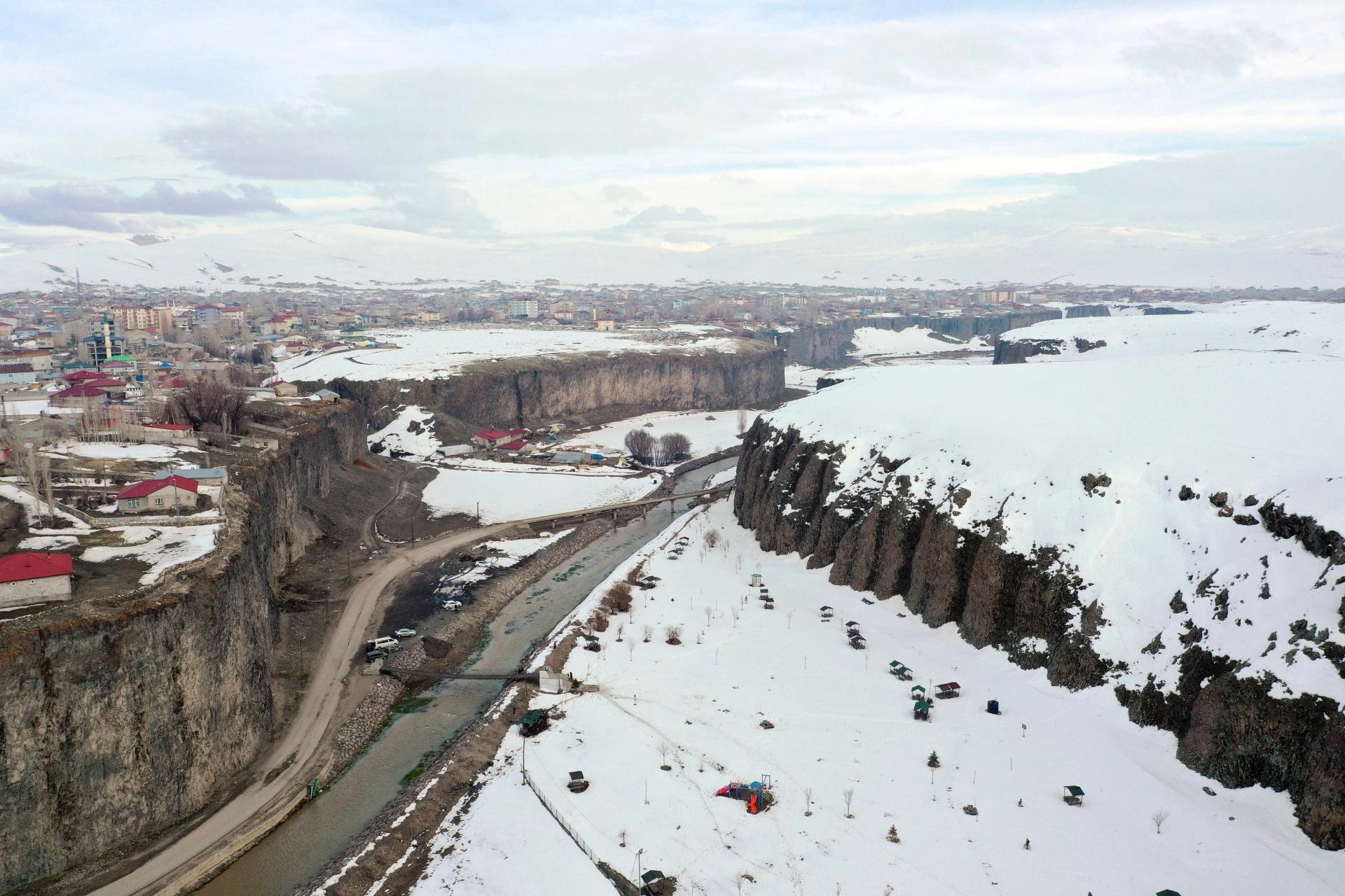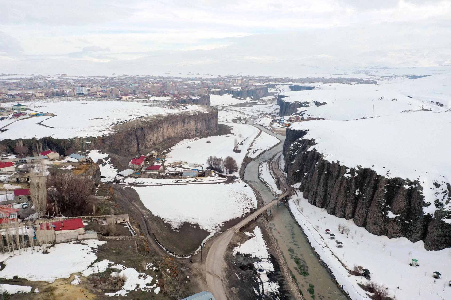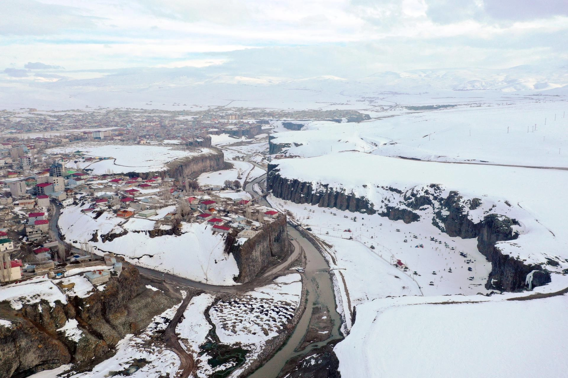 AĞRI (AA) - Ağrı'nın Diyadin ilçesinde bahar mevsiminde de beyaz örtüyle kaplanan doğa harikası Murat Kanyonu, gece ve gündüz dronla görüntülendi.