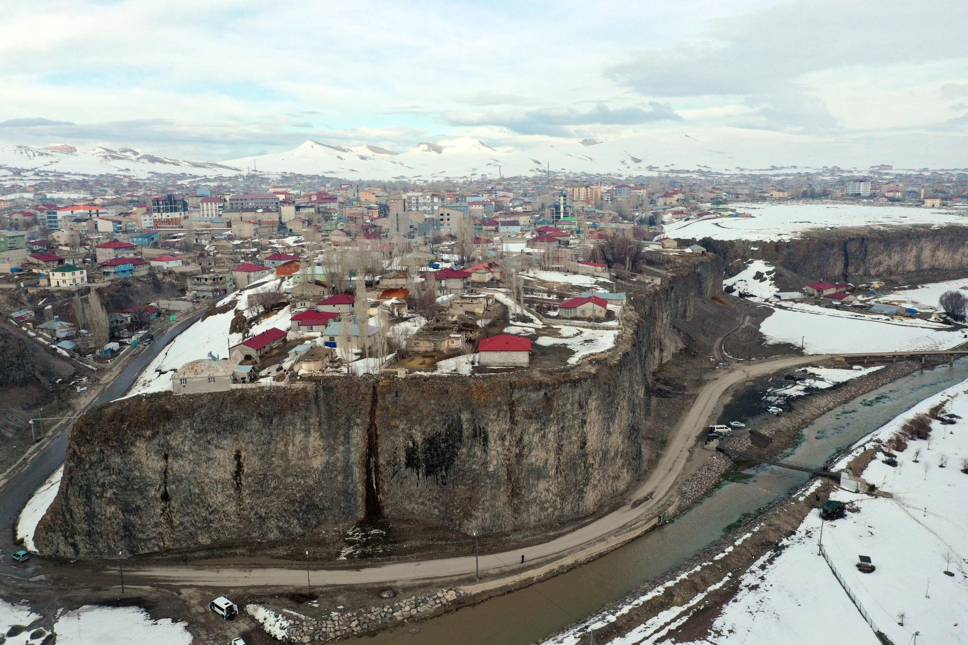 Sarp kayalıklar ve kayalıkların üzerinde evlerin bulunduğu kanyon, hem gece hem de gündüz dronla kayıt altına alındı.