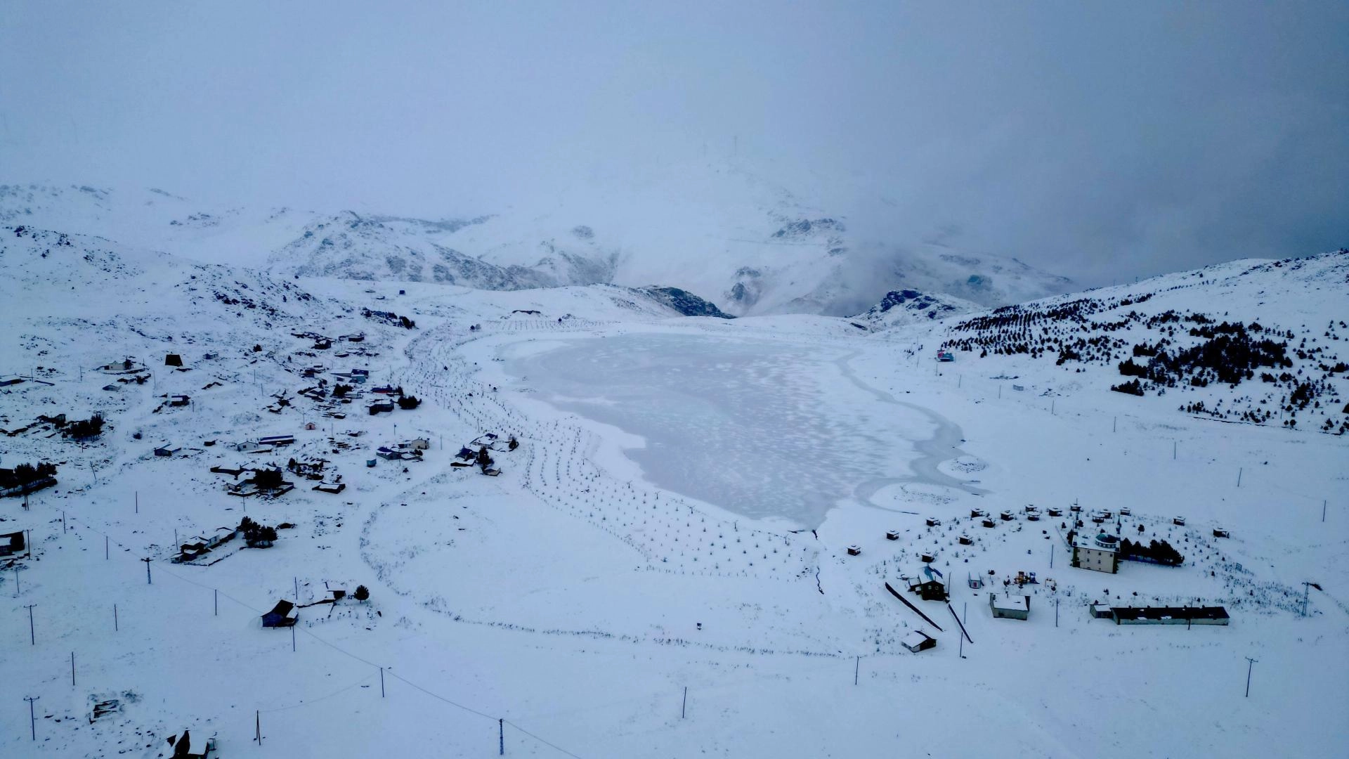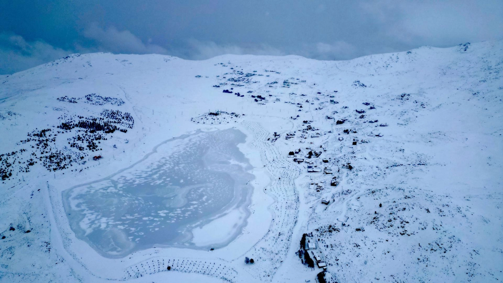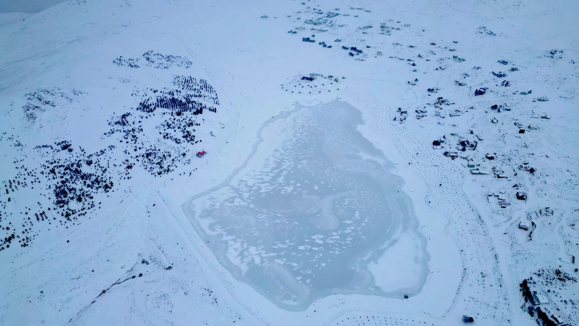 Yüzeyi buz tutan gölet ve çevresindeki karla kaplı dağlar, havadan görüntülendi.