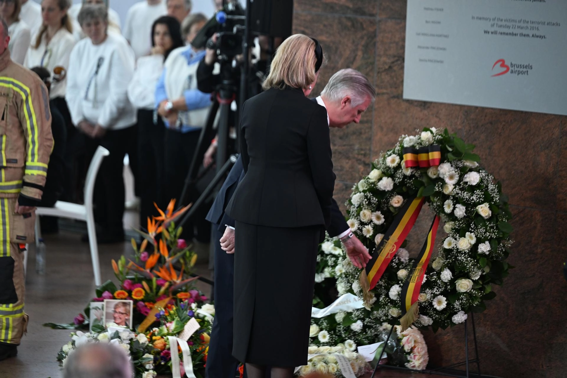 Brüksel Havalimanı'ndaki törene, Belçika Kralı Philippe, Kraliçe Mathilde, Belçika Başbakanı Bart De Wever, Belçika Savunma Bakanı Theo Francken ve saldırılarda hayatını kaybedenlerin yakınları katıldı.