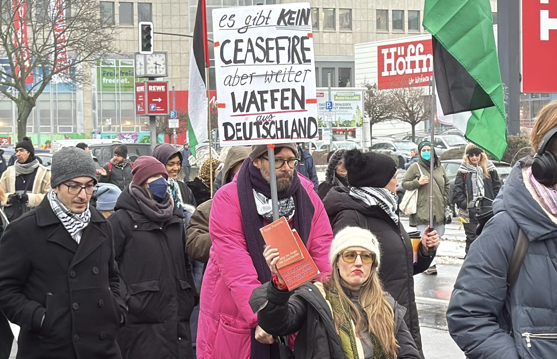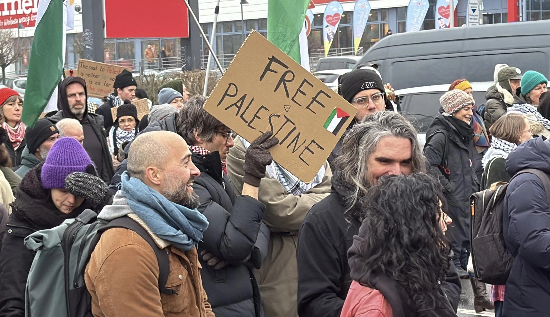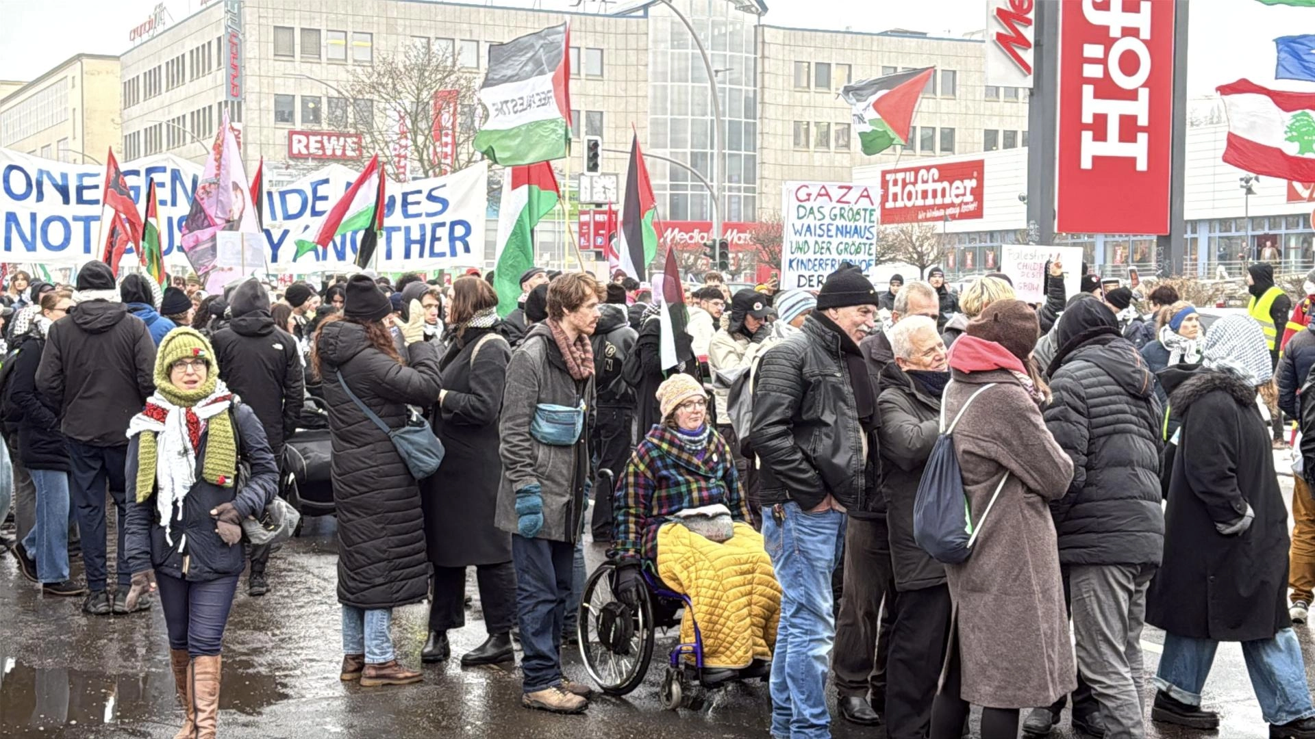 Göstericiler, Filistin bayrakları ile “Soykırımı durdurun”, "Filistinlilerin tek suçu var olmaktır", “Gazze, dünyanın en büyük yetimhanesi”, “Filistin’e özgürlük”, “Ateşkes yok ancak Almanya’dan silahlar sağlanmaya devam ediyor”, “Gazze, ulusun onurudur” ve “Filistinli çocuklar büyümeyi hak ediyor” yazılı döviz ve pankartlar taşıdı.
