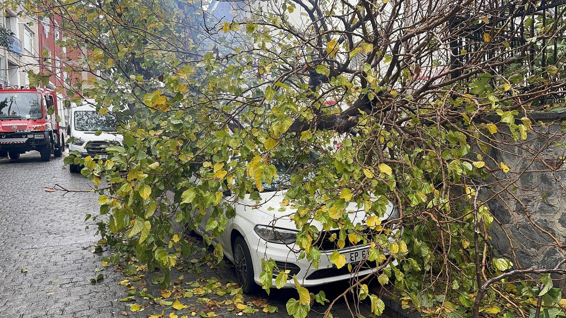 Keçeci Piri Mahallesi Okçular Sokak'ta yağışın ardından 34 EP 6183 plakalı otomobilin üzerine ağaç devrildi.