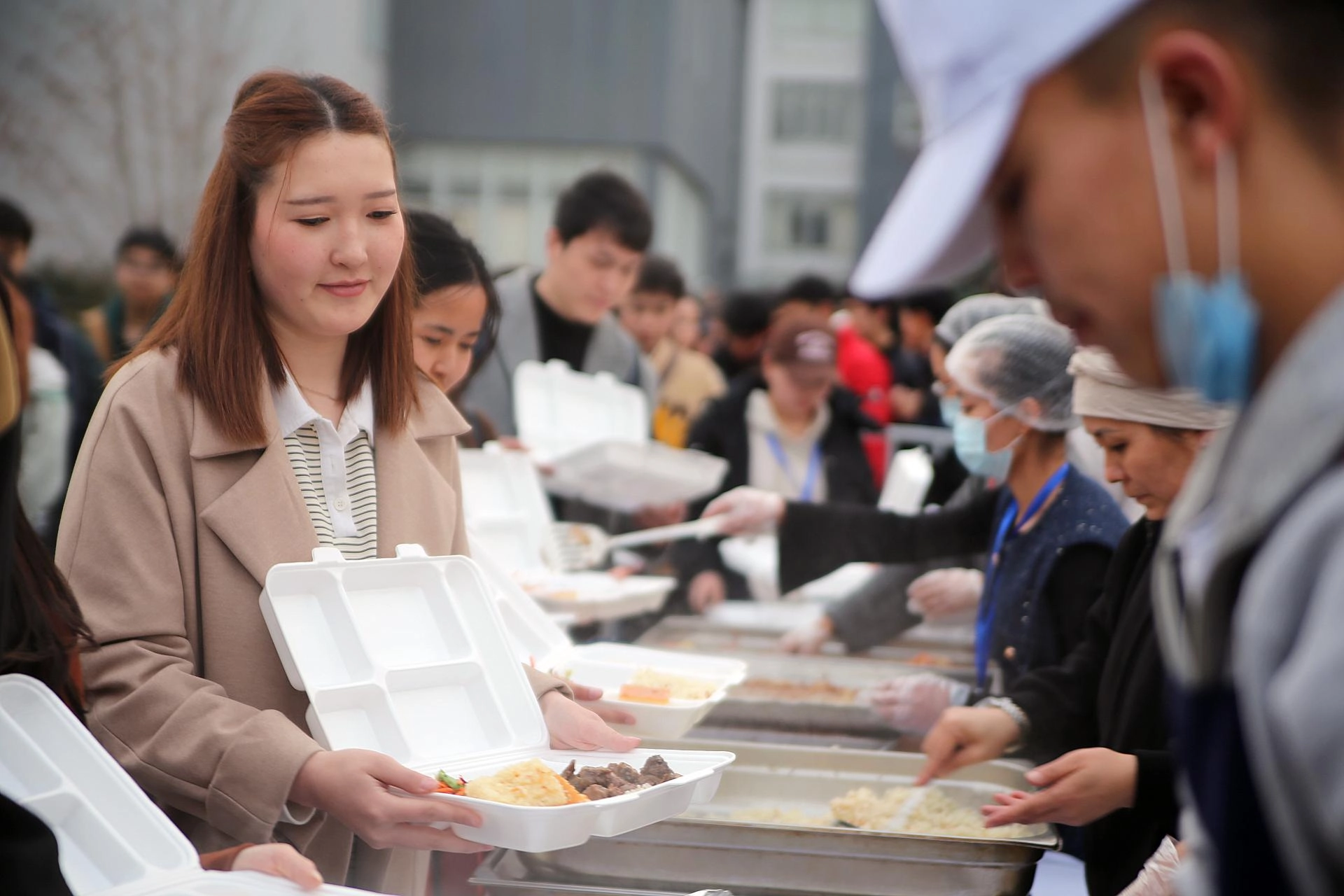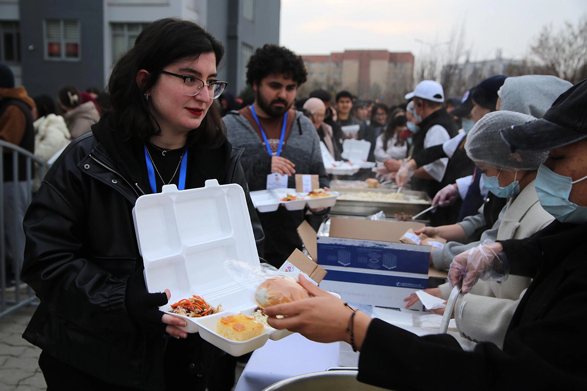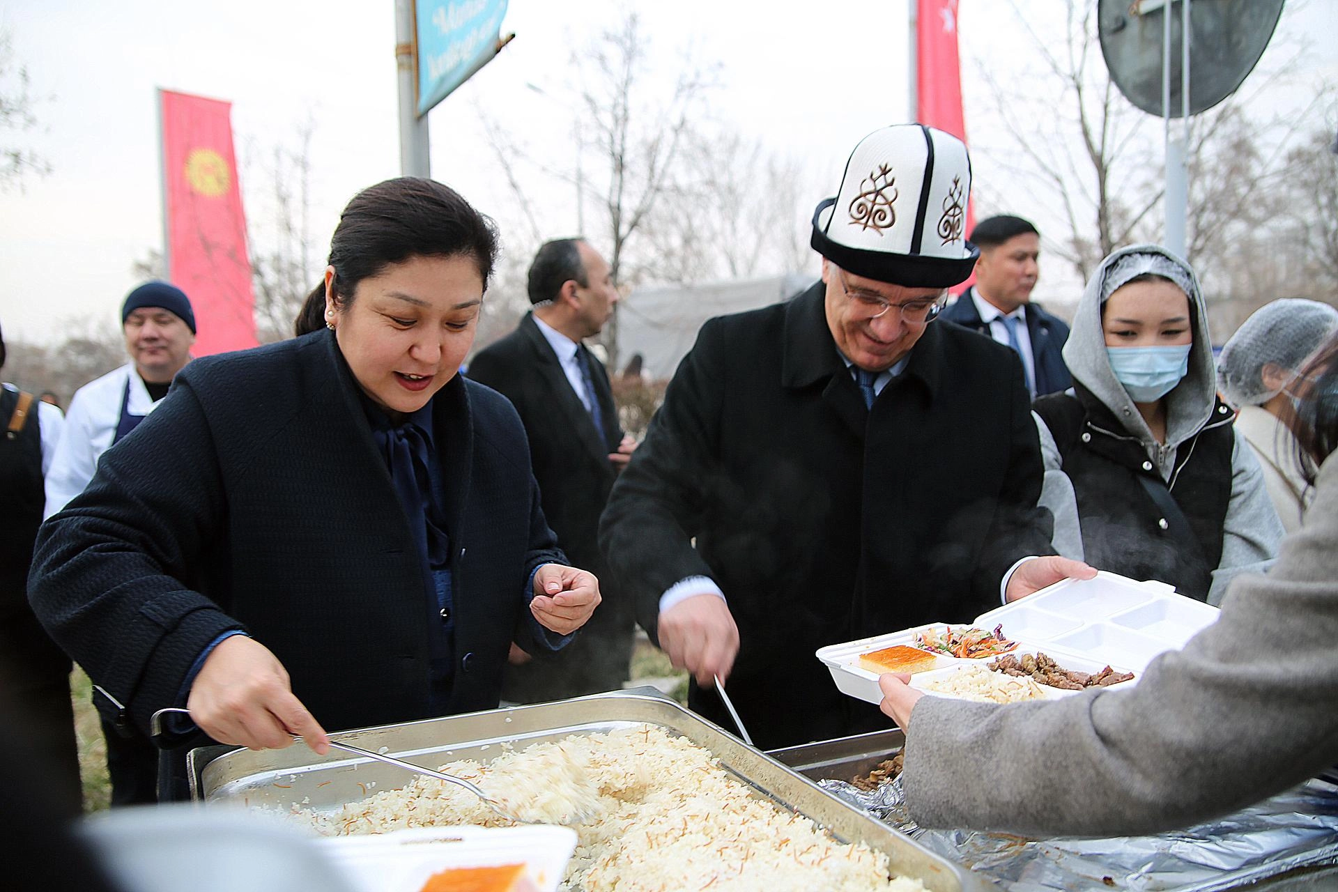 Ceylan ile İbrayev, Kırgızistan Bilim, Yüksek Öğretim ve İnovasyon Bakanı Gülzat İsamatova ve Türkiye'nin Bişkek Büyükelçisi Mekin Mustafa Kemal Ökem ile yemek dağıtım alanına geçerek katılımcıların tabldotlarına bizzat yemek koydu.