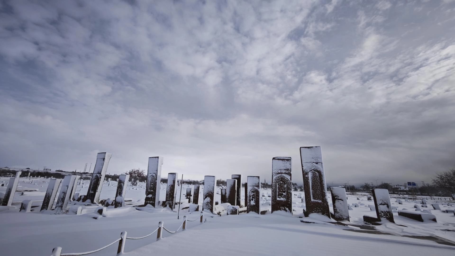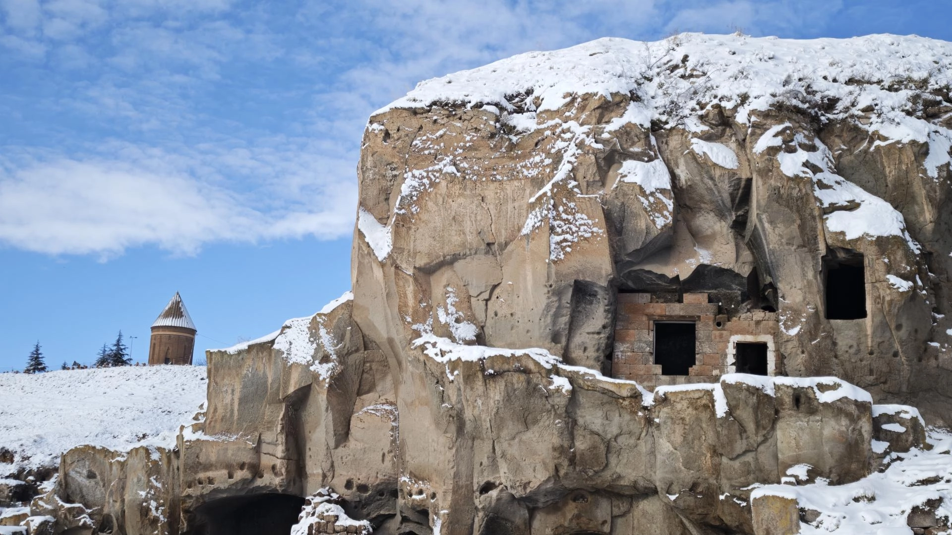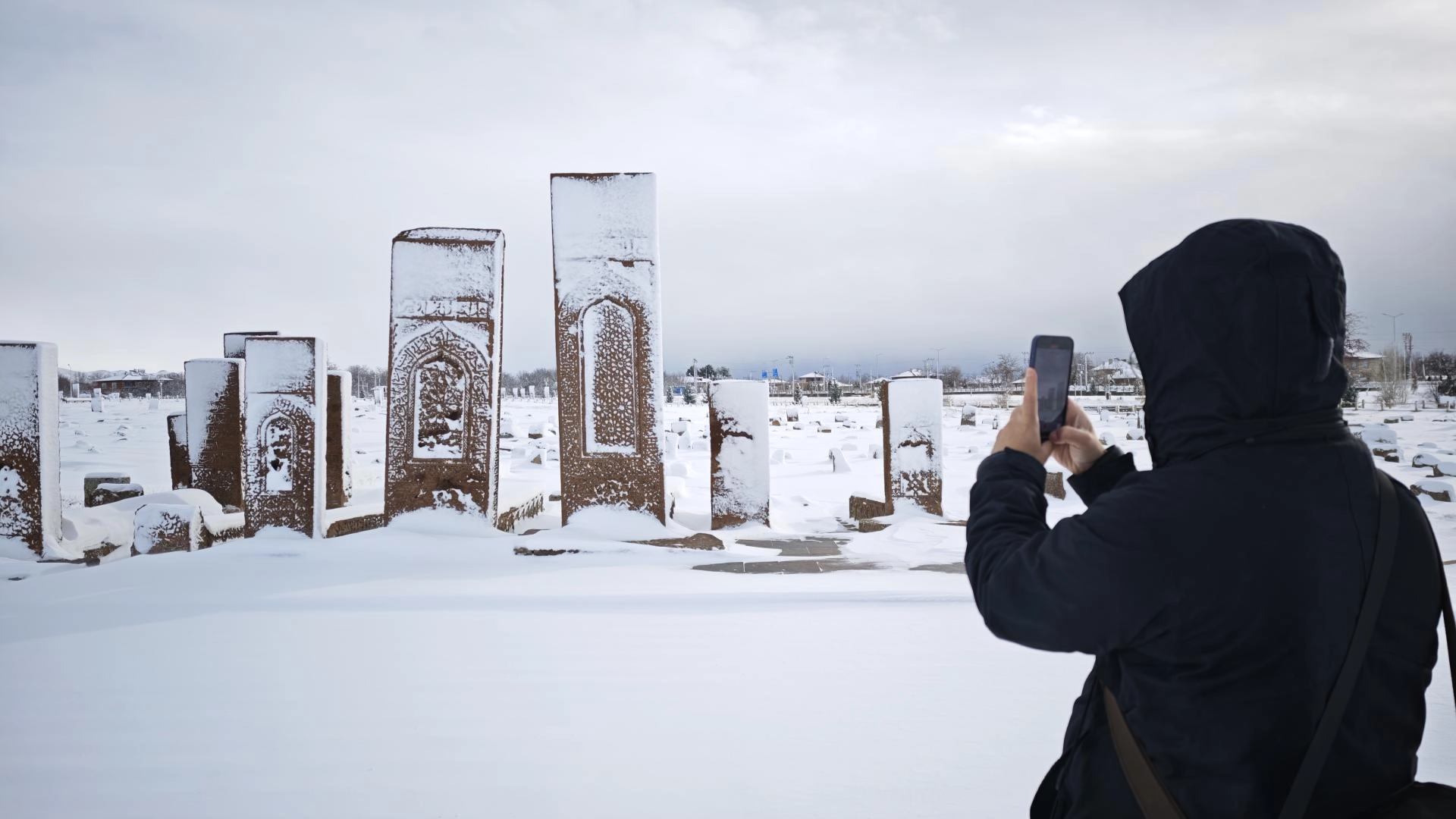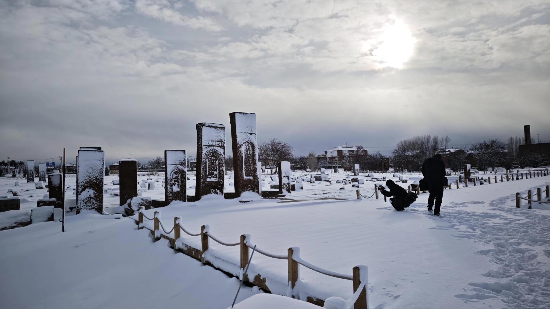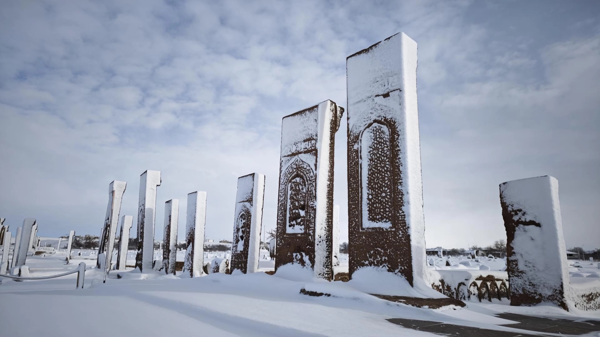 UNESCO Dünya Kültür Mirası Geçici Listesi'nde yer alan dünyanın en büyük Türk İslam Mezarlığından biri olan Selçuklu Meydan Mezarlığı, kümbetler, mağara evler ve Bayındır Köprüsü karla kaplandı.