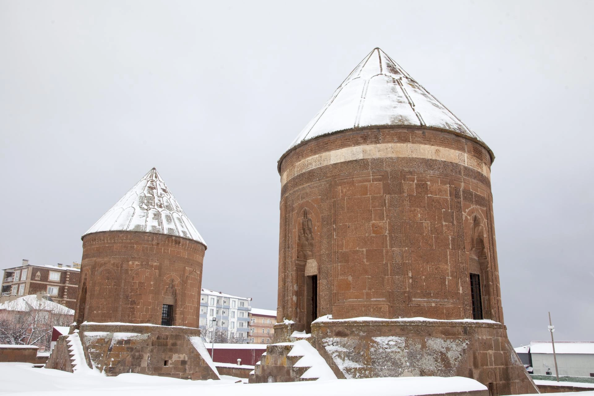 BİTLİS (AA) - Bitlis'te etkili olan kar yağışının ardından Ahlat ilçesindeki tarihi yapılar beyaza büründü.