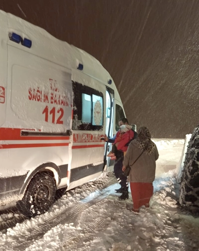Olumsuz hava koşullarına rağmen yol açma çalışması yürüten ekipler, hastayı köyünden alarak Yamaç köyünde bekleyen 112 Acil Sağlık ekiplerine teslim etti.