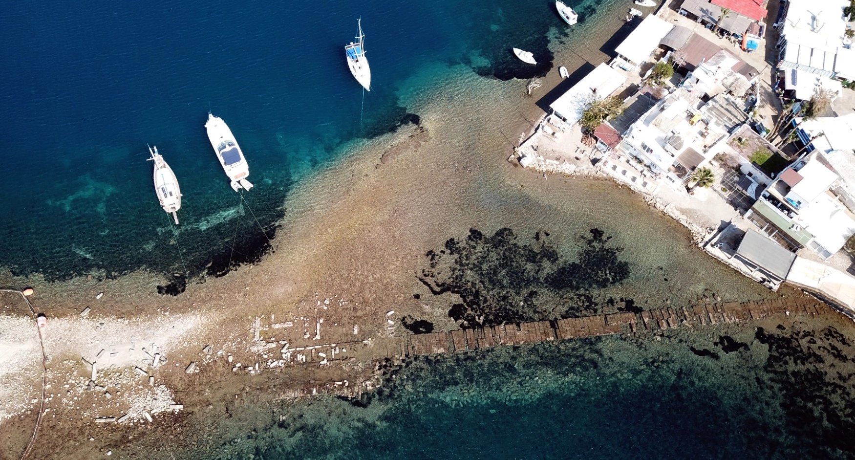 MUĞLA (AA) - Muğla'nın Bodrum ilçesinde, Tavşan Adası'na uzanan tarihi sur kalıntıları denizin çekilmesiyle ortaya çıktı.