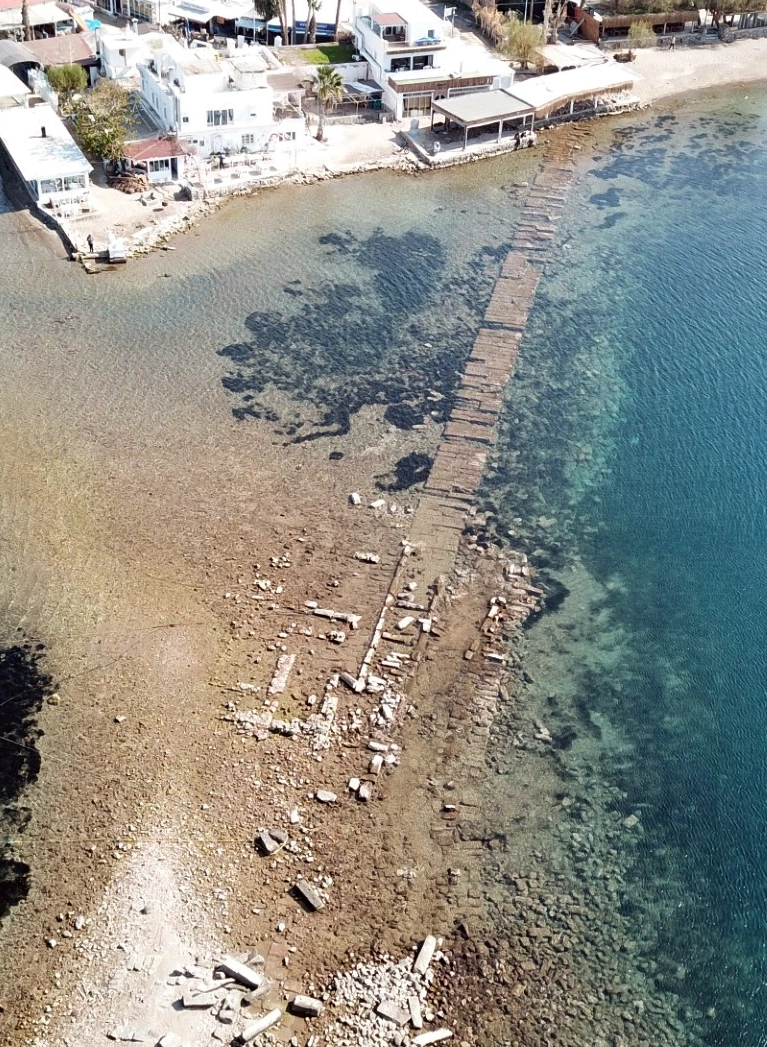 Deniz suyunun çekilmesiyle Milattan Önce (MÖ) 4. yüzyılda yapıldığı tahmin edilen Mydos (Tavşan) Adası'na kadar uzanan şehir surları ortaya çıkıyor.